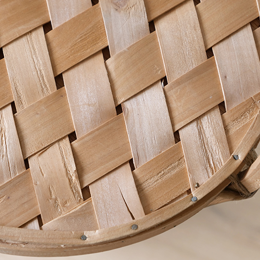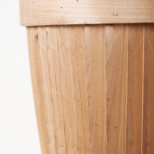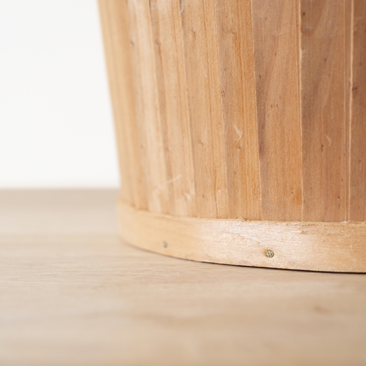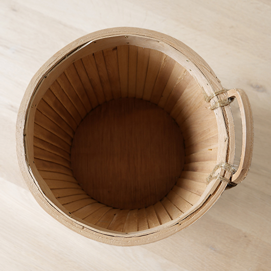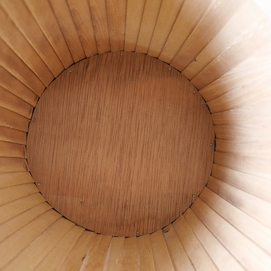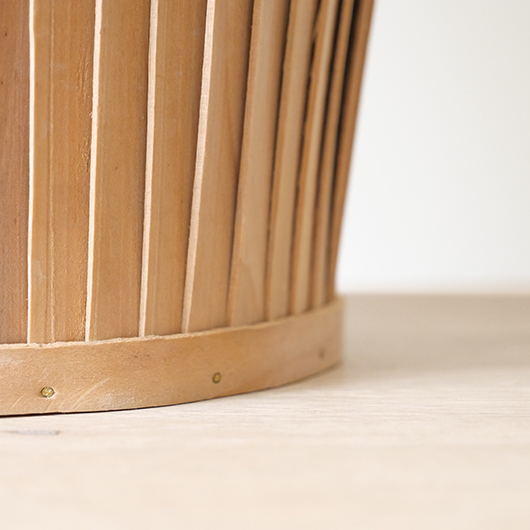 スウェーデン・ダーラナ地方で生まれた伝統手工芸品であるヴィンテージ バスケットSpånkorg(スポーンコリ)。 とても雰囲気のある蓋部分はダイヤ型に編まれたもので、市松模様に編まれた物が多い中で職人独自のこだわりやデザイン性を感じます。そしてボディ部分はへぎ板を編まずに少しずつ重ねながらスライドさせて円筒形を作るという珍しいデザインです。側面にはU字のハンドルが組まれ、フックなどに掛けられる仕様です。華やかさを感じる蓋とすっきりとしたボディの絶妙なデザインが美しい一台です。 Spånkorg(スポーンコリ)とは北欧のパイン材を職人がナイフで薄く削いで作ったへぎ板(=Spån)を編んだバスケット(=korg )のこと。経年によって飴色に変化した木肌は、新品の白みの強いのものとは同じ樹種と思えないほどです。味わい深く経年変化した木肌からは、年輪に合わせてナイフで薄く削いでゆく職人の手仕事ゆえの荒々しさも感じます。 小ぶりなため卓上においても良いサイズ感です。キッチンカウンターに置いてグロッサリーを入れておいたり、玄関先でフックに引っ掛けて愛犬のお散歩グッズを収納したりと、楽しい日常風景が広がります。 丁寧なメンテナンスを行いまして、綺麗な状態です。若干のスレやキレなどの箇所がございますが、気にならない程度かと思います。そのほか細部の状態などは、画像をご参照ください。