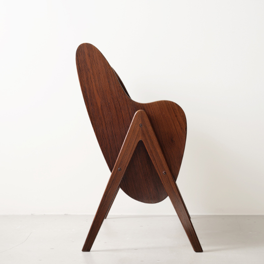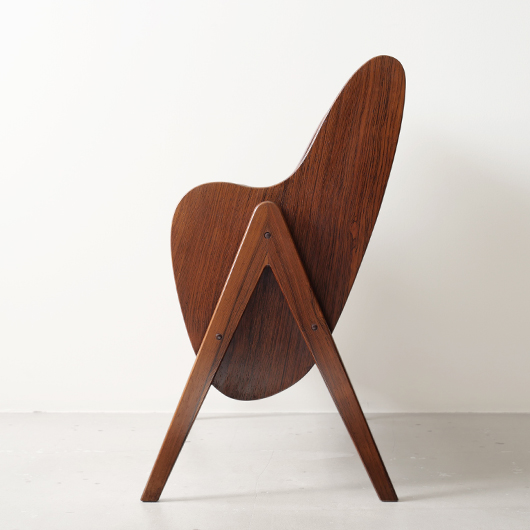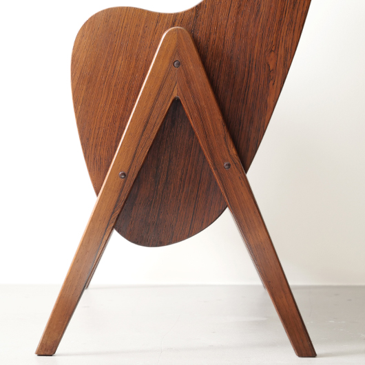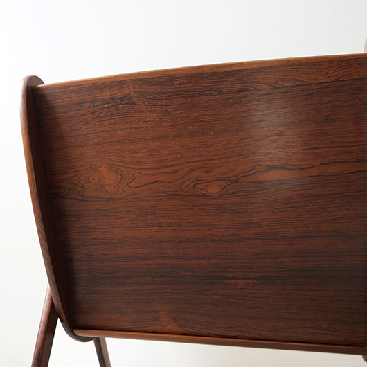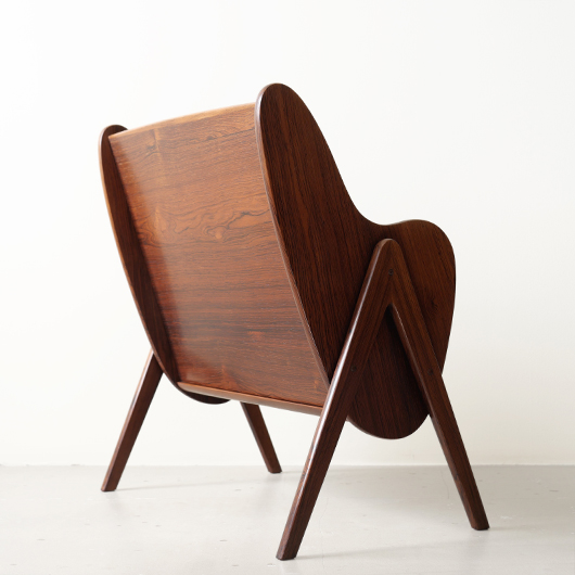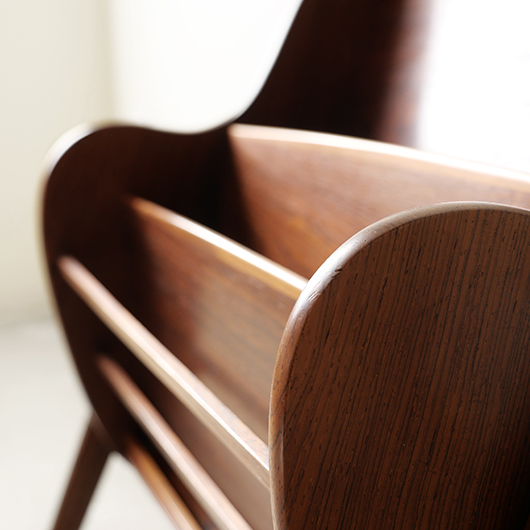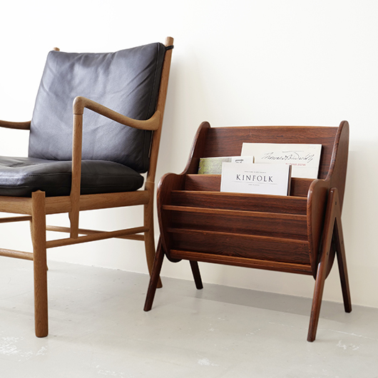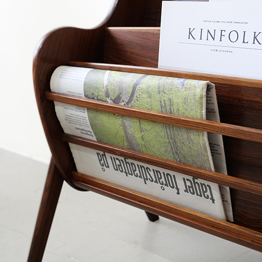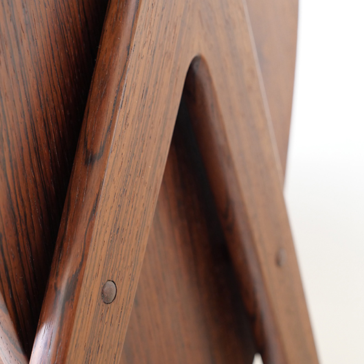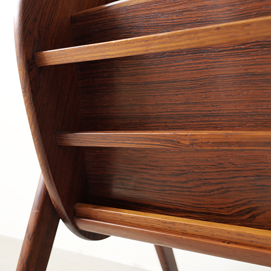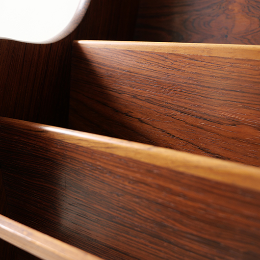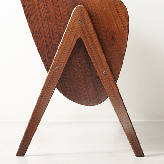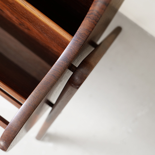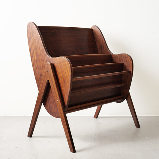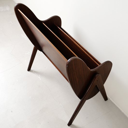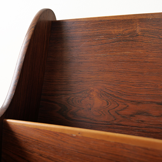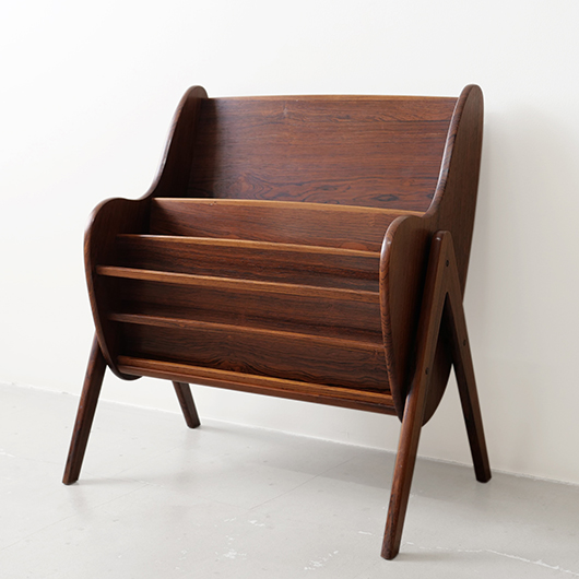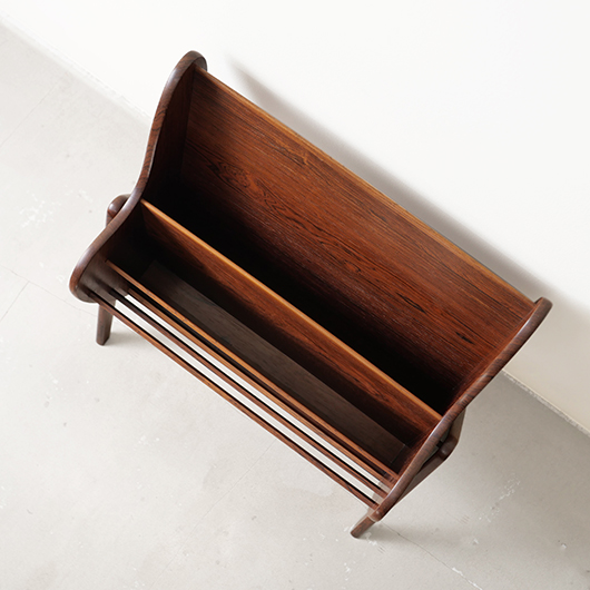 1950〜1960年代デンマーク製のヴィンテージマガジンラック。 側面の有機的なフォルムが目を惹くデザインで、正面から見える3枚の面上部もやわらかな曲線を描くという細部まで丁寧に作られています。 ローズウッド材を段をつけながら3枚の板を並べ、最前列は2本のスティックを渡して、合計3つの部屋に仕切られている作りです。 V字の脚部はスペーサーを挟んで両側面に取り付けているため、側面の美しさにより華を添え当時流行した浮遊感のあるデザインとなっております。 側面や脚部などは贅沢にも無垢のローズウッド材が用いられ、圧倒的なボリューム感に驚きます。サイズの割に重量もあり安定感があります。 当時流行した流線型のデザインの中でも一際こだわりを感じる一台です。工房やデザイナーなどは調べきれませんでしたが、高い技術を持つ職人により丁寧に作られた上質なものであることが伺えます。 ソファ脇やベッドサイドなどで、読みかけの新聞や雑誌など薄めの書籍を収納するのに良さそうです。入れたものがよく見える最前列には、お気に入りの表紙の本を飾るように収納しても良さそうです。 丁寧な修復を施しまして、全体的に綺麗な状態です。ところどころに小キズなど見られますが、雰囲気を損ねるほどではないかと思います。そのほか細部の状態などは画像をご参照ください。