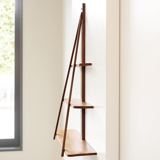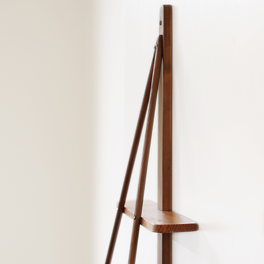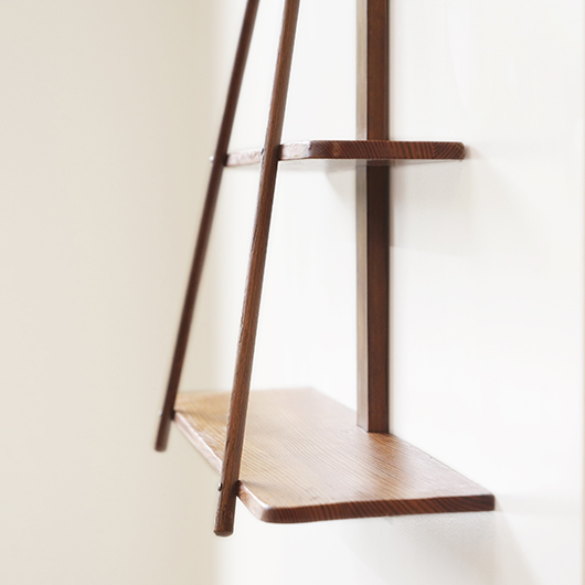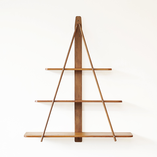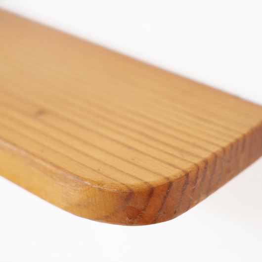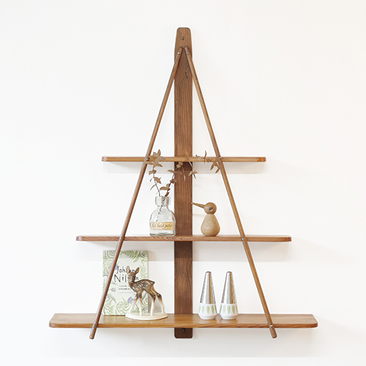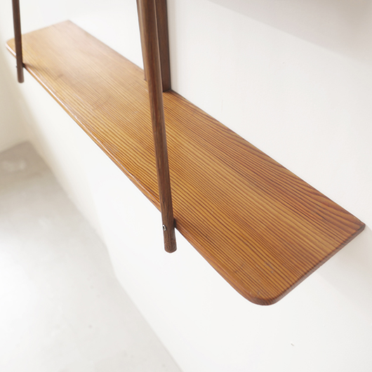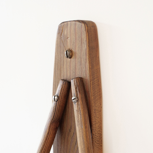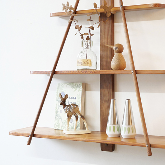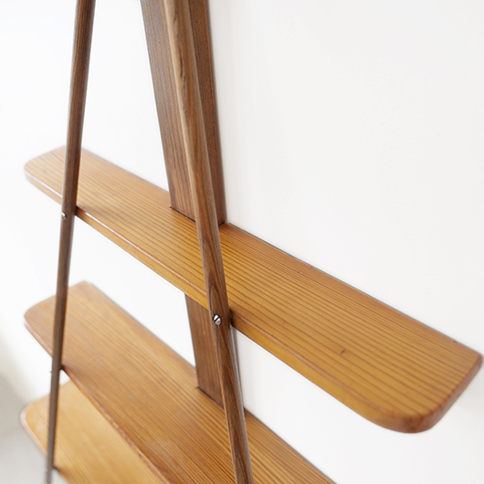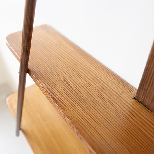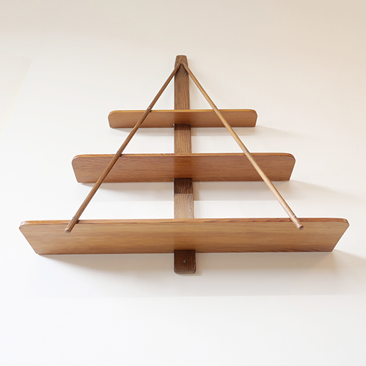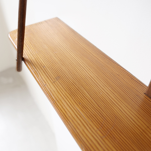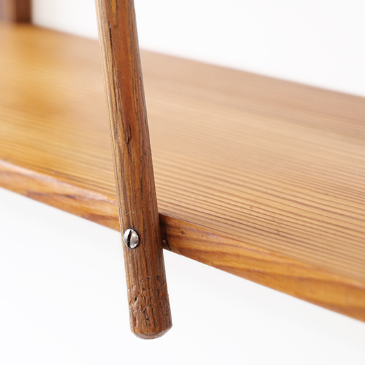 1950年代デンマーク製のヴィンテージウォールシェルフ。 中心となる柱に3枚の棚板をはめ込み、スティック状の支柱2本を正面から斜めに組むことで棚板を支える構造でありそれをデザインとするデンマークらしい発想です。 棚板3枚の奥行きが段々に深くなり斜めに組んだ支柱とのポイントを結んでいるため、横からの姿にもそのミニマルさが際立って見えます。 素材には経年によって飴色に変化したパイン材が用いられ、その木目の特徴から上質なオレゴンパインの無垢材です。 同じく三角形をしたシェルフの"Amagerhylde(アマーのシェルフ)"と比べてみると、よりシンプルでやわらかな雰囲気をした一台となります。二等辺三角形のフォルムはどことなくもみの木のような針葉樹の形を連想させ、やわらかな雰囲気を作り出してくれます。 リビングや玄関先などの壁面に取り付けるだけで、途端に北欧のやわらかな風を運んでくるようです。飾る場所がなく引出しの中にしまっていたお気に入りの小物を、気軽にディスプレイして楽しんではいかがでしょうか。これからの季節はクリスマス用の飾り棚としても良さそうです。 丁寧な修復をしまして、全体的に良好な状態です。経年による斑や小キズやスレがみられますが、雰囲気を壊さないように手を加えすぎないようにしました。それを含めて作り出されたヴィンテージの味わいであると感じます。そのほか細部の状態などは、画像をご参照ください。 ※壁に直接取り付けるタイプとなりますので、下記の注記をご覧ください。