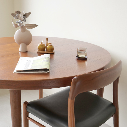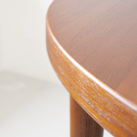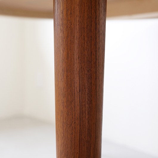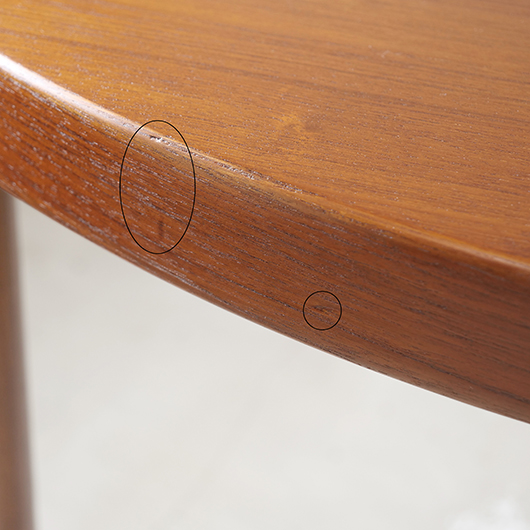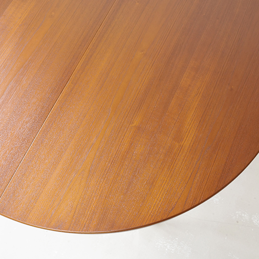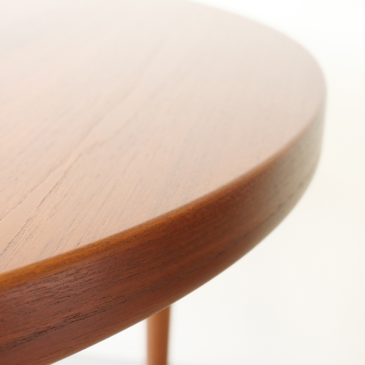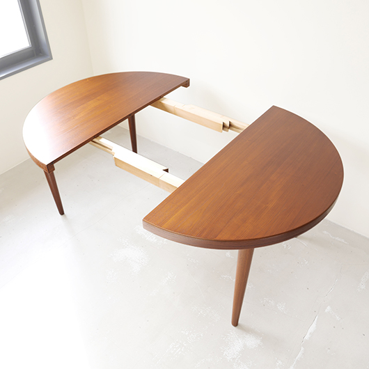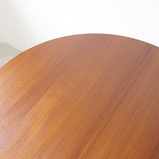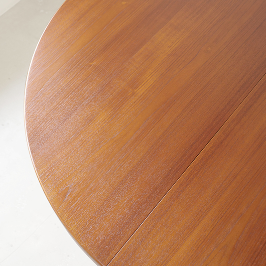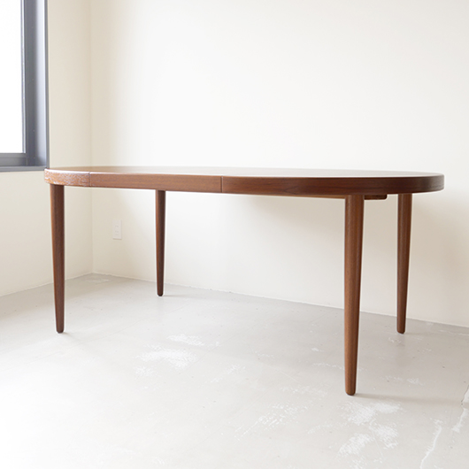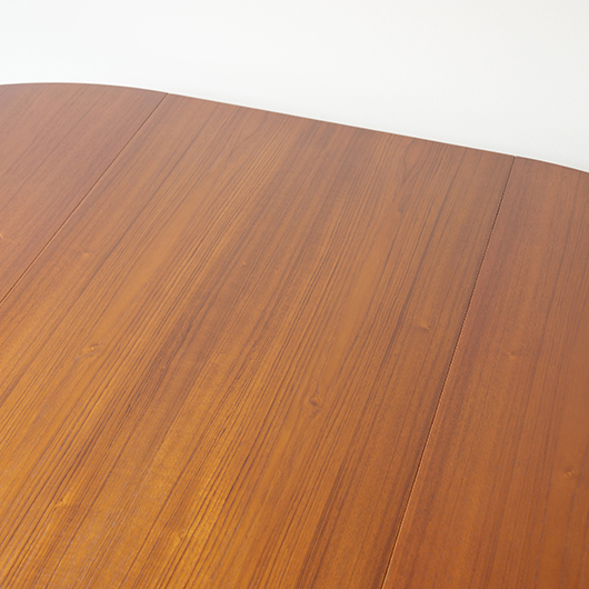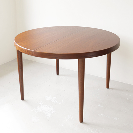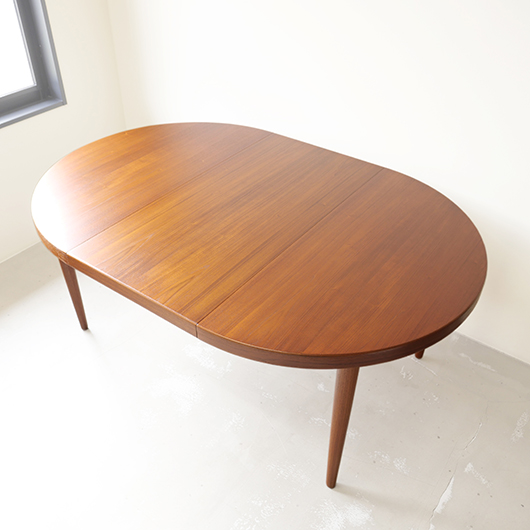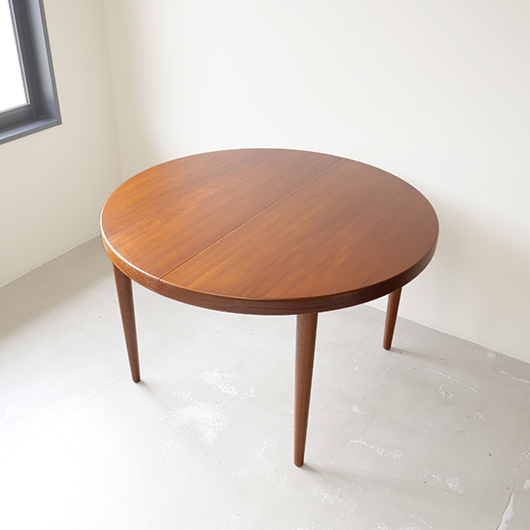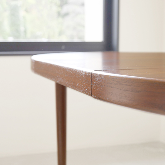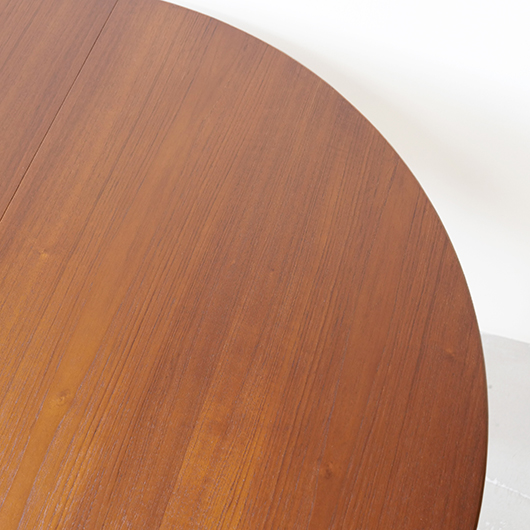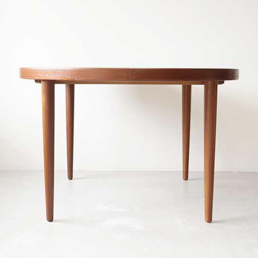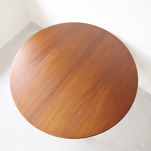 1960年代デンマークSchou Andersens Møbelfabrik製のヴィンテージラウンドテーブル。 広い天板のおおらかで美しいチーク材の木目に目を奪われます。この時代のダイニングテーブルの多くに見られる天板下の幕板を排除した構造により、非常にすっきりとした印象に仕上げられています。そして天板のエッジは角を落として当たりをやわらかくしたりと、デザイン面だけではなく使い心地を考えた造りであることを、使用していくうちに実感していただけると思います。 通常は円形の4人掛けテーブルとしてゆったりと、エクステンション(伸張)板を用いてオーバル型の6人掛けとしてもご使用いただけます。 全体を丁寧に研磨(サンディング)をして小キズや輪ジミを取り除き、その後に再塗装を行い、自然な艶の良い雰囲気に仕上がりました。多少の水濡れにも問題のない塗装を施しておりますので、安心してご使用いただけます。また修復時には天板と伸張板との色味を合わせることを心がけており、オーバル型で使用した際も、伸ばしていることを忘れる使い心地です。そのほか細部の状態などは、画像をご参照ください。