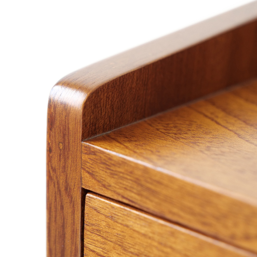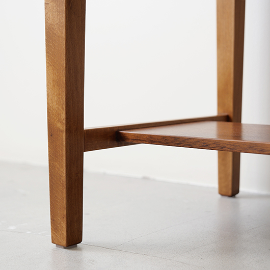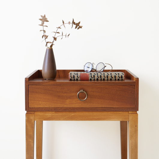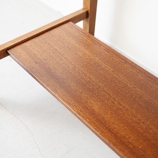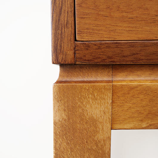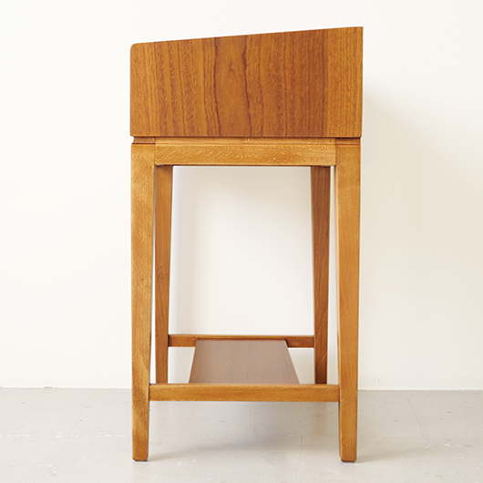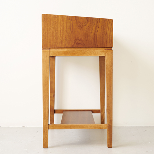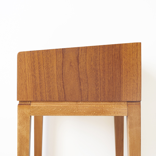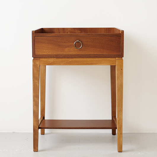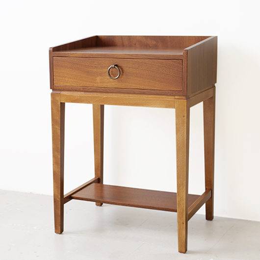 1947年Peter Hvidt & Orla Mølgaard-Nielsenのデザインによる、デンマークSøborg Møbelfabrik製のヴィンテージベッドサイドチェスト。 この天板のためにデザインされたかのような特徴ある美しい杢目の天板は3方に立ち上がりがあるため、物をのせた際に安心できる設計です。その下には小引き出しがつき、スラリとした脚部の下方には棚板も1枚備えられています。 一番の特徴となっているのは真鍮製の取っ手で、指掛の良いリング状のものが少し浮いたように正面に付いています。また本体と脚部の間のには削り出しによる曲線の溝がつけられアクセントとしています。職人により細部にわたって丁寧に作られた上質なものであることが伺えます。本体の素材には深みのあるウォールナット材が用いられ、脚部の明るめの色味のビーチ材とのコントラストが効いています。 1944年に共同でHvidt & Mølgaard studioを開設した2人は、家具のデザインから集合住宅に橋まで様々なものをデザインしていきます。今回のSøborg Møbelfabrikともキャビネットやベッドなど、様々な上質な家具を生み出しました。特にこちらのチェストは現地でも出会うことのない、とても希少な一台かと思います。 ナイトテーブルとも呼ばれるこちらは、ベッドの横に置いて使うように設計されました。テーブルランプや目覚まし時計を乗せ、足元の棚には読みかけの雑誌などを収納したりと使い勝手の良さが伺えます。置く場所を選ばない小ぶりなサイズのため玄関先などさまざまな場所で活躍してくれそうです。 全体を丁寧に研磨(サンディング)をして小キズや輪ジミを取り除き、その後に再塗装を行い、自然な艶の良い雰囲気に仕上がりました。全体として非常に綺麗な状態です。引出し底板は新しいものに交換しましたので、清潔にお使いいただけます。そのほか細部の状態などは、画像をご参照ください。