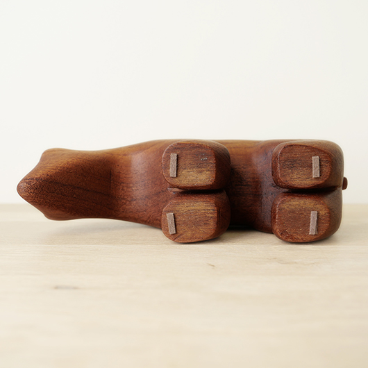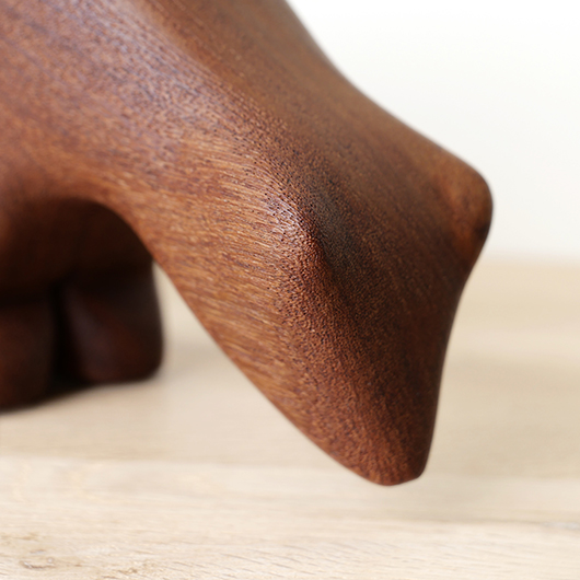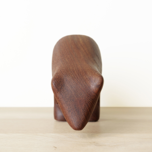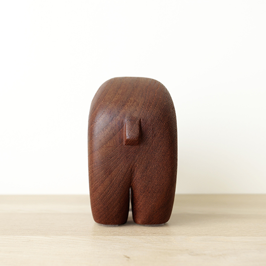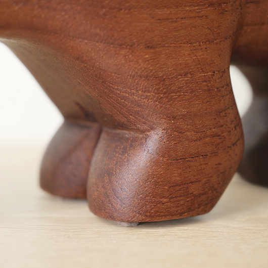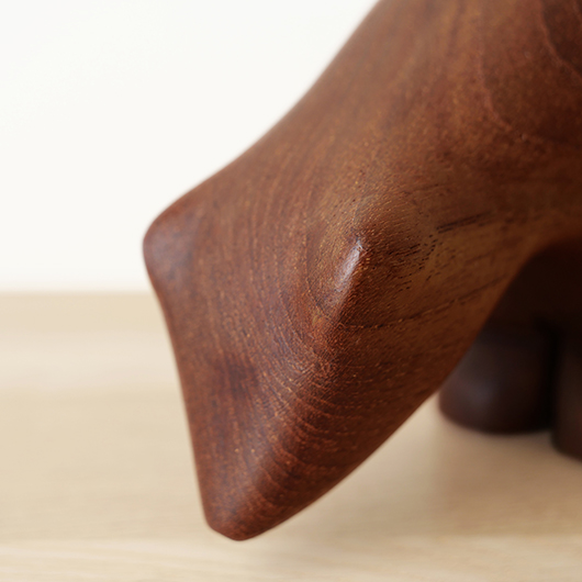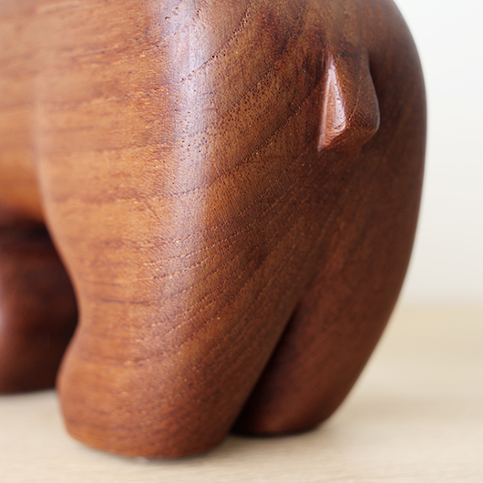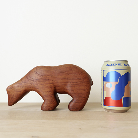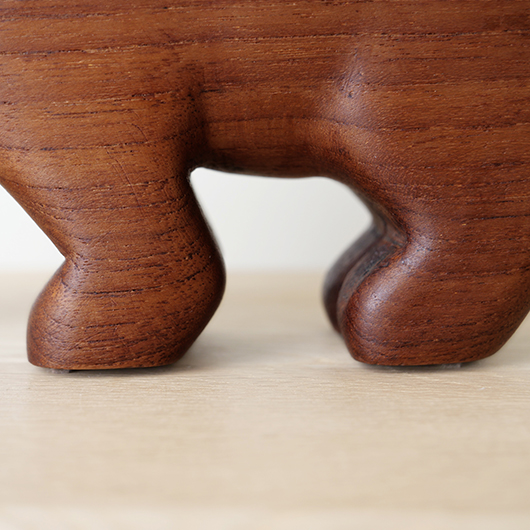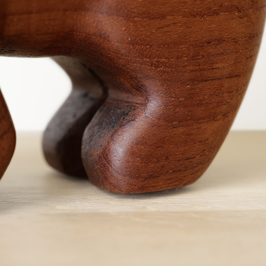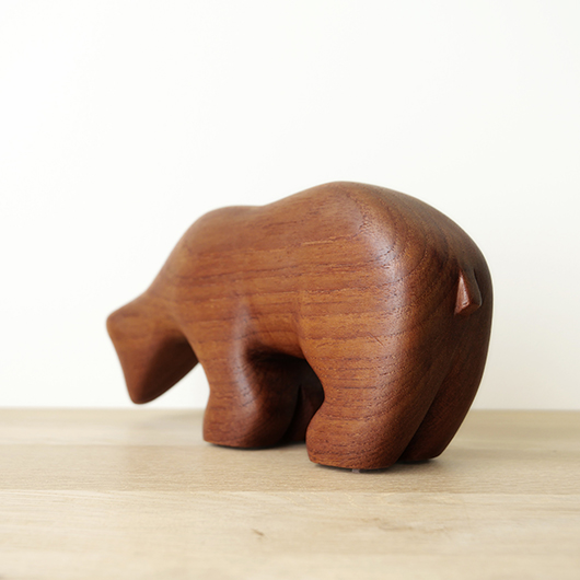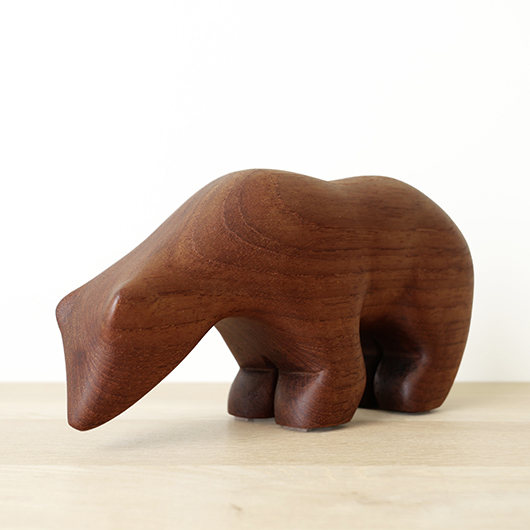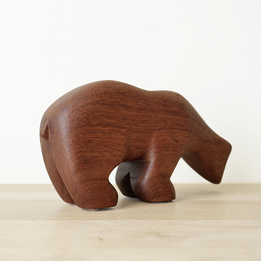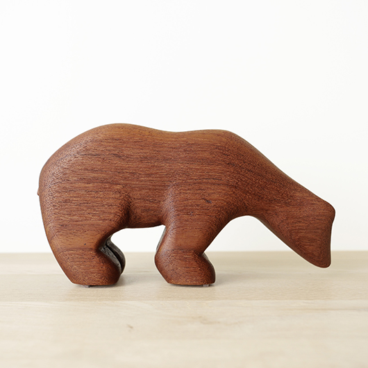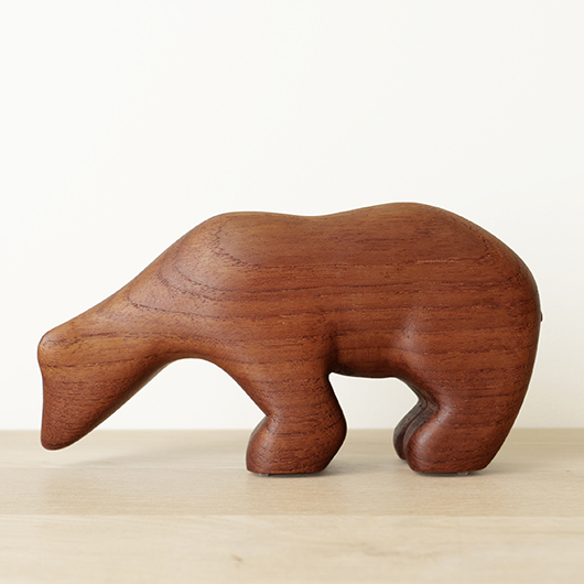 1950〜1960年代デンマーク製のヴィンテージ オブジェ。 長い首に小さな頭部のポーラーベアをチーク無垢材を削り出して作られています。モフモフとした足先や背中の曲線、小さく愛らしい耳などの特徴を鋭い観察眼で捉え、それらをわずかな凹凸のみで表した職人の見事な腕が光ります。目などを描かないことで、ヴィンテージらしい目の詰まった上質なチーク材の質感を主役に据えていることにデンマークらしさを感じます。 チェストやシェルフに乗せるだけで周りを華やかにしてくれます。小ぶりなサイズ感のため気軽に取り入れることができるアート作品です。 ごくわずかな小キズなどは見られますが、雰囲気を損ねない程度かと思います。全体として非常に綺麗な状態です。そのほか細部の状態などは、画像をご参照ください。