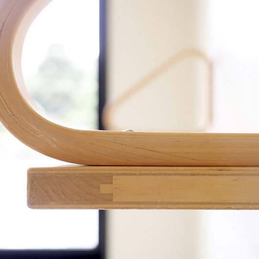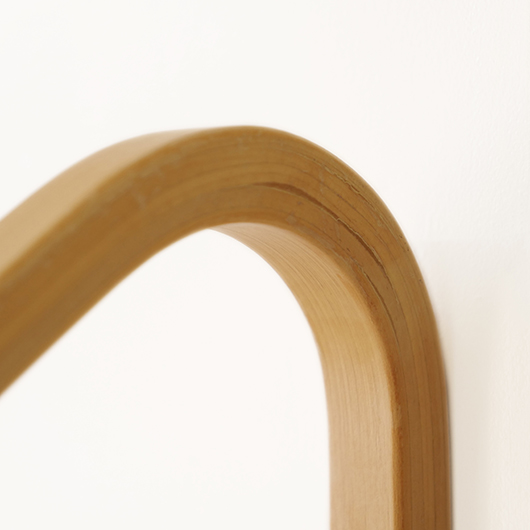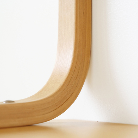 フィンランドの巨匠Alvar Aaltoが1936年にデザインしました、1960年代頃のArtek製ヴィンテージ ウォールシェルフno.112。 トライアングルのようなループ状のフレームを両サイドに、そこに棚板のついたシンプルな構成です。このフレームは数ミリにカットしたバーチ材の板を重ね合わせて曲げる「ラメラ曲げ木」と呼ばれるもので、柔軟性に富み強度もある素材ということでウォールシェルフのほかにもアームチェアやティートロリーなどにも用いられています。 バーチ材が経年によりとても良い色味に変化しており、その雰囲気はヴィンテージらなではのものと思います。 リビングなどの壁に取り付けお気に入りの雑貨などをディスプレイするだけで、簡単に雰囲気のある空間を作り出すことができます。画像のように三角形の部分を上にするとブックエンドとして使用したり、また天板を上にした状態でも使用することができ、こちらはよりすっきりとした印象に変わります。 丁寧な修復を行いまして、全体的に綺麗な状態です。天板に若干の経年感が見られますが、気になる程ではないと思います。そのほか細部の状態などは、画像をご参照ください。 ※壁に直接取り付けるタイプとなりますので、下記の注記をご覧ください。