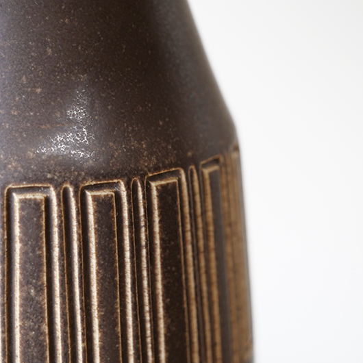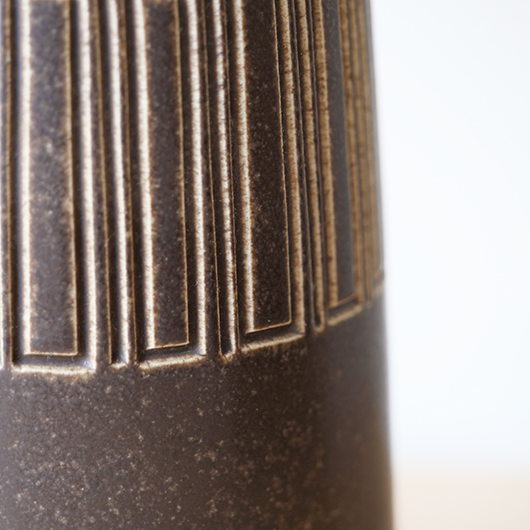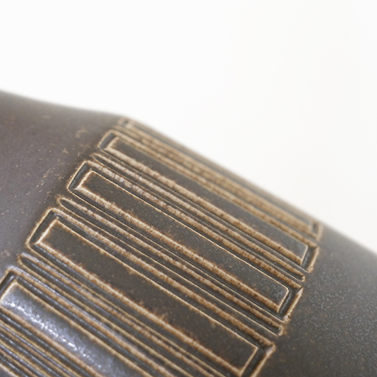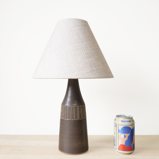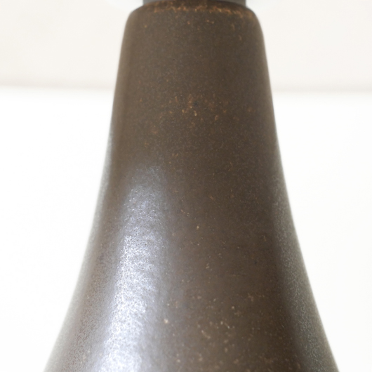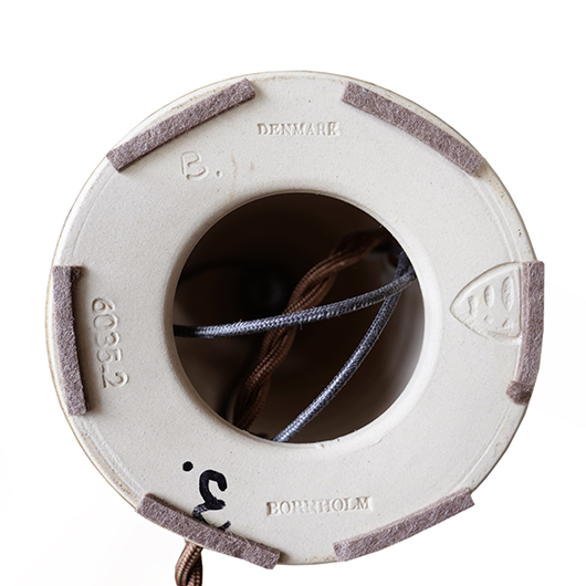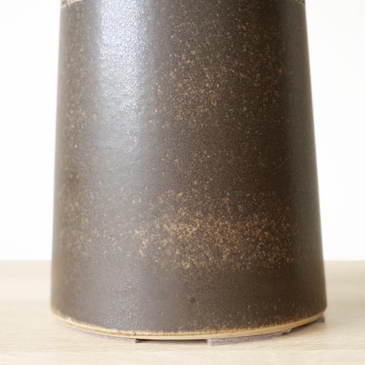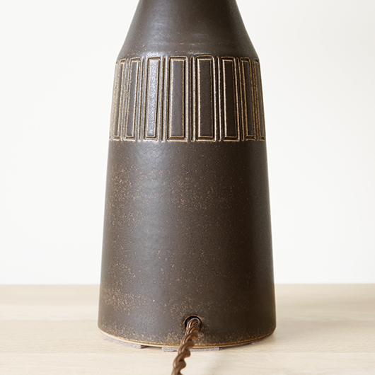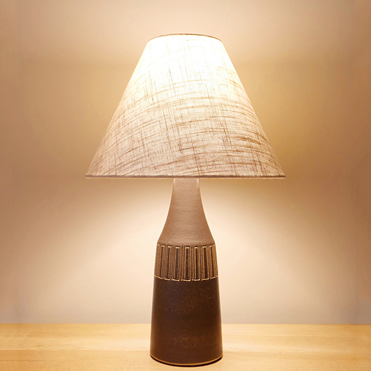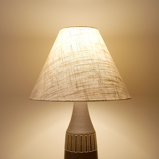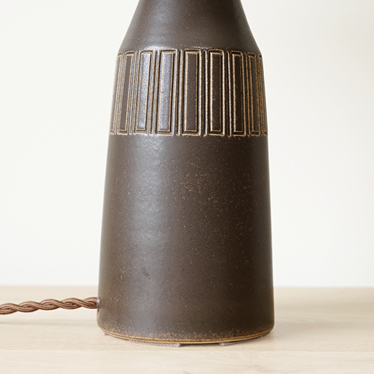 デンマークの名窯のひとつMichael Andersen & Sons製の1960年代のヴィンテージテーブルランプ。 円錐に近いすっきりとしたフォルムに幾何学模様のデザインが効いており、落ち着いた佇まいが印象的です。全体にマット釉がかかり、模様を入れた部分のみ素地が見えています。 シェードは本体の形が美しく見えるように国内にてオーダーしたもので、明かりを灯すとニュアンスのあるリネン地の風合いがまた違った表情を作り出してくれます。新しく交換したコードなども、ヴィンテージの雰囲気に合うデザインをセレクトました。 1890年創業のMichael Andersen & Sonsは数多くの陶器メーカーがあったBornholm島にて開窯し、いくつもの美し作品を残してきました。 あたたかみのある色味に北欧ヴィンテージらしい雰囲気が、空間の質をより高めてくれることと思います。高さもあるためチェストやサイドボードの上などでも存在感を放ってくれます。 電気工事士の資格を持つ職人によりソケット・配線・プラグ等の電気に関わる部分は全て交換しまして、電気用品安全法に基づいた点検なども行いPSEマークを表示しておりますので、新しいもの同様に安心してご使用いただけます(詳しくは下記をご覧ください)。 表面にヒビやなどなく全体的に綺麗な状態です。そのほか細部の状態などは、画像をご参照ください。