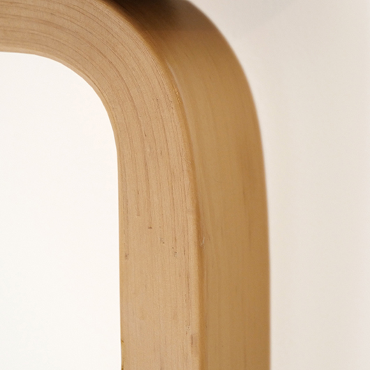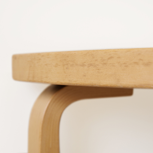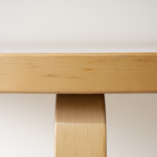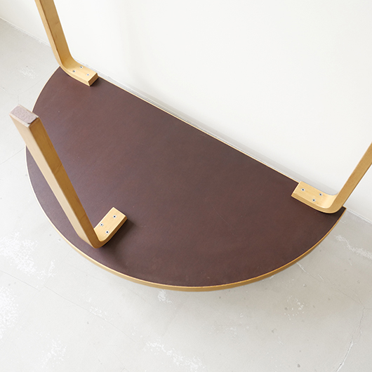 フィンランドの巨匠Alvar Aaltoが1935年にデザインしました、Artek社製ヴィンテージの半円テーブルTable 95 (half-round)。 無駄を削ぎ落としたデザインと木のぬくもりを合わせ持った、永年のロングセラーです。長方形や円形など様々な形のある中、こちらは奥行き60cmとスリムなのに幅は120cmと十分な広さの天板を持つ、半円らしい利点が特徴です。2名使いのテーブルで程よい距離感でやや内側を向いてテーブルを囲みます。窮屈さもなく、それぞれがゆったりと天板を使うことができます。 天板は水濡れに強いホワイトラミネート仕様で、神経質にならずおおらかに使用できるため、小さなお子様のいるご家庭でも安心です。 フィンランドの伝統技法の挽き曲げ技法を応用したL-legアアルトレッグは、Artekのコンセプト(Art+Technologyの融合)のもとに出来上がった独自の技法。ダイニング用としてはもちろん、パソコンデスクや作業台と、用途にとらわれない自由さがあります。リビングや寝室など、場所を選ばずにコーディネートをお楽しみください。 丁寧にメンテナンスを施し、全体的に良好な状態です。側面や脚部などに経年感が見られますが、雰囲気を損ねるほどではないと思います。天板にも薄らとしたスレなど見られますが良好な状態を保っています。そのほか細部の状態などは画像をご参照ください。 ※脚部は取り付けたままでの配送となります。外した状態でのお届けをご希望の場合は事前にお申し付けください。