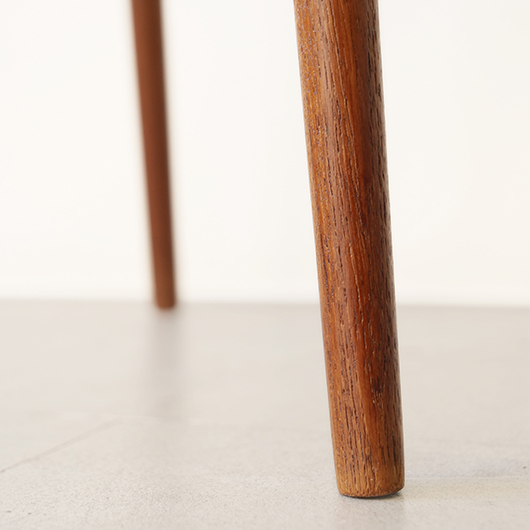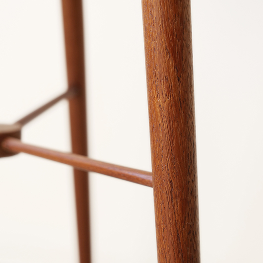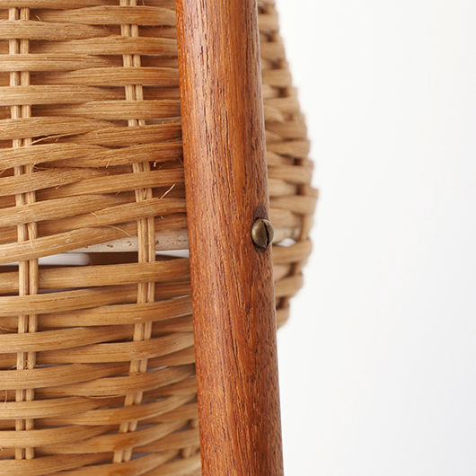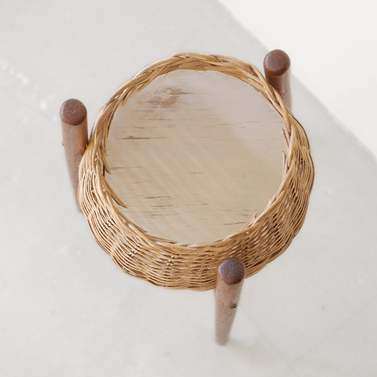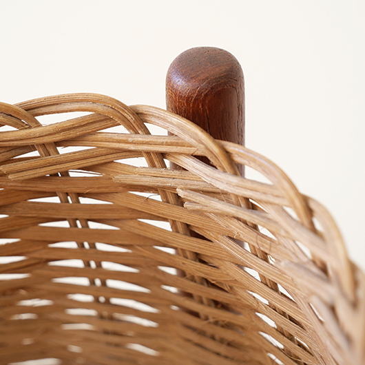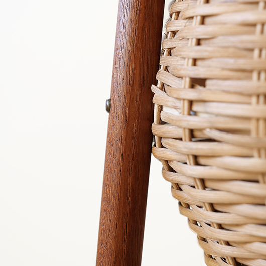 1960年代デンマーク製のヴィンテージ プランター。 籐編みのバスケットにスラリと長いチーク材の脚部を組み合わせた特徴あるフォルムが印象的です。ラタンバスケットは上方に膨らみのある縦長のシルエットで、上部から13cmの一番径の広い部分に白くペイントされた底板が固定されています。この底板によって花瓶など入れるものが小さめサイズに限定されるため、かえって気負いなく普段使いできる使い勝手の良さに繋がっているようです。 バスケットの外側にはチーク無垢材でできた3本の脚が放射状に伸び、下方に見られる脚部を繋ぎ合わせる役目のごく細いスティックにもデザイン性を感じます。 季節の草花やドライフラワーを飾って玄関や窓際に置くだけで、雰囲気を華やかなものに変えてくれます。中に入るものが小さめサイズにも関わらずバスケットのサイズが大きいため、とても見応えのあるインテリアに変身します。また長い脚部を活かすようにつる性植物とも相性が良さそうです。合わせる植物によって雰囲気が大きく変わるため、季節に合わせてお楽しみいただけます。長くデンマークに買い付けに行っておりますが初めて出会うスペシャルなプランターです。 丁寧な修復を行い、全体的に綺麗な状態です。細部の状態などは画像をご参照ください。