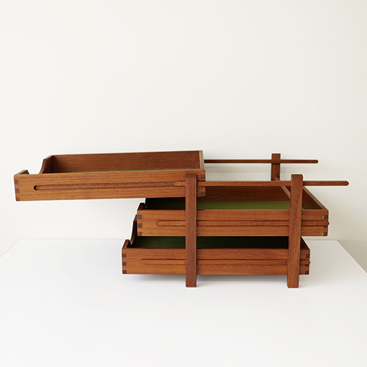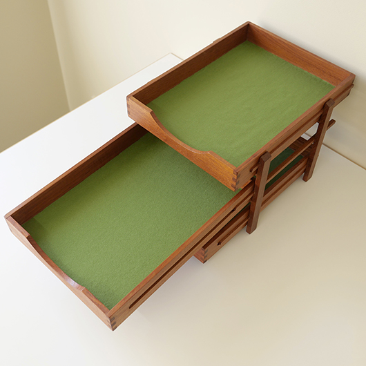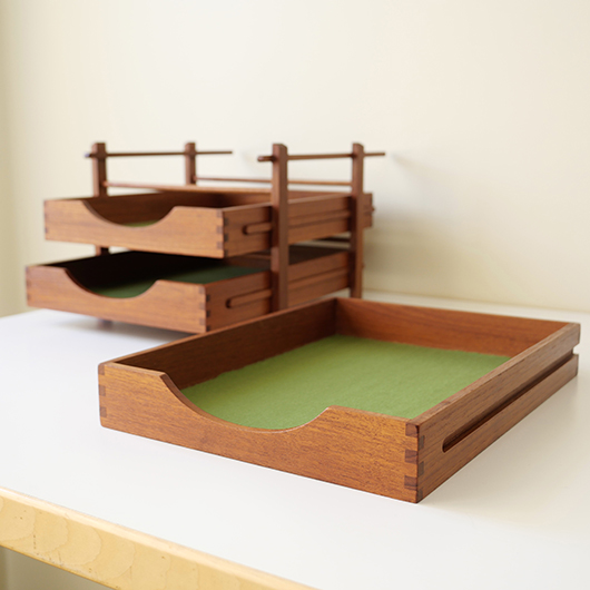 1970年代デンマークTrip Trap製のヴィンテージ レタートレイ。 3枚のトレイが段違いになって収まっており、それぞれが手前に引き出すことができる構造です。チーク無垢材を用いたトレイは組み継ぎによる接合部が美しく、底には若草色のフェルト敷きです。A4サイズがゆったりと入るサイズ感で、それぞれのトレイは独立して引き外すことができるため、単体としても使用することができます。 上質な木材を用いた家具やホームアクセサリーを作り続けていたTrip Trapはその後Skagerakと社名を変え、さらに2022年よりFritz Hansenに買収されSkagerak Collectionというホームアクセサリーシリーズとして新たなスタートを切りました。このレタートレイもFritz Hansenよりオーク材の仕様にて復刻されました(現在は廃盤)。 デスクの上に置いて書類を整頓する便利なオーガナイザーとして活躍してくれます。プラスチックやスチールなど無機質な素材とはまた異なる、あたたかみあるチーク材がインテリアの一部として空間の雰囲気を高めてくれることと思います。雑貨店でアクセサリーや眼鏡などを置く什器などにも良さそうです。 丁寧なメンテナンスを行い、全体的に綺麗な状態です。そのほか細部の状態などは、画像をご参照ください。