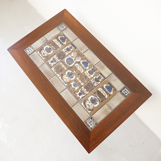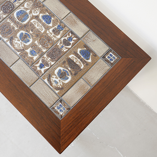ロイヤルコペンハーゲンBACAシリーズのタイルが天板に敷き詰められた、1960年代頃のデンマーク製ヴィンテージコーヒーテーブル。 ベージュからブラウンにかけてのアースカラーのグラデーションが落ち着いた印象を与えてくれます。タイルを天板に敷き詰めることで、熱や水濡れによる輪染みを気にせずにカップやグラスなどを乗せることができ、デザイン性はもちろん実用性も抜群です。 フレームエッジにはモールディングのような装飾が施されておりエレガントな印象です。素材はワシントン条約のレッドリストに入っている希少な高級木材であるローズウッド材が使用されており、縁や脚部からその見事な木目をお楽しみいただけます。そして脚部接合部などからは、Haslev社ならではの高い技術を伺うことができます。味わい深いファイアンスのタイルと合わせることで、シャープなフレームに温かみを添えています。 コーヒーテーブルとして程よいサイズ感で、ソファに合わせるだけで絵になる一台です。 木部は丁寧にサンディング(研磨)をした後に再塗装を行い、非常に綺麗な状態です。ヴィンテージの風合いを生かした自然な艶は、ローズウッド材の美しい木目をさらに際立たせております。詳しくは画像にてご確認ください。