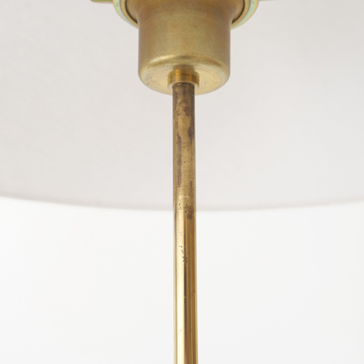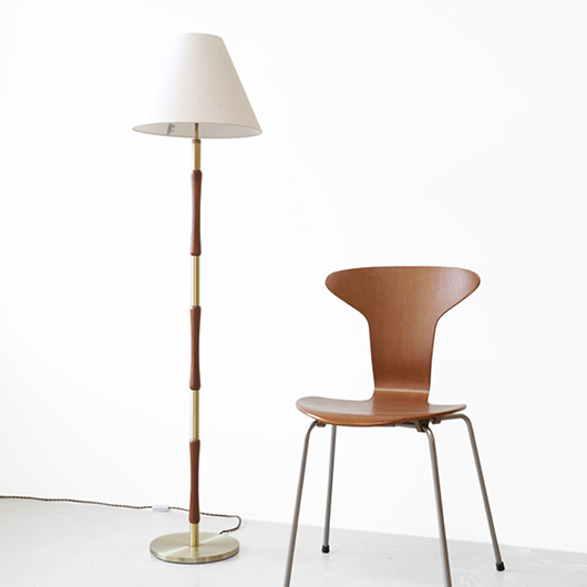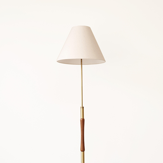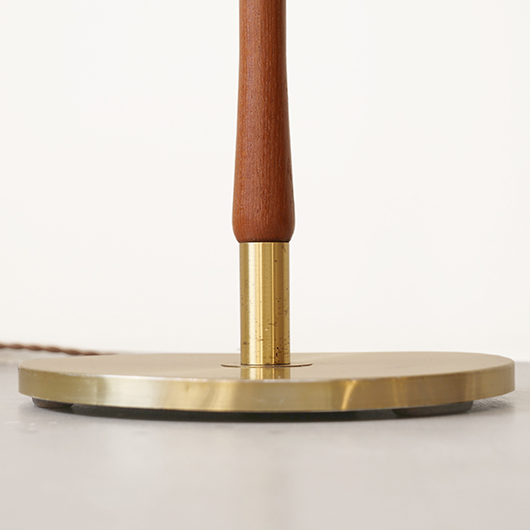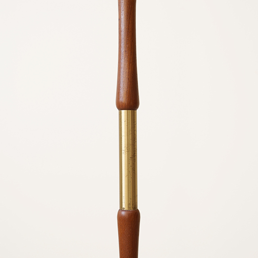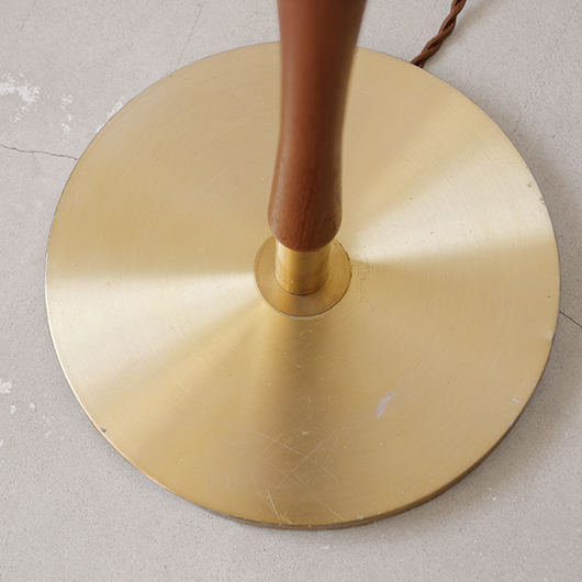 1960年代デンマーク製の伸縮式ヴィンテージフロアランプ。 チーク無垢材と真鍮が交互に組まれた支柱に、真鍮色のベースがついています。その中でも目を引くのはチーク部分で、中心にくびれを持たせて両端は膨らみのある曲線でボリューム感を持たせています。 そして何よりの特徴はポールの長さを30cm程調整ができる伸縮機能で、設置する空間や合わせるソファなどに応じて高さを変えてご使用いただけます。 シェードはコットン地のニュアンスのあるものに交換しており、ぬくもりのある灯りをお楽しみいただけます。新しく交換したコードなども、ヴィンテージの風合いに合うデザインをセレクトました。お使いのインテリアにプラスするだけで、やわらかな灯りによってお部屋の雰囲気をぐっと増してくれます。 電気工事士の資格を持つ職人によりソケット・配線・プラグ等の電気に関わる部分は全て交換し、電気用品安全法に基づいた点検なども行いPSEマークを表示しておりますので、新しいもの同様に安心してご使用いただけます(詳細下記ご参照)。 低めにしてソファ横で手元を照らしたり、高めにして部屋のコーナーに置いて全体を照らしたりと、場所に応じて高さを変えてお使いください。 丁寧な修復を施しまして、全体的に綺麗な状態です。真鍮部分に経年感が見られますが、ヴィンテージのよい味わいを感じる部分かと思います。そのほか細部の状態などは、画像をご参照ください。