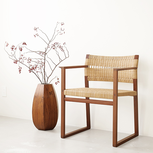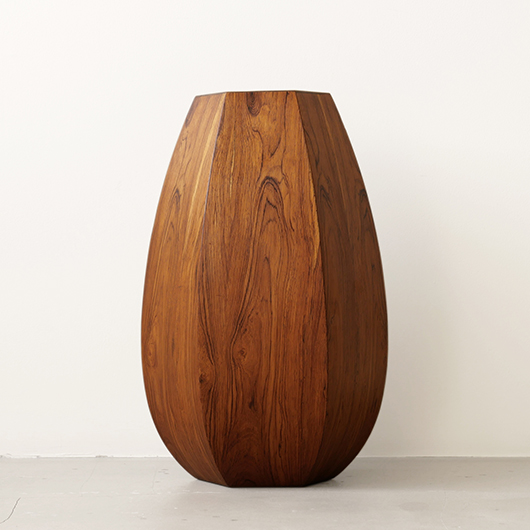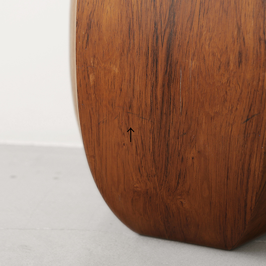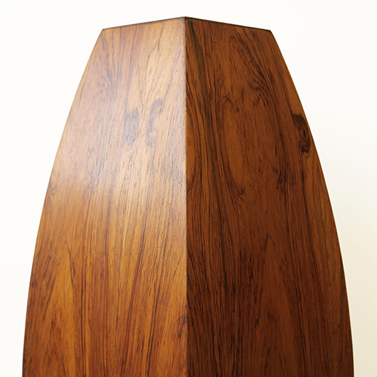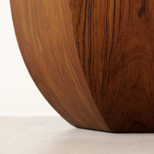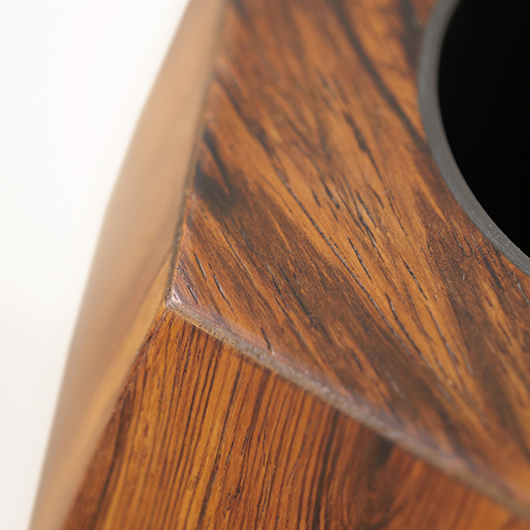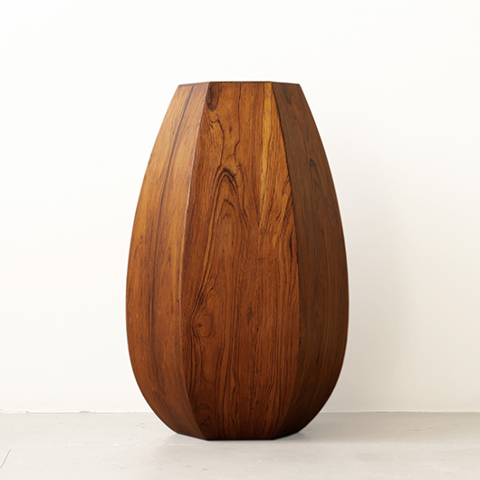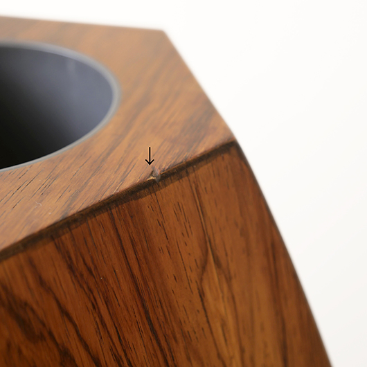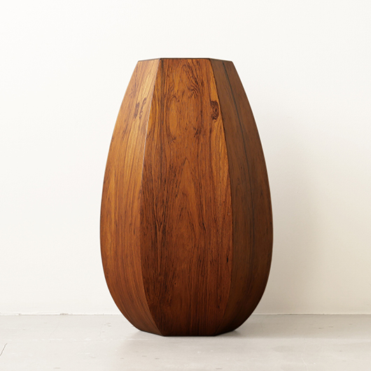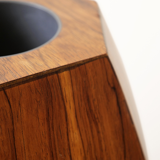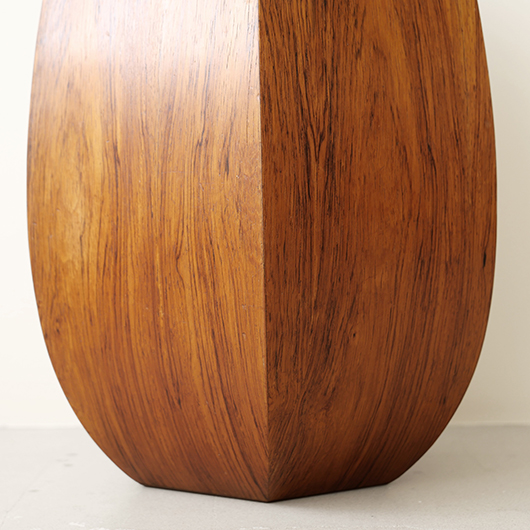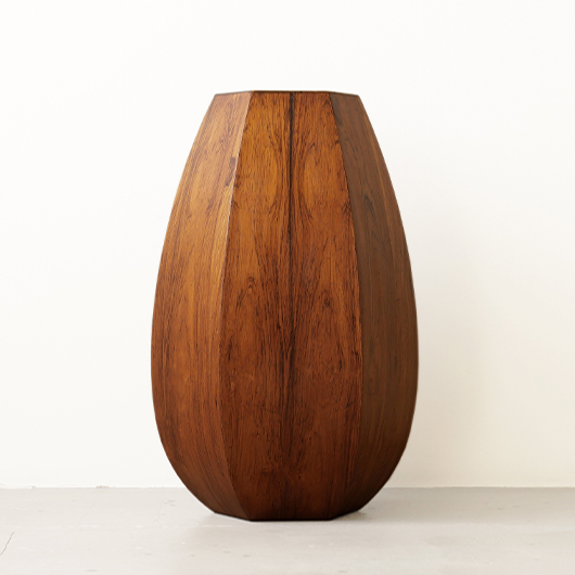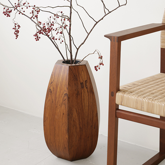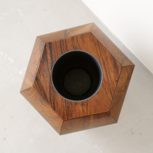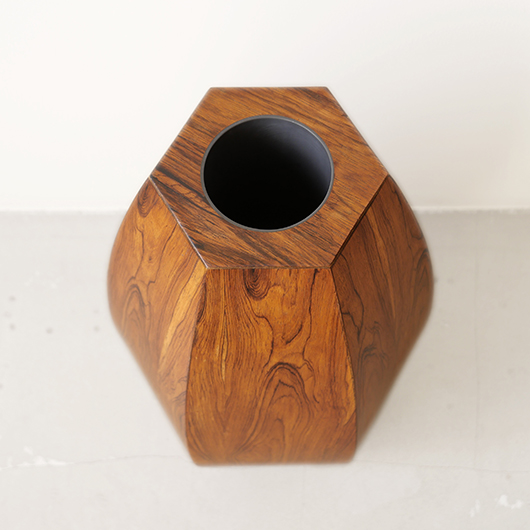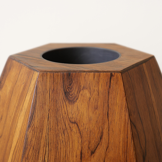 1950年代デンマーク製のヴィンテージフラワーコンテナ(花器)。 6角形のそれぞれの辺からオーガニックな曲線で下方に向かって膨らみを持たせた、非常に美しいフォルムに目を奪われます。さらに接合部にエッジを効かせることで、やわらかさだけでなくモダンな印象へと変わります。上部には中央から筒状に穴が空いており、内部は合成樹脂で覆われ直接水を入れることのできる構造です。 素材にはワシントン条約のレッドリストに入っている高級木材であるローズウッドが用いられ、ダイナミックな木目やヴォリューム感が大型であることでさらに際立っています。 空間を引き締めるような圧倒的な存在感で、一般家庭の玄関先はもちろん旅館や飲食店、ショップなどのエントランスなどで空間に華やかさを添えるアイテムとして活躍してくれることと思います。活ける枝物によって大きく印象が変わるため、季節ごとにお楽しみいただけます。このような床置きで使用できる大型の木製花器は、現地でもまず見かけることのないスペシャルな一台です。 丁寧なメンテナンスを施し、全体的に良好な状態です。小キズなどは見られますが、雰囲気を損ねるほどではありません。水を張った水漏れテストを行いましたが、古いもののため保証は出来かねます。そのためドライフラワーを合わせたり、生花を入れる場合は細いガラス瓶を内部に入れて使用すると安心かと思います。そのほか細部の状態などは、画像をご参照ください。
