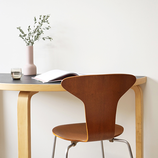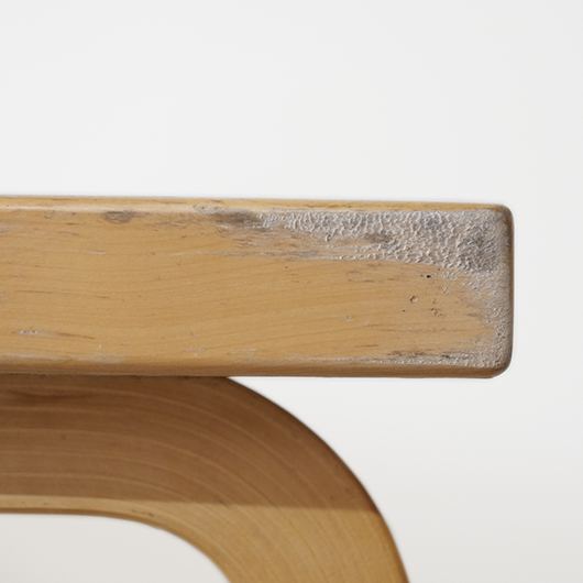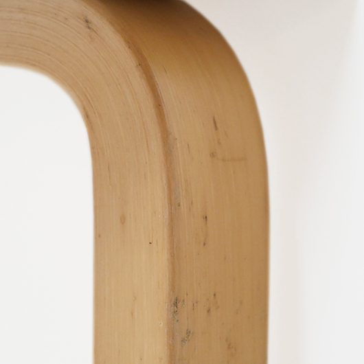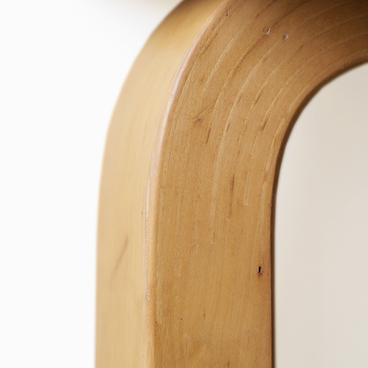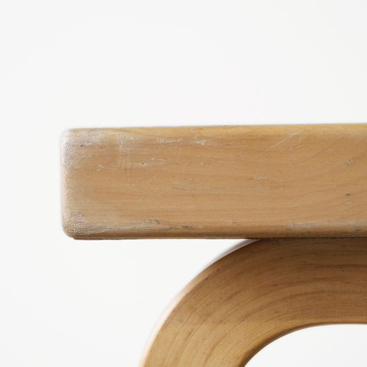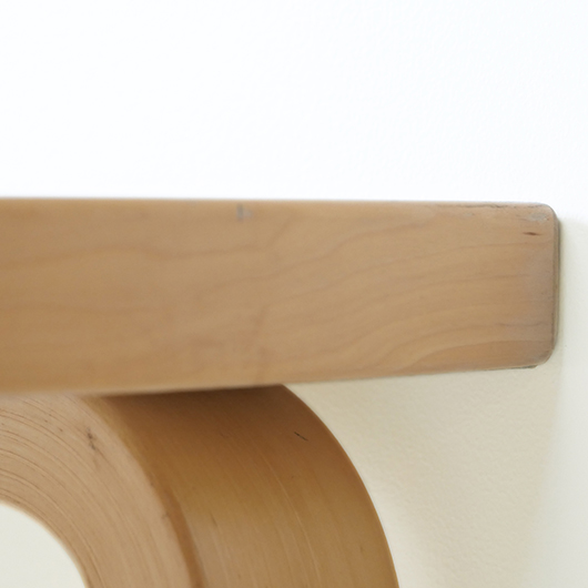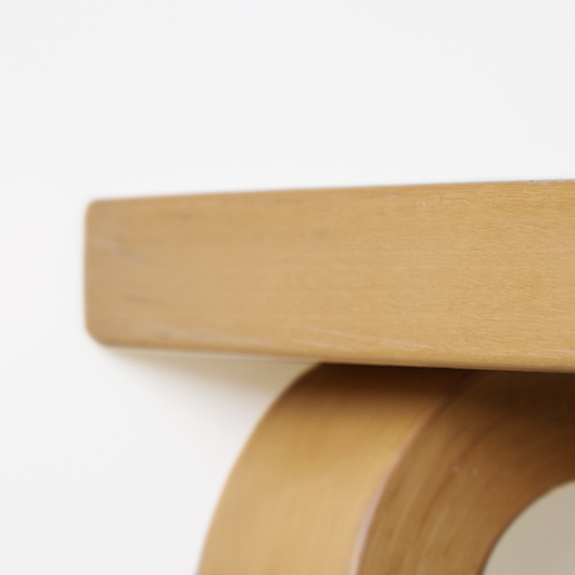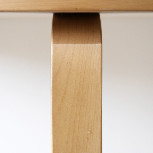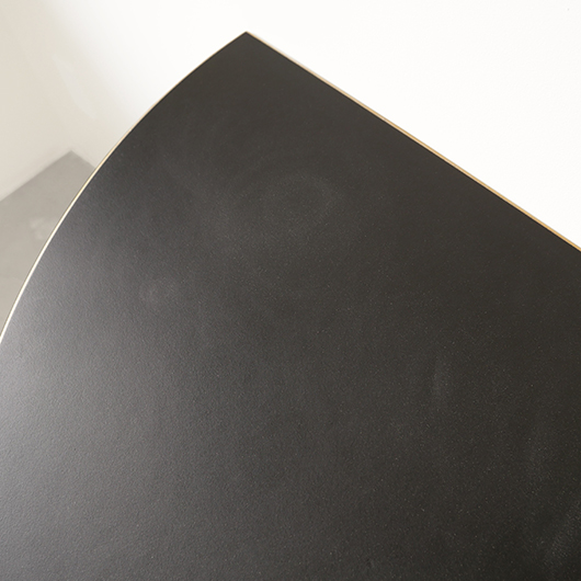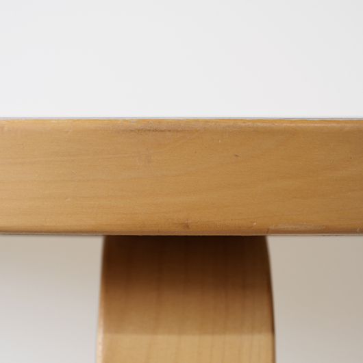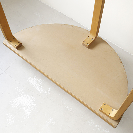 フィンランドの巨匠Alvar Aaltoが1935年にデザインしました、Artek社製ヴィンテージの半円テーブルTable 95 (half-round)。 無駄を削ぎ落としたデザインと木のぬくもりを合わせ持った、永年のロングセラーです。長方形や円形など様々な形のある中、こちらは奥行き60cmとスリムなのに幅は120cmと十分な広さの天板を持つ、半円らしい利点が特徴です。2名使いのテーブルで程よい距離感でやや内側を向いてテーブルを囲みます。窮屈さもなく、それぞれがゆったりと天板を使うことができます。 天板は天然色素であるリノリウムによるブラック塗装で、他の部分と合わせて経年変化をしていく楽しみがあります。空間を引き締めてくれるブラックは艶消しということもあり、さまざまなチェアとも相性よく合わせることができそうです。 フィンランドの伝統技法の挽き曲げ技法を応用したL-legアアルトレッグは、Artekのコンセプト(Art+Technologyの融合)のもとに出来上がった独自の技法。ダイニング用としてはもちろん、パソコンデスクや作業台と、用途にとらわれない自由さがあります。リビングや寝室など、場所を選ばずにコーディネートをお楽しみください。 丁寧にメンテナンスを施し、全体的に良好な状態です。天板に薄らとしたスレ、側面や脚部などに経年感が見られますが、経年によるヴィンテージらしい風合いのままおおらかにお使いいただければと思います(スレが一番強く出ている側面部分は壁につけると見えなくなる部分です)。雰囲気を大きく損ねるほどではないと思いますが、それらを考慮したお値段とさせていただいております。そのほか細部の状態などは画像をご参照ください。 ※脚部は取り付けたままでの配送となります。外した状態でのお届けをご希望の場合は事前にお申し付けください。