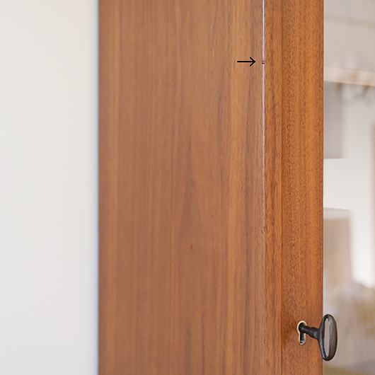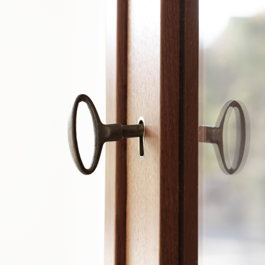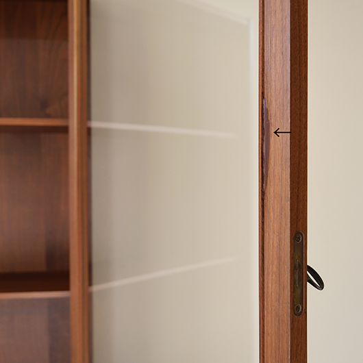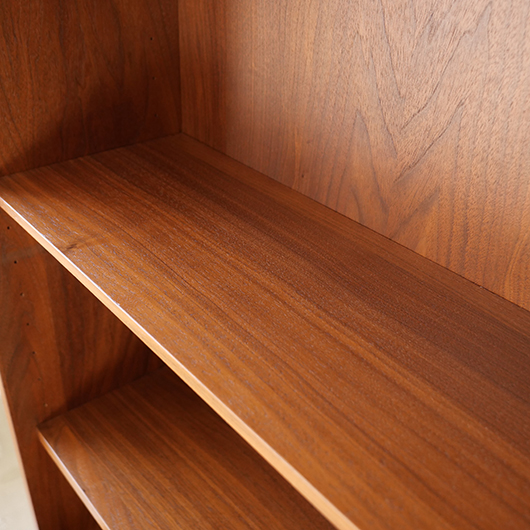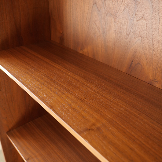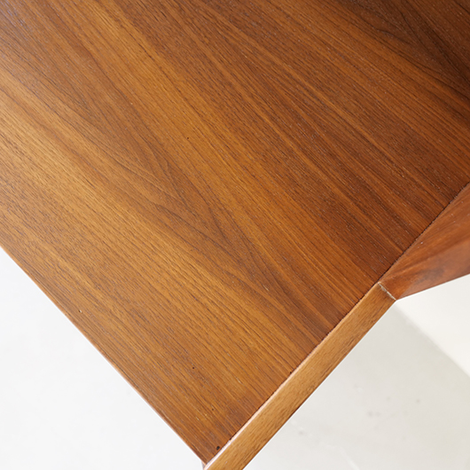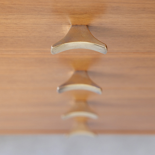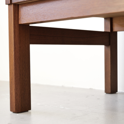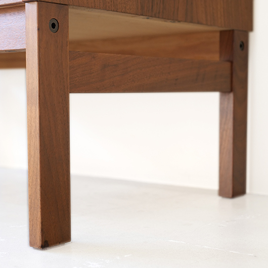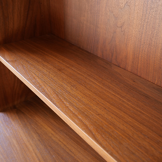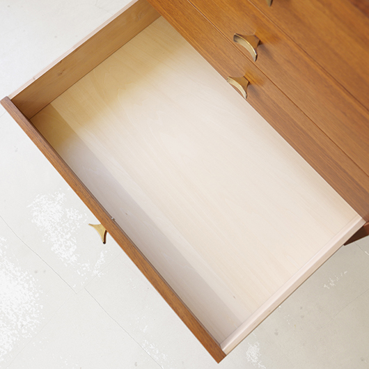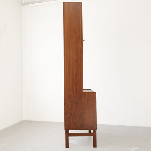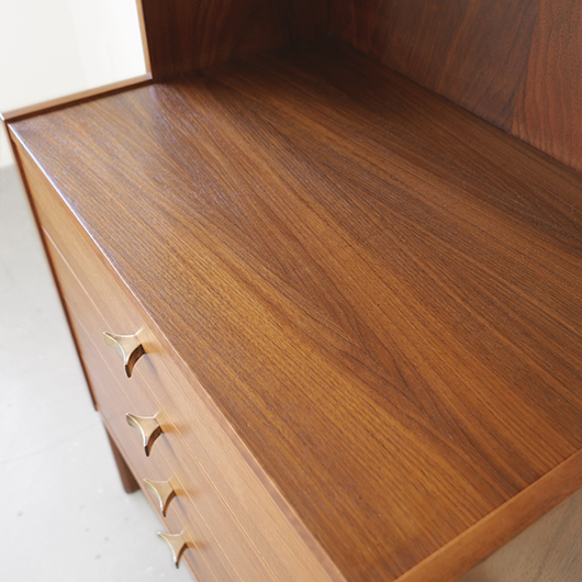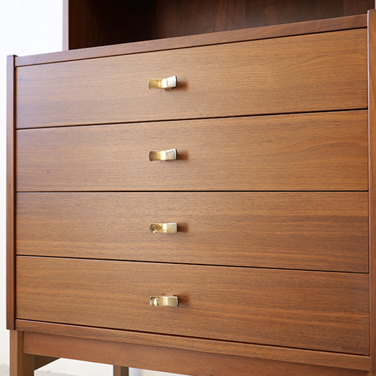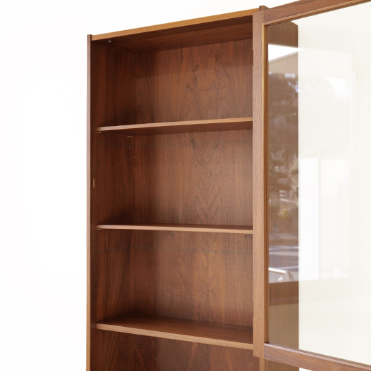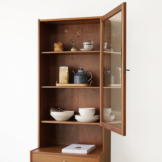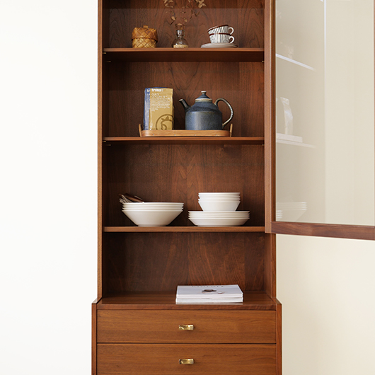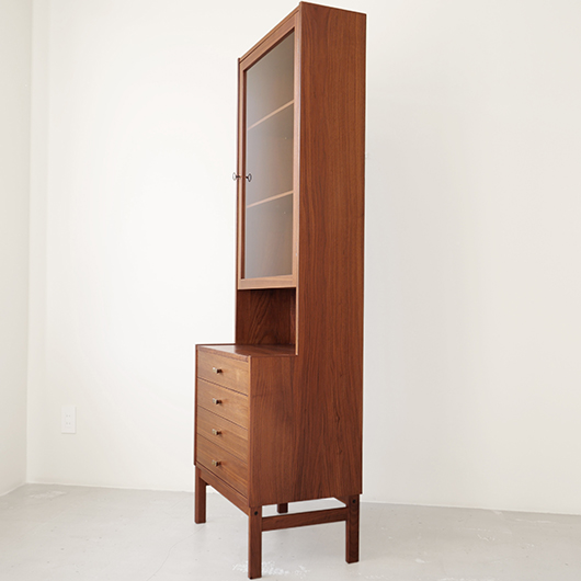 1960年代スウェーデン製のヴィンテージ ガラス扉キャビネット。 上部ガラス扉を開けると、可動式の棚板が2枚備えられた大容量の収納が現れます。間にオープンスペースを挟み、下部はモダンなデザインの真鍮取っ手がアクセントとなった4段の引き出しとなっております。 一番の特徴はガラス扉であることで、この当時は扉を含め全て木材で作られたものが多い中、ガラスを用いることで非常に軽やかな印象を与えてくれます。また幅60cm、奥行き40cmというスリムなサイズ感であることも、大ぶりな家具の多い中ではとても魅力的です。 素材はウォールナット材が用いられており、落ち着いたブラウン色はさまざまな家具に合わせやすく、他のインテリアとも馴染んでくれることと思います。 キッチンに置いてお気に入りの食器を見せながら収納したり、リビングなどで飾り棚として利用したりと、さまざまな使い方が思い浮かびます。 丁寧な修復を行いまして、全体的に非常に綺麗な状態です。引出しの底板は新しく交換しておりますので、清潔に気持ち良くお使いいただけます。わずかな小キズなど見られますが、まず気にならない程度かと思います。そのほか細部の状態などは、画像をご参照ください。