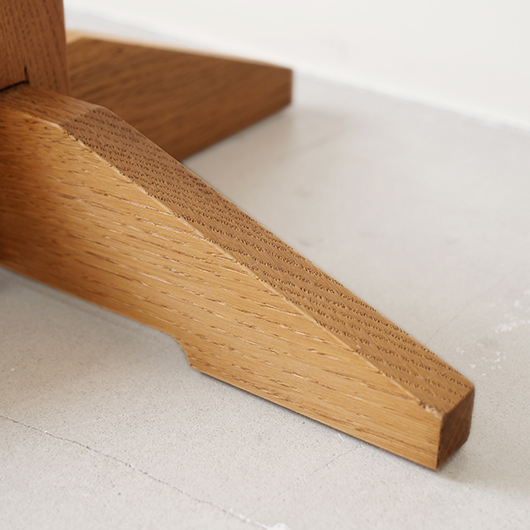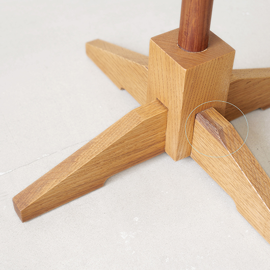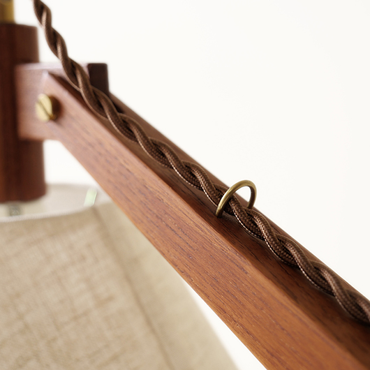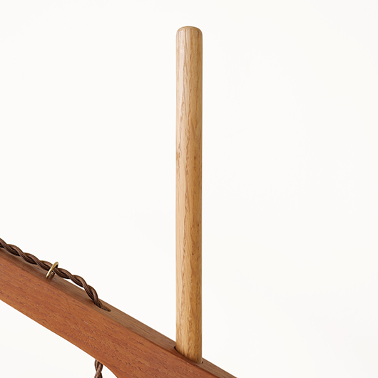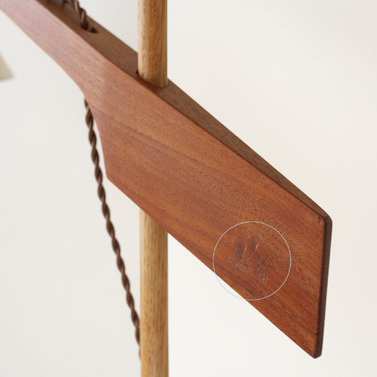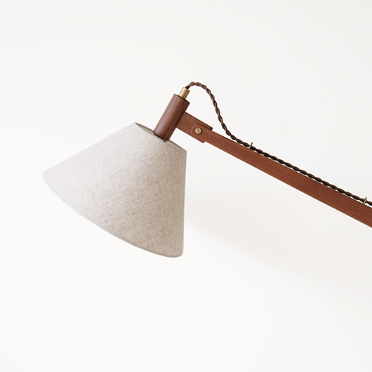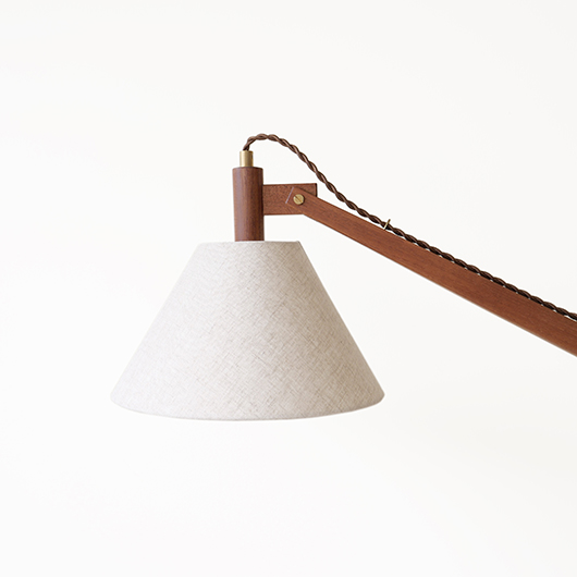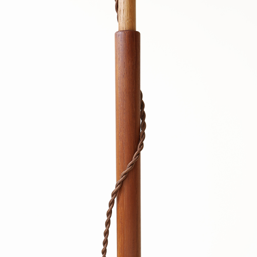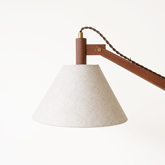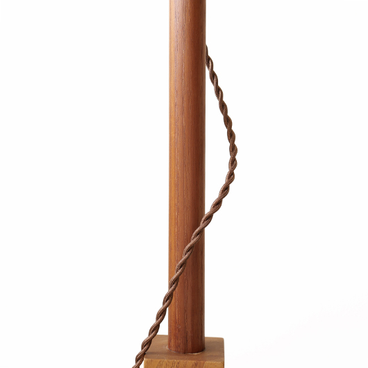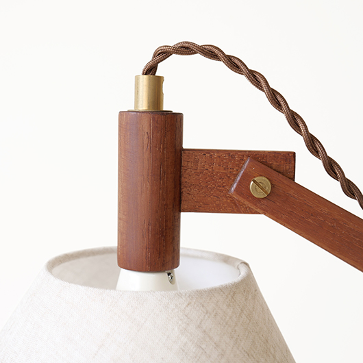 1950〜1960年代デンマーク製のヴィンテージフロアランプ。 支柱から斜めに伸びたフレーム、その先端に吊り下げられたシェードへと続く優美なフォルムが特徴的なデザインです。また上部にある真鍮ビスを緩めると、シェードの角度を変えることができます。 素材は土台と支柱の上方にオーク材、支柱の下方とアームにチーク材を用いており、色味の異なる2色樹種を交互に組み合わせたツートーンが効いています。それぞれのパーツに無垢材が贅沢に用いられているため、この時代ならではの上質な素材感やアーム部分の削り出しによる美しい造形なども見応えのあるポイントとなっております。そんな手間のかかる細やかな作りから推測し、量産品ではなくクライアントから依頼されデザインされたカーペンターメイドの一点物のような雰囲気です。ソファやロッキングチェアなどに合わせ手元を照らす読書灯などとして活躍してくれることと思います。 シェードは本体の形が美しく見えるように国内にてオーダーしたもので、明かりを灯すとリネンの生地の風合いがまた違った表情を作り出してくれます。新しく交換したコードなども、ヴィンテージの風合いに合うデザインをセレクトました。 電気工事士の資格を持つ職人によりソケット・配線・プラグ等の電気に関わる部分は全て交換し、電気用品安全法に基づいた点検なども行いPSEマークを表示しておりますので、新しいもの同様に安心してご使用いただけます(詳細下記ご参照)。 丁寧な修復を行い、全体的に綺麗な状態です(水色の丸箇所は天然木ゆえのもので、後天的なキズなどではありません)。そのほか細部の状態などは、画像をご参照ください。