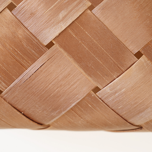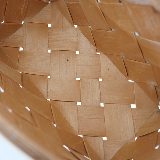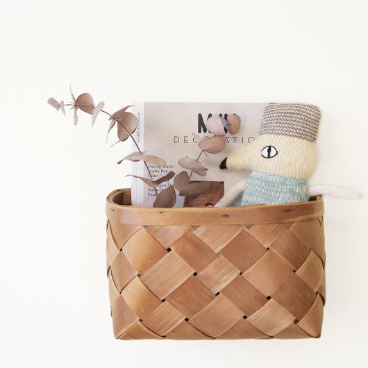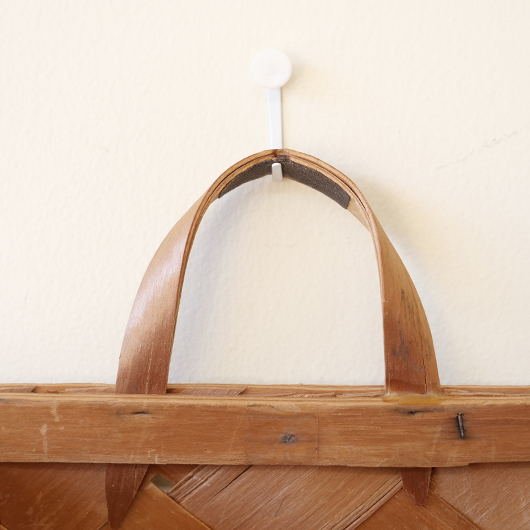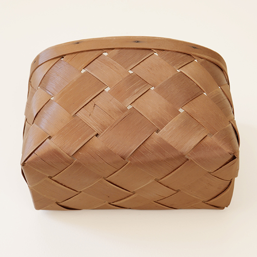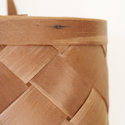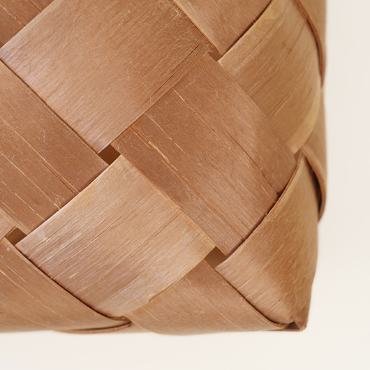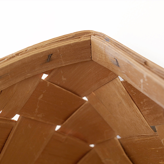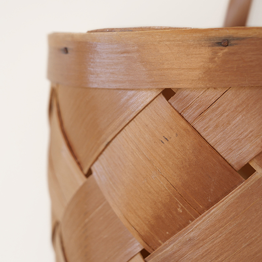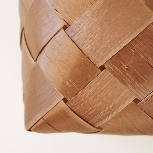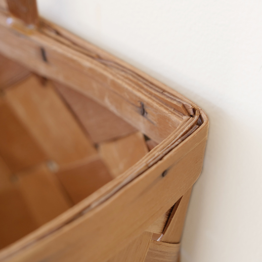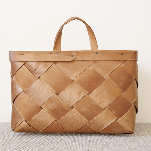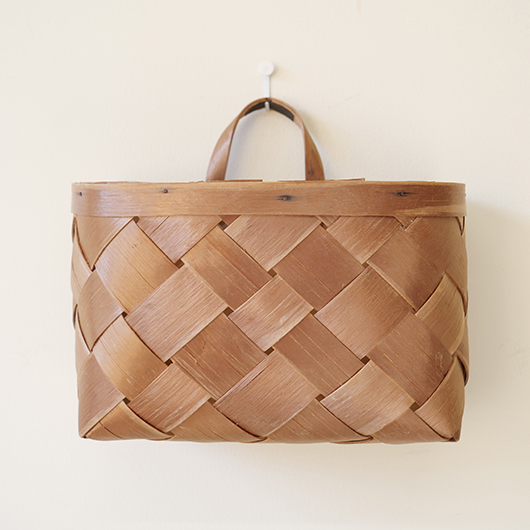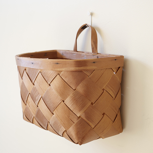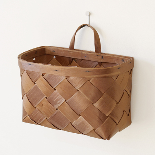 スウェーデン・ダーラナ地方で生まれた伝統手工芸品であるヴィンテージ バスケットSpånkorgの壁掛けタイプ。 横長サイズのバスケットは壁につけることを前提に背面はフラットに、正面は角をアールにしたやわらかなフォルムです。後方には引っ掛けるためのハンドルが付いています。 Spånkorg(スポーンコリ)とは、木材を薄く削いで作ったへぎ板(=Spån)を編んでバスケット(=korg )のこと。素材は北欧のパイン材が用いられています。 経年によって飴色に変化した木肌は、新品の白みの強いのものとは同じ樹種と思えないほどです。味わい深く経年変化した木肌からは、年輪に合わせてナイフで薄く削いでゆく職人の手仕事ゆえの荒々しさも感じます。 玄関先に取り付けて郵便物の簡易置き場にしたりと、ドライフラワーや冊子などの軽めのものを飾ることもできます。また底面の座りも良いためチェストなどの天板に壁付で置いて使用しても良さそうです。インテリアに取り入れるだけで、北欧ヴィンテージらしい雰囲気を運んできてくれます。 丁寧なメンテナンスを施しまして、全体として綺麗な状態を保っています。わずかな経年感が見られますが、雰囲気を損ねる程ではないかと思います。取っ手部分は裏から補強されており、割れないように大切に使われていたようです。そのほか細部の状態などは、画像をご参照ください。 ※壁に直接取り付けるタイプのため下記の注記をご覧ください