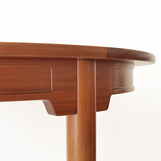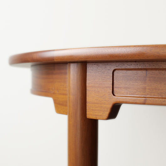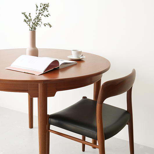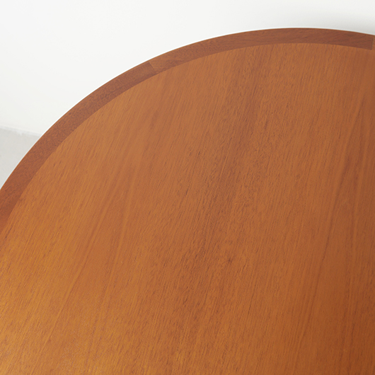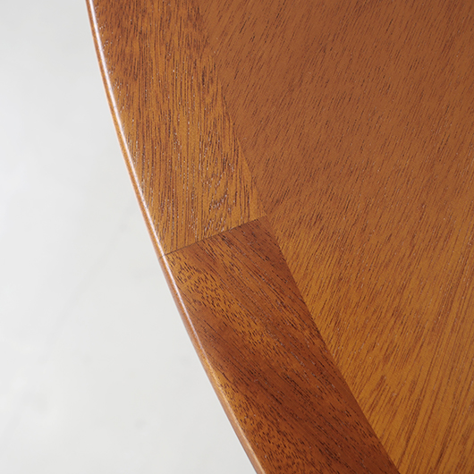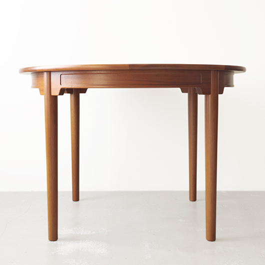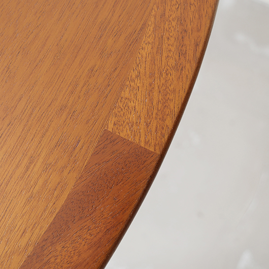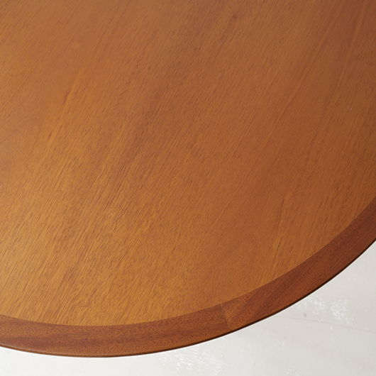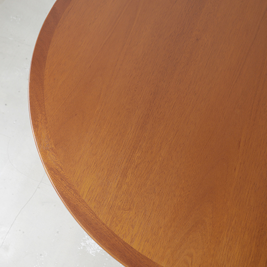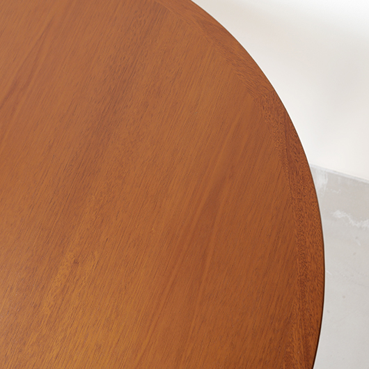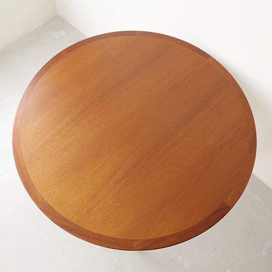 デンマークを代表するデザイナーのひとりHans J. Wegnerが1947年にデザインしました、PP Møbler製のヴィンテージ ダイニングテーブル PP76。 マホガニー材を用いた広々とした天板はおおらかな木目を見せ、縁には同素材の無垢材を回して当たりをやわらかくしています。 ウェグナーが学生の頃よりインスピレーションを受けていた17〜18世紀の椅子をより洗練されたものへと昇華するべくリ・デザインし、1944年にチャイナチェアを発表しました。こちらはそのチェアに合わせるために生まれたテーブルで、幕板に施された造形や脚部との接合部など共通点が見られます。元々はJohannes Hansenのためにデザインしたものでしたが、1991年に廃業した後はその下請けも行っていたPP Moblerが継続して製造を担いました(現在は廃盤となっています)。 直径110cmの絶妙なサイズ感で、チェア4脚を合わせてゆったりと使用することができます。チャイナチェアを合わせるのはもちろん、様々なチェアも受け止めてくれる洗練されたデザインです。画像中にあるチーク材の椅子なども合わせやすく、マホガニーはもちろんローズウッドなどの椅子も良さそうです。チャイナチェアは買い付けの際に現地デンマークでも見かけますが、何故かテーブルは見ることがありません。お探しの方は是非この機会にご検討いただければと思います。 全体を丁寧に研磨(サンディング)をして小キズや輪ジミを取り除き、その後に再塗装を行い、自然な艶の良い雰囲気に仕上がりました。多少の水濡れにも問題のない塗装を施しておりますので、安心してご使用いただけます。非常に綺麗な状態です。そのほか細部の状態などは、画像をご参照くださ ※脚部を外すことができない構造のため、このままの状態でのお届けとなります。事前に設置場所までの搬入経路(エレベーターの間口や階段の幅など)の確認を必ずお願いいたします。