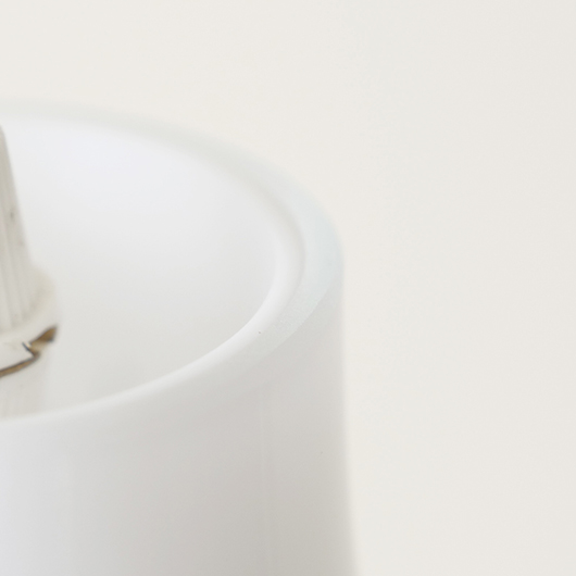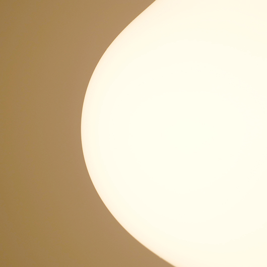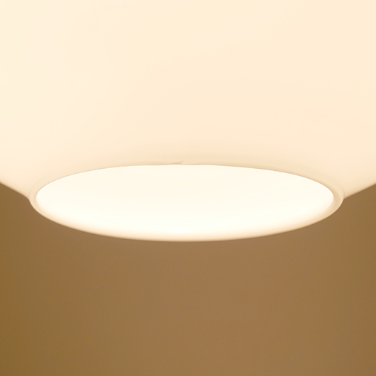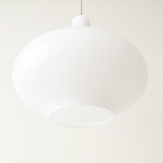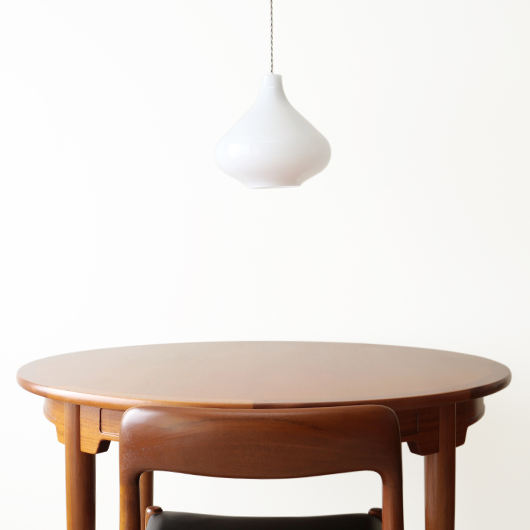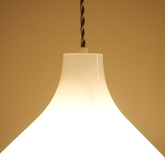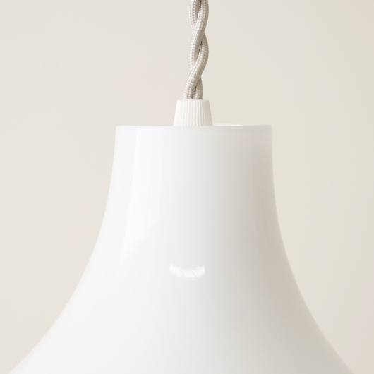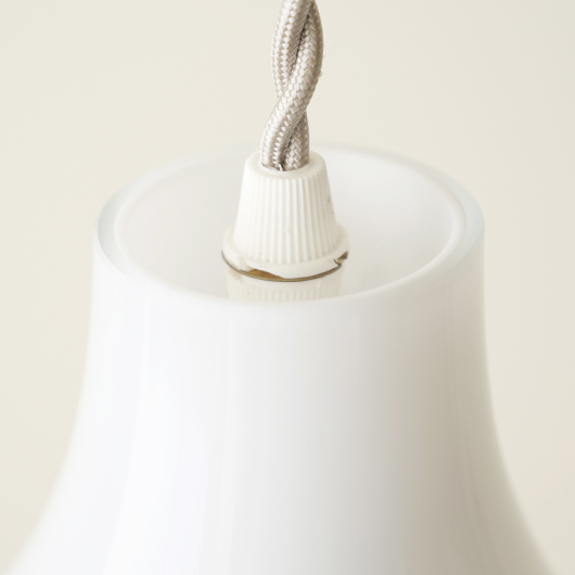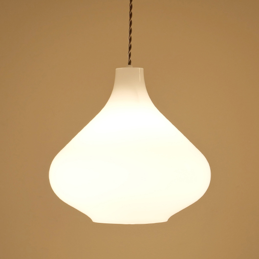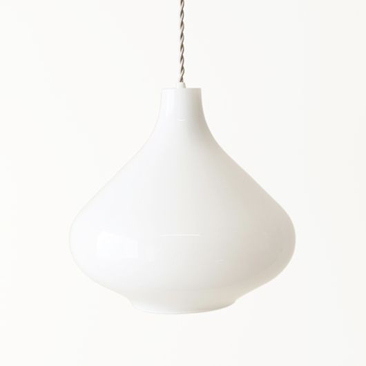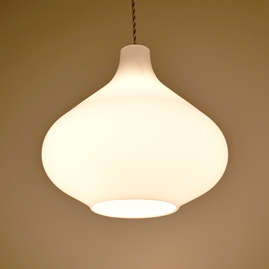 1960年代デンマーク製のヴィンテージ ペンダントランプ。 ぷっくりとふくらみをもつドロップ型は吹きガラスによるもので、シェード全体に光が回り空間へあたたかな明かりを届けてくれます。下方の少しすぼまった開口部はフォルムの要となっているほか、眩しさを感じさせない設計となっております。 そして艶のあるホワイト色に、ベージュのやわらかな雰囲気のコードを合わせました。 電気工事士の資格を持つ職人によりソケット・配線・プラグ等の電気に関わる部分は全て交換し、電気用品安全法に基づいた点検なども行いPSEマークを表示しておりますので、新しいもの同様に安心してご使用いただけます(詳しくは下記をご覧ください)。 光が透過するガラス製ゆえに開口部から下方への明かりだけでなく、空間全体をやわらかな灯りで包み込みます。ダイニングやリビングなど様々な場所で活躍してくれそうです。 目立ったダメージもなく、全体としてとても綺麗な状態を保っています。そのほか細部の状態などは、画像をご参照ください。