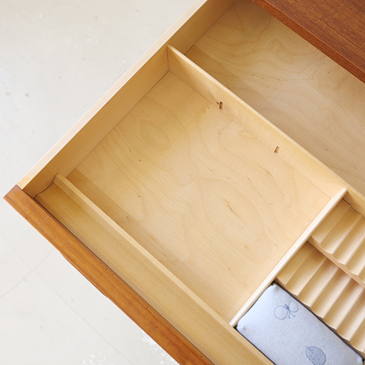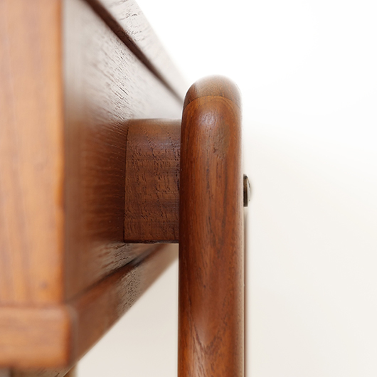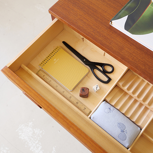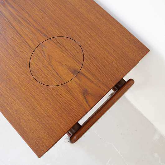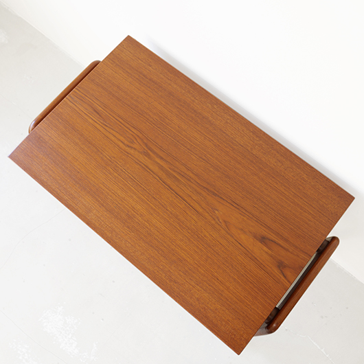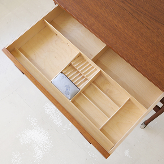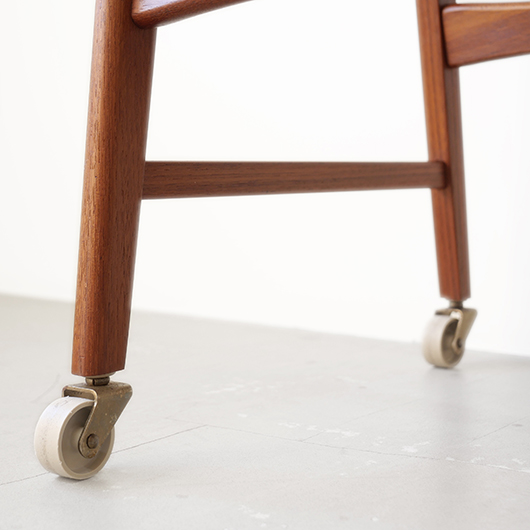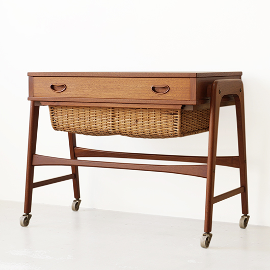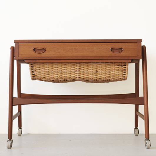 1960年代デンマークPovl Dinesen製のヴィンテージ ソーイングテーブル。 広い天板の下には引き出しが付き、内部は大小様々なサイズに仕切られた収納部となっています。さらに中央には大きなピンクッションがあるソーイングに特化した仕様。このピンクッションはmina perhonenの生地dop chouchoを使用して新しく張替えを行いました。 そして引き出し下にはラタンバスケットが備わり、本体のチーク材と相まって北欧ビンテージらしい雰囲気をまとっています。 本体を挟み込むように取り付けられたU字の脚部にはキャスターが付き、スムーズに可動します。本体と脚部との間にスペーサーが挟まれているため、浮遊感のある軽やかな印象を与えてくれます。 夜の長い北欧諸国では裁縫が盛んなゆえ、裁縫道具をひとまとめに収納できるこのような様々な家具が作られました。もちろん多目的に使用できるためソーイングにこだわらず、ソファ脇などに置いてリビングに散らかりがちな文具やリモコンなどのこまかなものを収納したりと、現代の暮らしに合わせた使い方が思い浮かびます。 丁寧な修復を行いまして、全体的に綺麗な状態です。天板に僅かなスレが見られますが、気にならない程度かと思います。ラタン部分も良好な状態を保っています。そのほか細部の状態などは、画像をご参照ください。