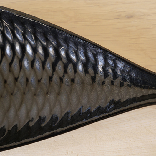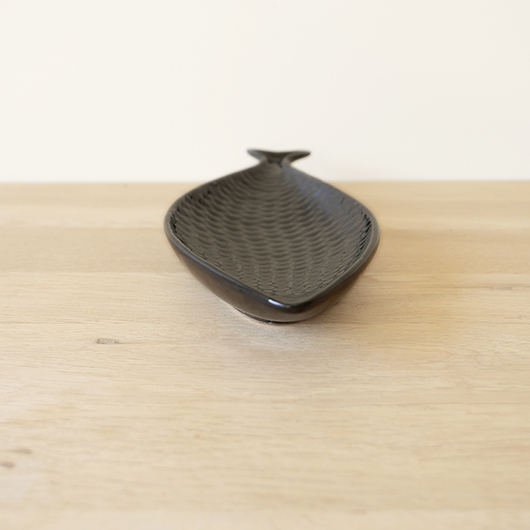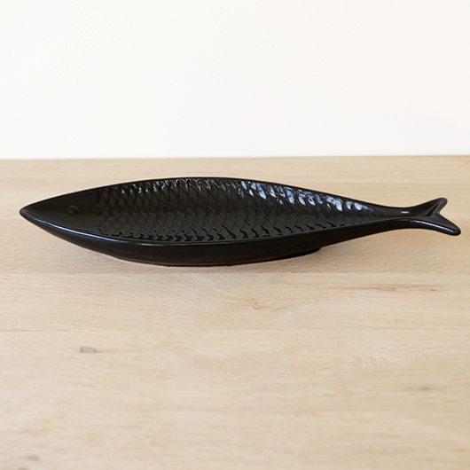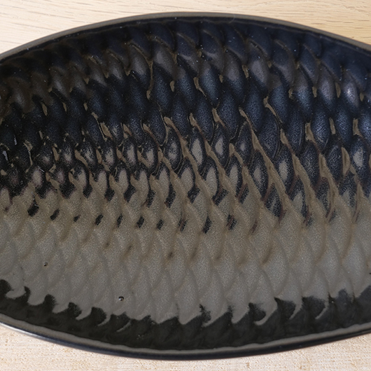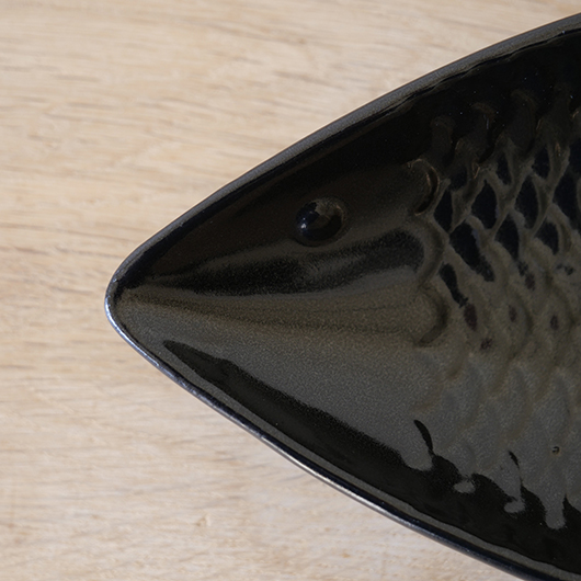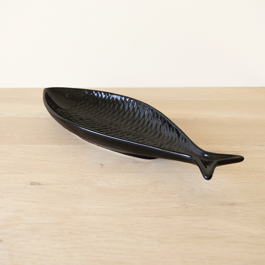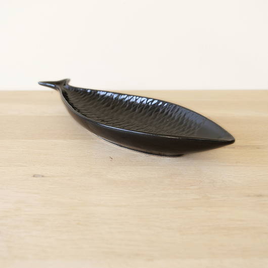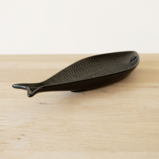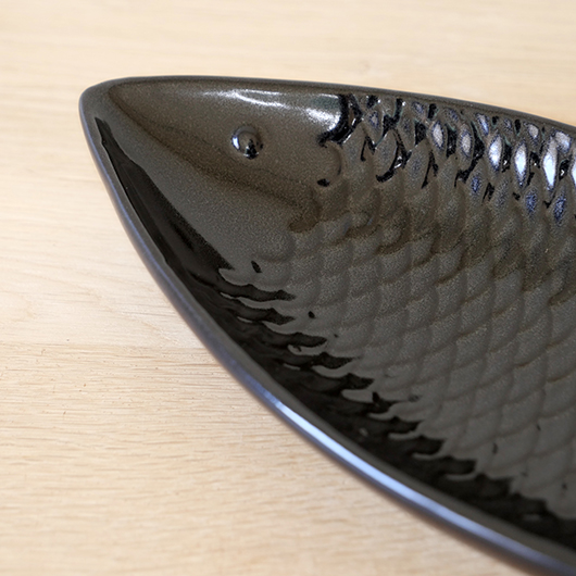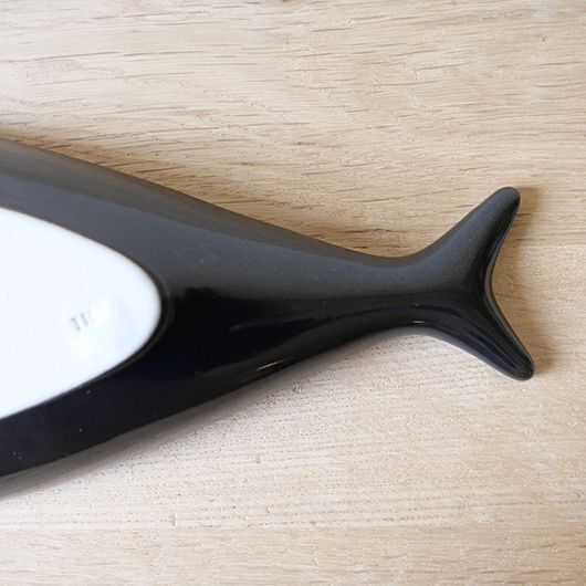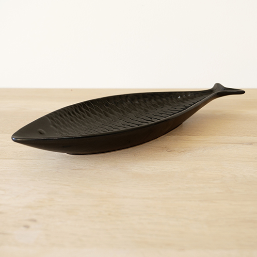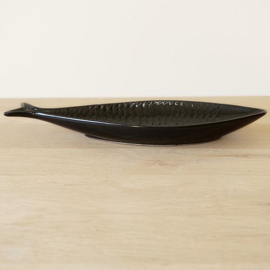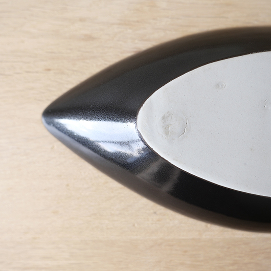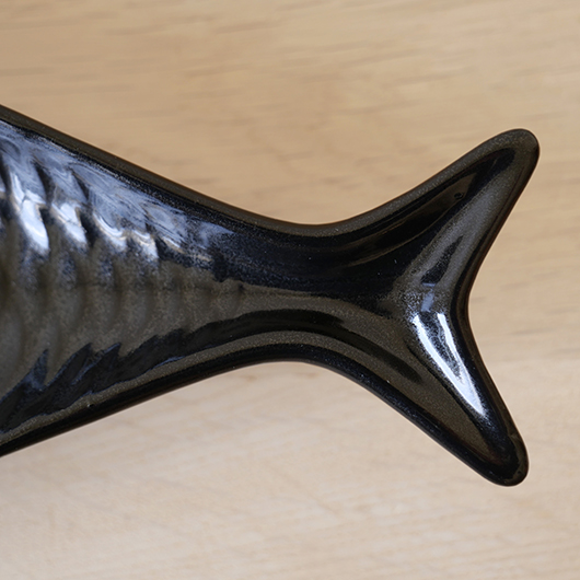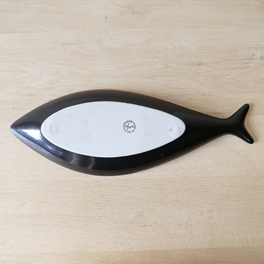 スウェーデンを代表するデザイナーの一人であるStig Lindbergが1958年にデザインしました、Gustavsberg製のプレートFladen。 魚型のフォルムにはつぶらな瞳と笑みをこぼす口元が凹凸で描かれた可愛らしさのあるユーモラスな作品で、元は北欧の定番料理であるニシンの酢漬けを盛り付けるために作られました。 通常はブラウン、ホワイト、グレーの3色の展開で、釉薬が薄めについているため鱗模様もくっきりと見えます。今回の品は限定色なのか見ることのない漆黒の釉薬でとても珍しい作品のようです。 横長のフォルムを生かして焼き菓子などを盛って来客時にお出ししたり、朝食時にフルーツを盛り合わせにしても良さそうです。さらに食品を盛り付けるだけでなく、お香立てをを置いて香皿としてしようしたり、アクセサリーや眼鏡を置くトレイなど、モダンな色味を生かしてインテリアとしても活躍してくれそうです。 漂白&殺菌をしっかり行いまして、ヒビやカケのない綺麗な状態です。そのほか細部の状態などは、画像をご参照ください。