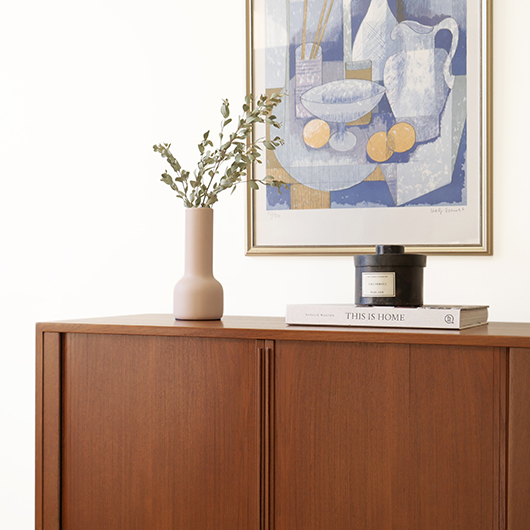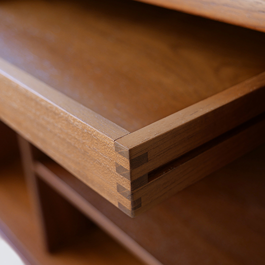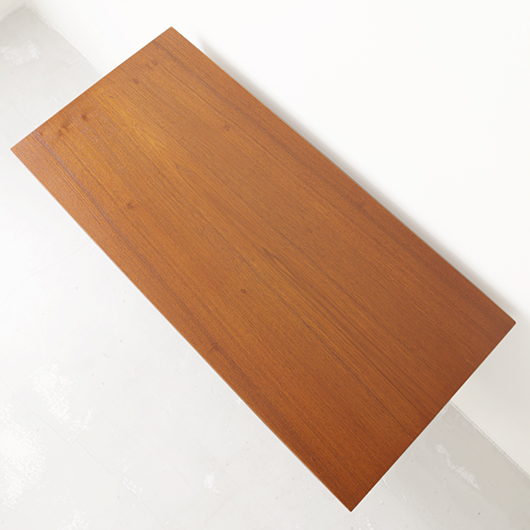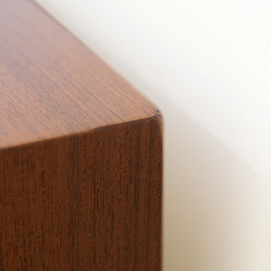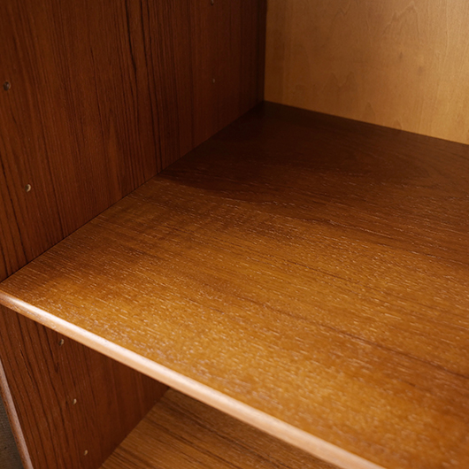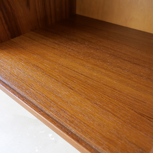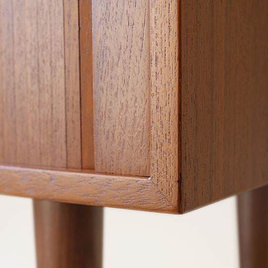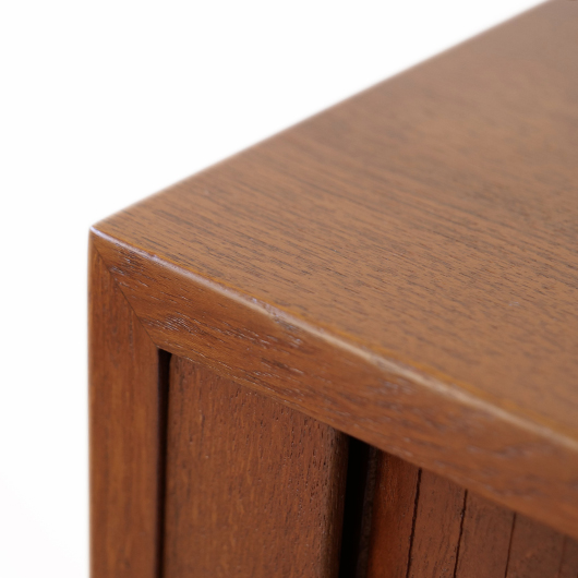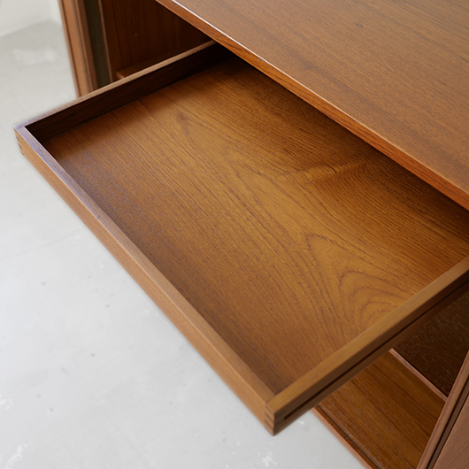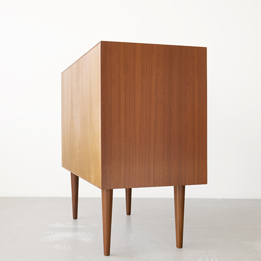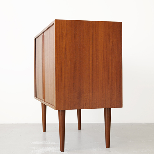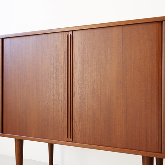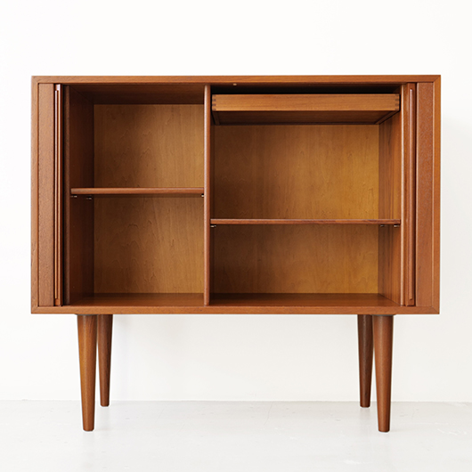 デンマークを代表するデザイナーの一人 Kai Kristiansenのデザインによる、Feldballes Mobelfabrik製のヴィンテージ ロールフロントキャビネット。 正面のチーク材の美しい木目をよく見ると細かなスリットが入っており、取っ手を横に引くとスルスルと側面に回り込む蛇腹式の扉となっています。この近くで見ても分からないほどのスリットに、職人の高度な技術が伺えます。取っ手はチーク無垢材の指掛かりのよい、シンプルかつ美しいデザインです。 扉の内部は左右に仕切られておりそれぞれに可動式の棚板が一枚ずつと、右側にはレタートレイが付属したスペシャルな作りです。このトレイはA4サイズが縦横どちらでもゆったりと入れることができます。 リビングの片隅に置くだけで、目を惹く存在感があります。天板に小物などを飾ったり壁面に絵画を合わせたりと、日々の暮らしの中で活躍してくれそうです。 全体を丁寧にサンディング(研磨)した後に再塗装を行い、全体的に綺麗な状態に仕上がりました。そのほか細部の状態などは、画像をご参照ください。