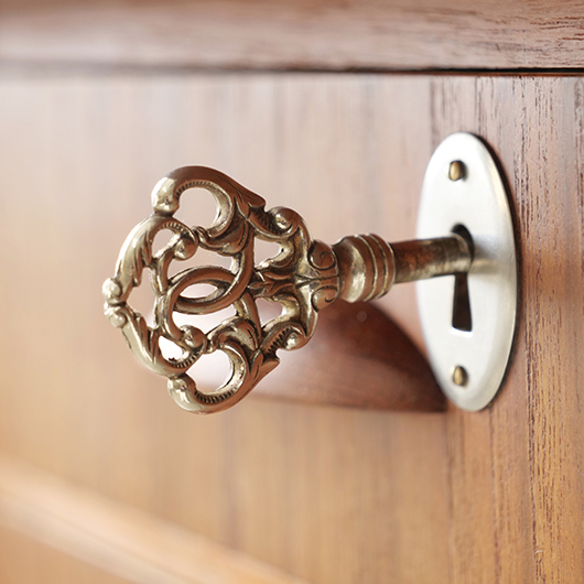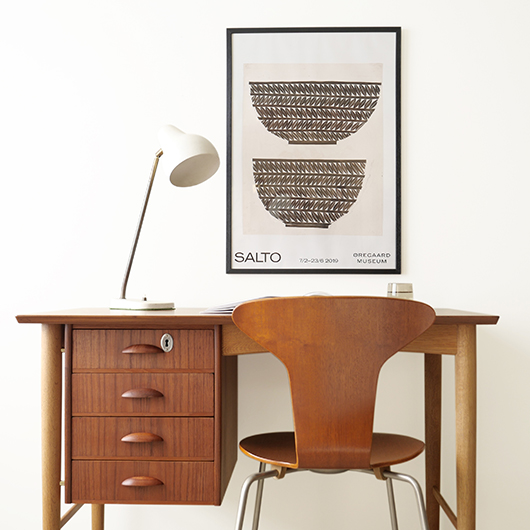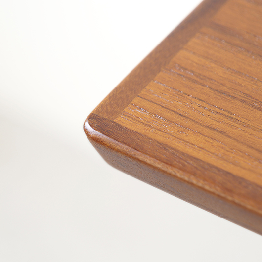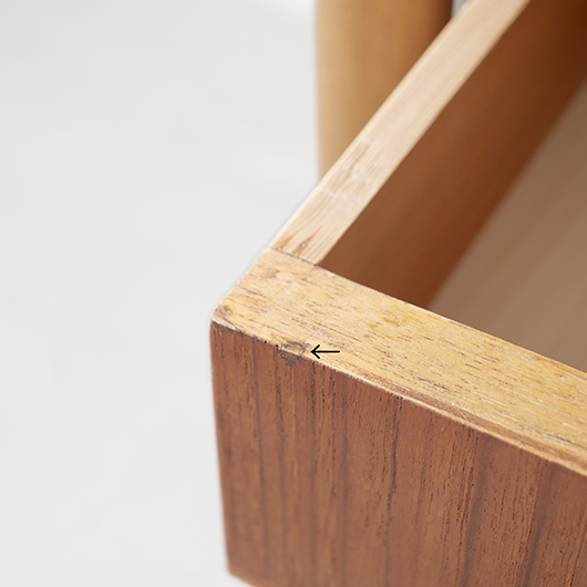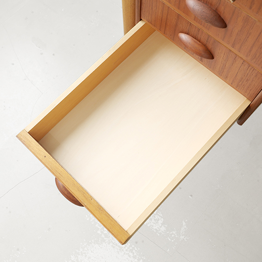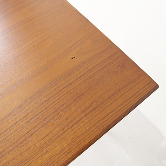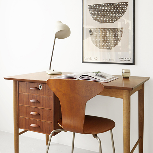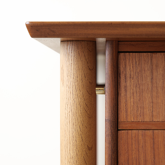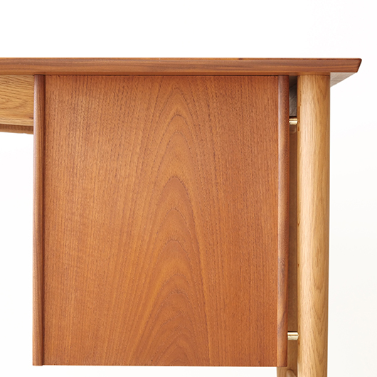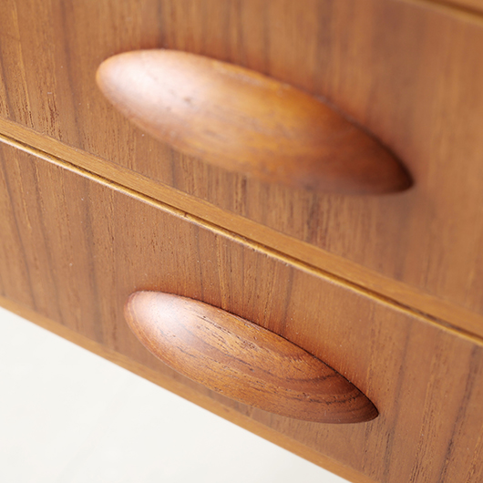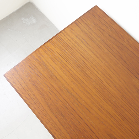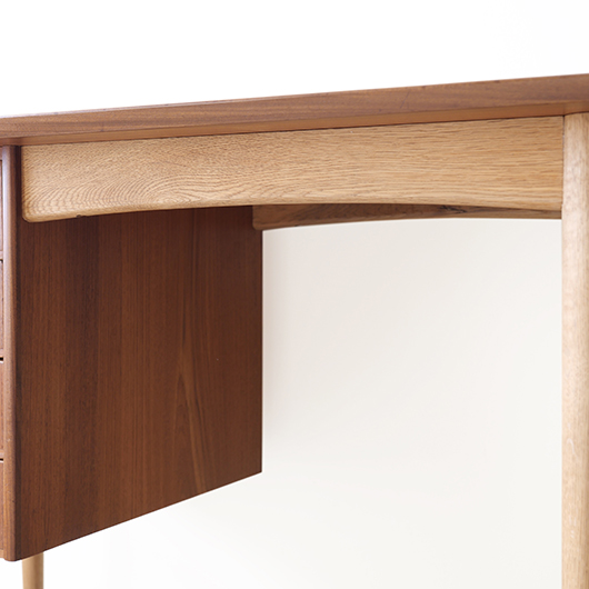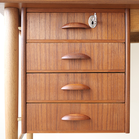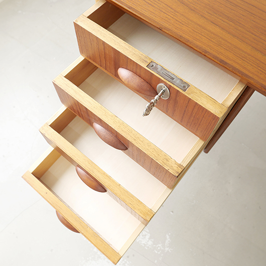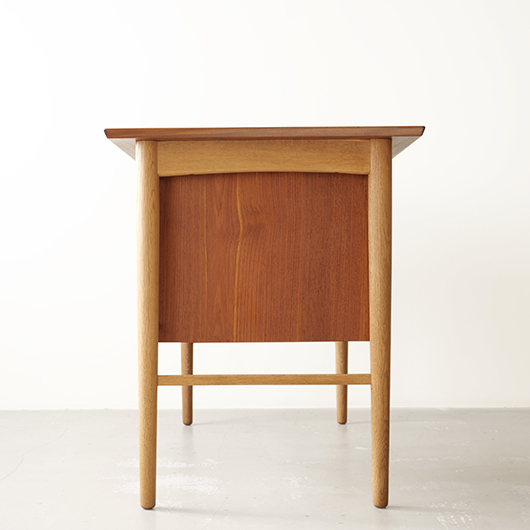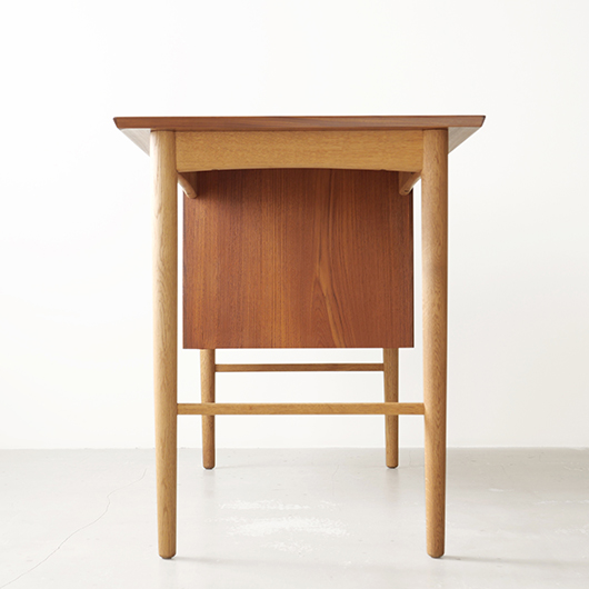 1950年代デンマーク製のヴィンテージデスク。 広々とした天板にはチーク材の大らかな木目が広がり、エッジにはテーパーがかけられ当たりをやわらかくしています。その下左側に4段の奥行きのある引出しが備わり、チーク無垢材の削り出しによるアーモンド形の取っ手がアクセントとなっています。最上段には雰囲気のある鍵が付属しており、貴重品などの保管にも良さそうです。 天板下からスラリと伸びた丸脚はテーパーが掛けられており、すっきりとした佇まいです。ポイントとなっているのは引出しのある収納部と脚部の間にある真鍮のスペーサーで、僅かな間が空いていることで軽やかさを感じるデザインです。素材は天板や収納部にチーク材、脚部やフレームにオーク材が用いられており、色味の異なる樹種によるコントラストが効いています。緩やかに弧を描く天板下の幕板も印象的です。 当時のデンマーク製のデスクは大きなサイズがとても多い中、こちらは小ぶりなサイズ感のため書斎や子供部屋での使用はもちろん、リビングの一角にパソコン机として置いても他のインテリアともすんなり馴染むことと思います。 丁寧な修復を行いまして、全体的に綺麗な状態です。わずかに小キズなど残りますが、雰囲気を損ねる程ではないかと思います。底板の引き出しは全て新しく交換しております。そのほか細部の状態などは、画像をご参照ください。