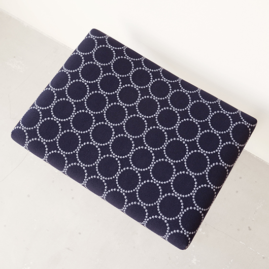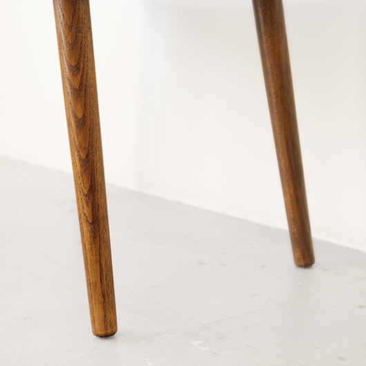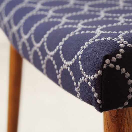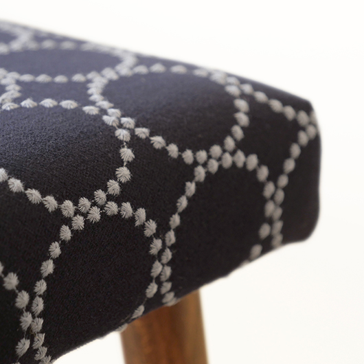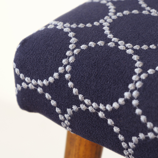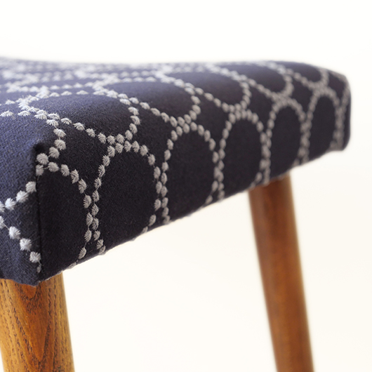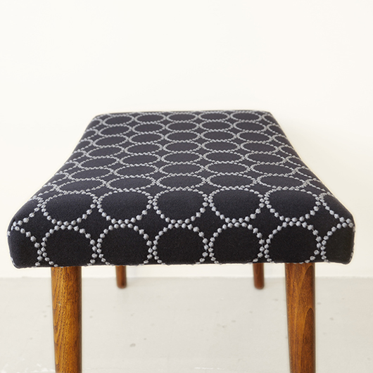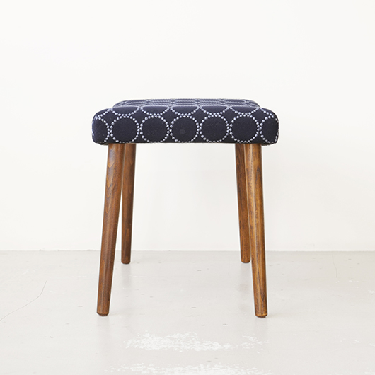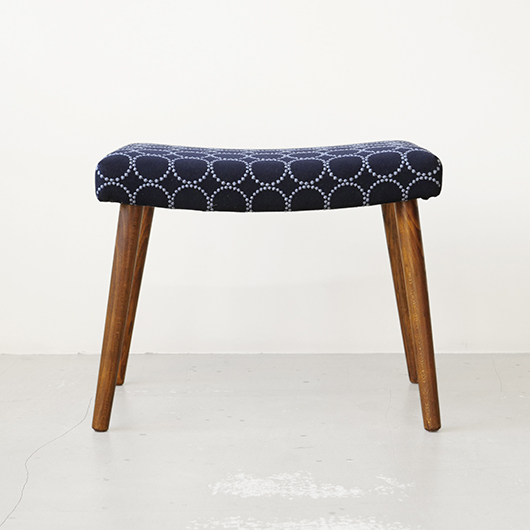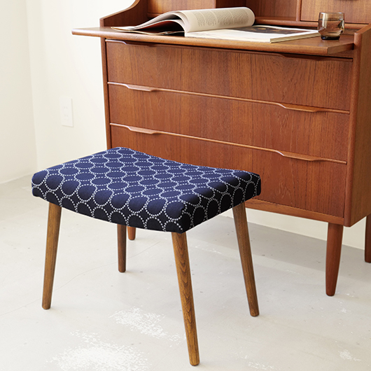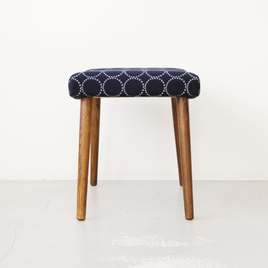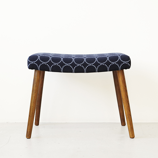 1960年代デンマーク製のヴィンテージスツール。 座面はゆるやかなカーブを描いており、座った際に体にフィットしてくれます。そしてその下からは丸脚が末広がりにスッと伸びています。 ベンチ部分にはmina perhonenの生地 dop tambourineにて張り替えを行いました。落ち着きを感じるインディゴに同系色ライトブルーの糸で刺繍が施された物語性を感じるファブリックが、フレームを引き立ててくれます。 玄関先に置いて靴を履く時に使用したり、ソファに合わせてオットマンとして利用したりと、日々の暮らしの中で幅広く活躍してくれることと思います。 丁寧な修復を行いまして全体的に綺麗な状態です。脚部にわずかな反りが見られますが、ガタつきもなくご使用には問題ないものです。そのほか細部の状態などは、画像をご参照ください。