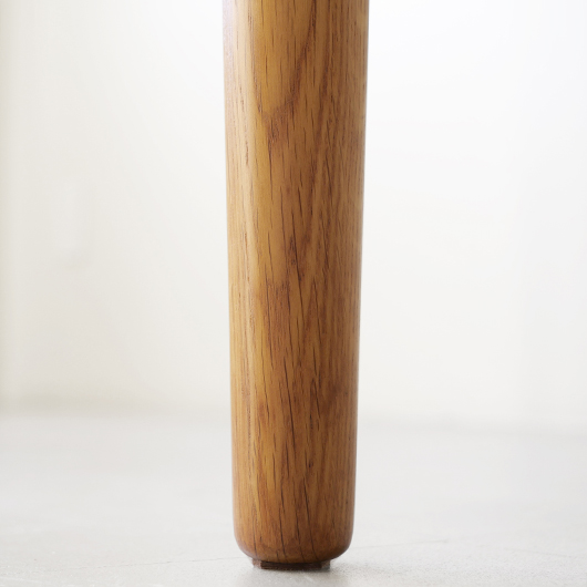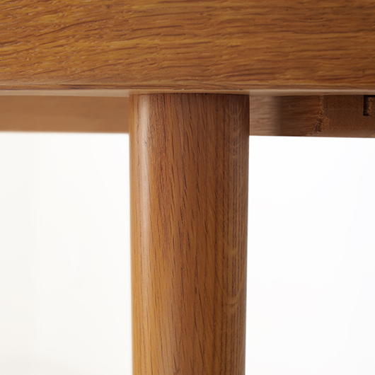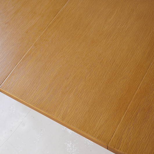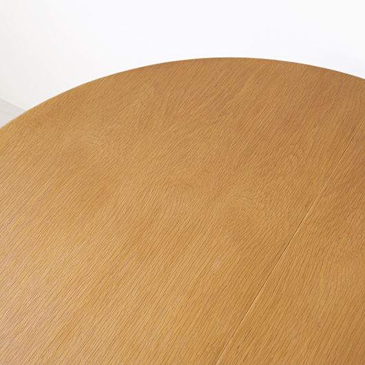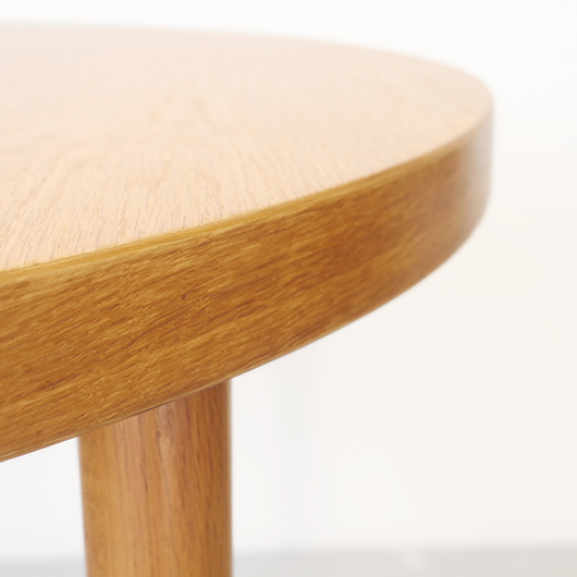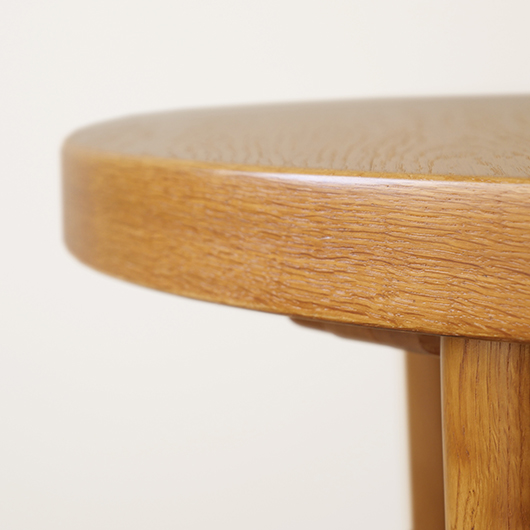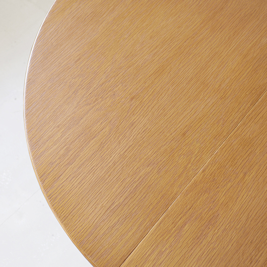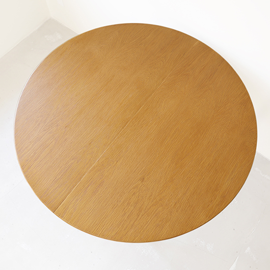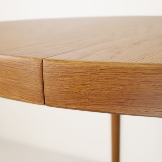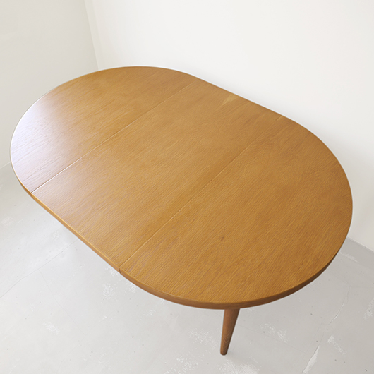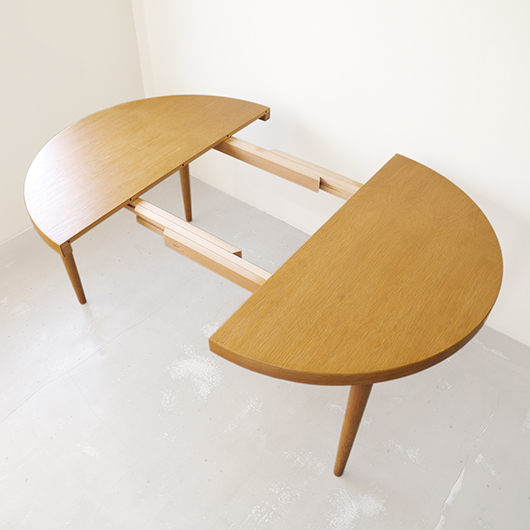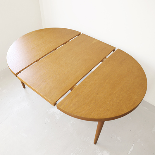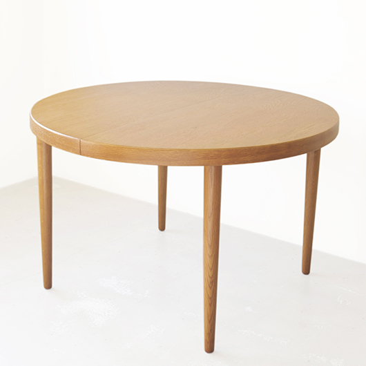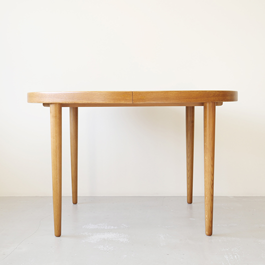 1960年代デンマークSchou Andersens Møbelfabrik製のヴィンテージラウンドテーブル。 円形で広がりを感じる天板にはオーク材が用いられ、やわらかな色味と穏やかな木目が印象的です。この時代のダイニングテーブルの多くに見られる天板下の幕板を排除した構造により、非常にすっきりとした印象に仕上げられています。そして天板のエッジは角を落として当たりをやわらかくしたりと、デザイン面だけではなく使い心地を考えた造りであることを、使用していくうちに実感していただけると思います。 通常は円形の4人掛けテーブルとしてゆったりと、エクステンション(伸張)板を用いてオーバル型の6人掛けとしてもご使用いただけます。 Schou Andersensのダイニングテーブルでオーク材仕様のタイプは他の樹種と比べ少なかったようで、なかなか出会うことがありません。 全体を丁寧に研磨(サンディング)をして小キズや輪ジミを取り除き、その後に再塗装を行い、自然な艶のとても良い雰囲気に仕上がりました。多少の水濡れにも問題のない塗装を施しておりますので、安心してご使用いただけます。また修復時には天板と伸張板との色味を合わせることを心がけており、オーバル型で使用した際も、伸ばしていることを忘れる使い心地です。全体として非常に綺麗な状態です。そのほか細部の状態などは、画像をご参照ください。