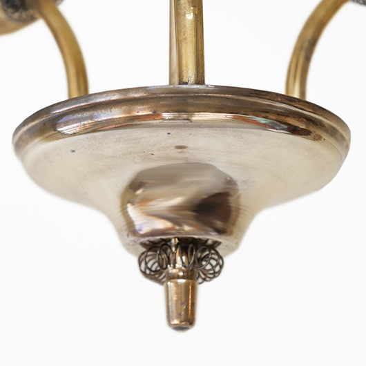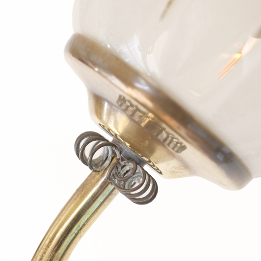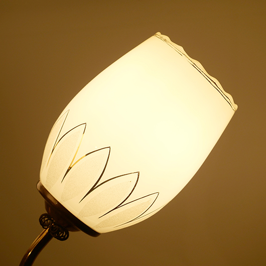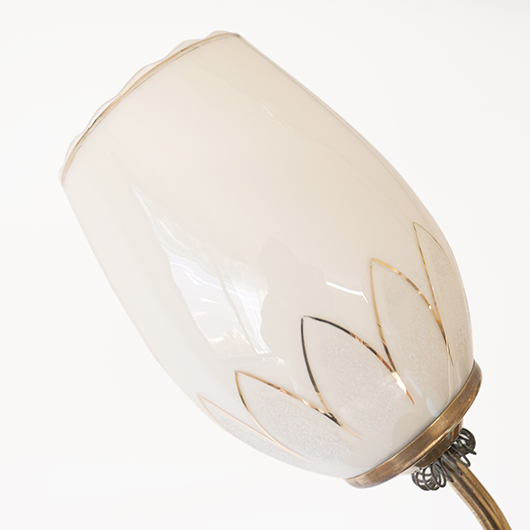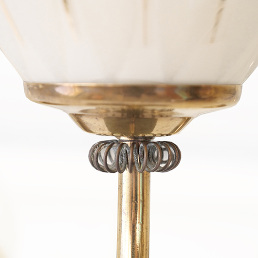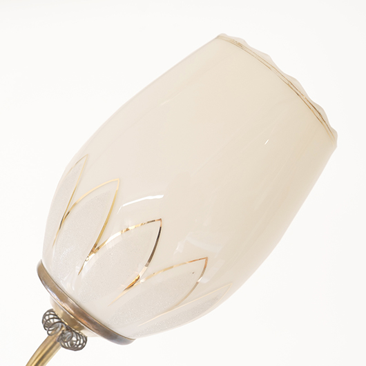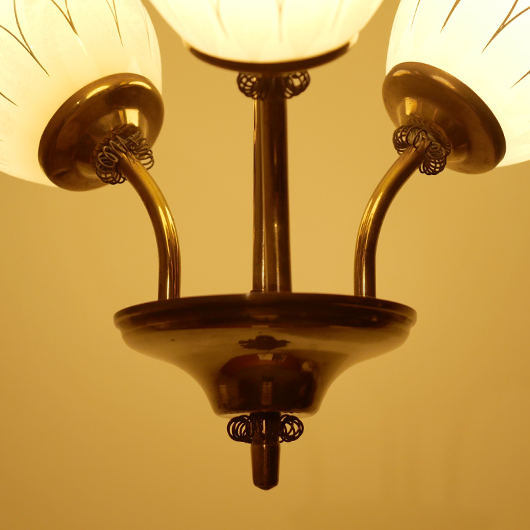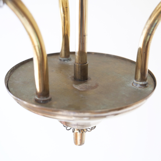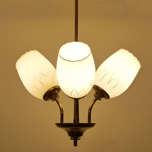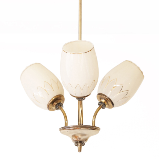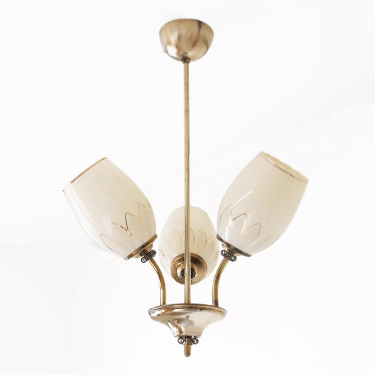 1940〜1950年代フィンランドItsu製のシャンデリア 。 真鍮製のステムを中心に、放射状に3灯のシェードが囲んでいます。ガラス製のシェードは上部がレースのように波打った釣鐘の形をした花を模しており、ゴールド色で花弁を描きその中を白色の装飾で彩っています。 シェード下の土台は花のガクを模し、下側に真鍮のコイルで装飾しています。当時の資料を見ると6灯タイプなど、少しずつ異なるデザインが見られます。こちらはシンプルな印象で、可憐さのある絶妙な匙加減です。 電気工事士の資格を持つ職人によりソケット・配線・プラグ等の電気に関わる部分はすべて交換し、電気用品安全法に基づいた点検なども行いPSEマークを表示しておりますので、新しいもの同様に安心してご使用いただけます(詳しくは下記をご覧ください)。 とても雰囲気のあるシャンデリアで、サイズ感も程よくダイニングテーブルの上やリビングなどの日常空間を華やかに彩ってくれることと思います。 丁寧な修復を施しまして、全体的に綺麗な状態です。シェードはトップに僅かなスレなどありますが綺麗な状態を保っています。そのほか細部の状態などは、画像をご参照ください。