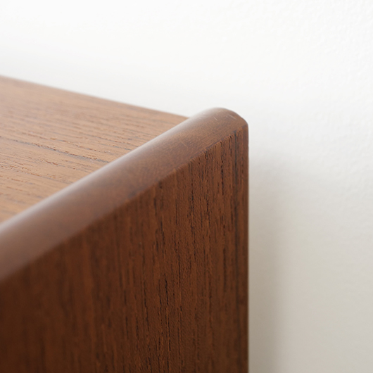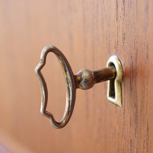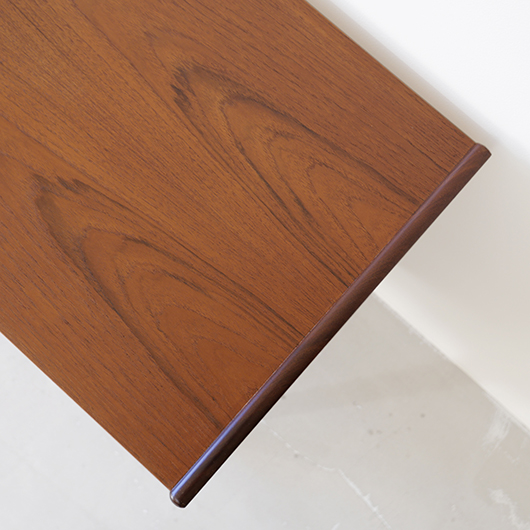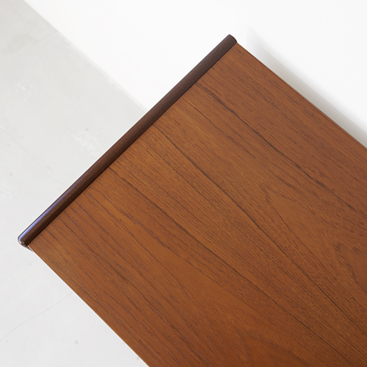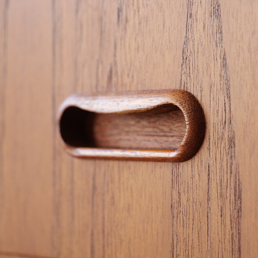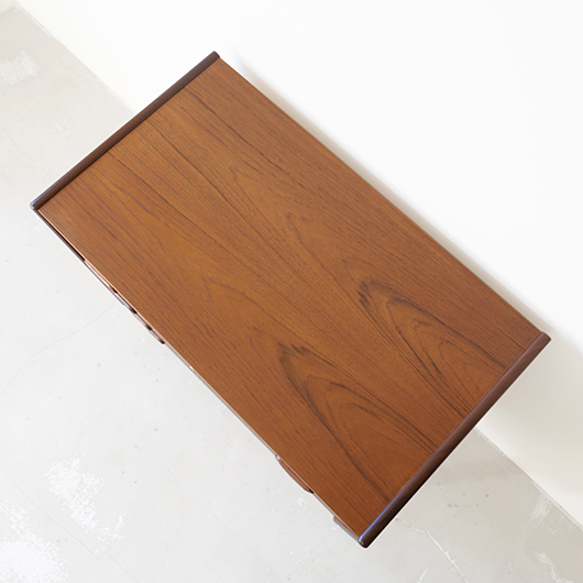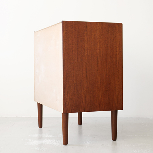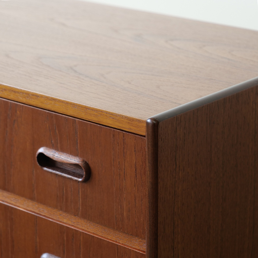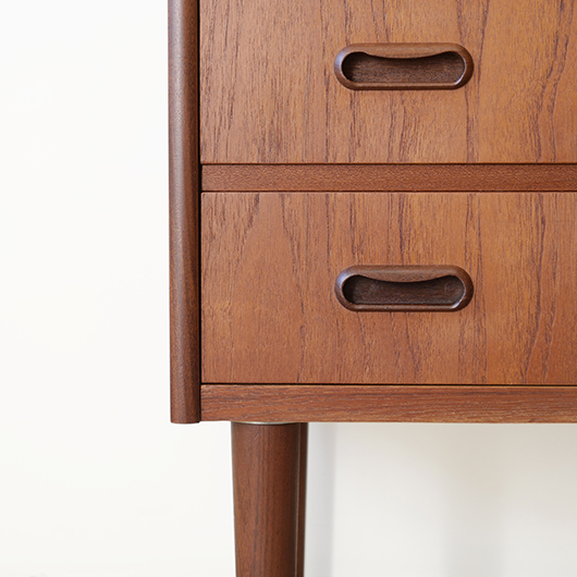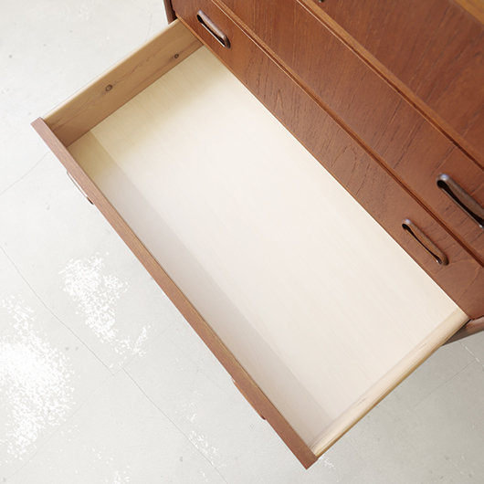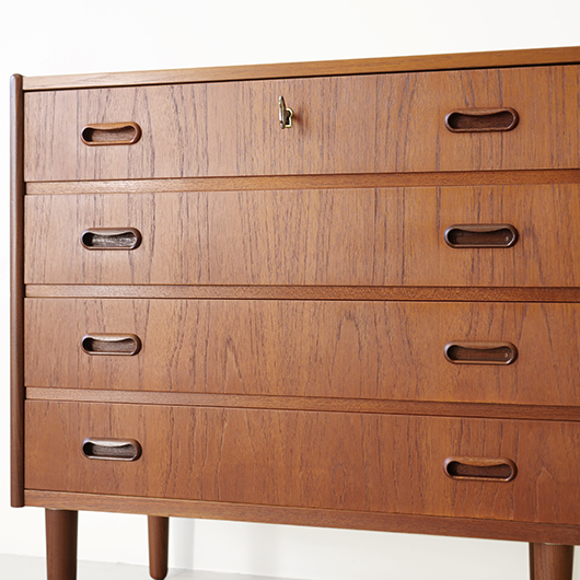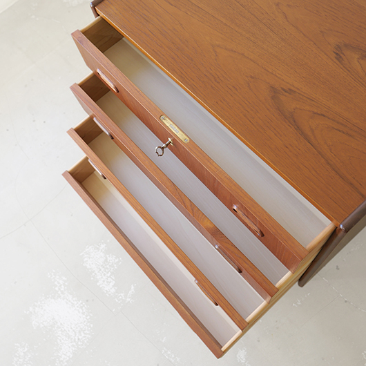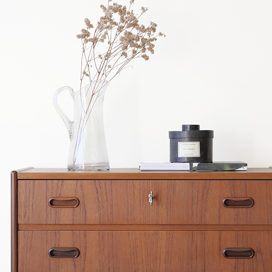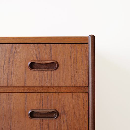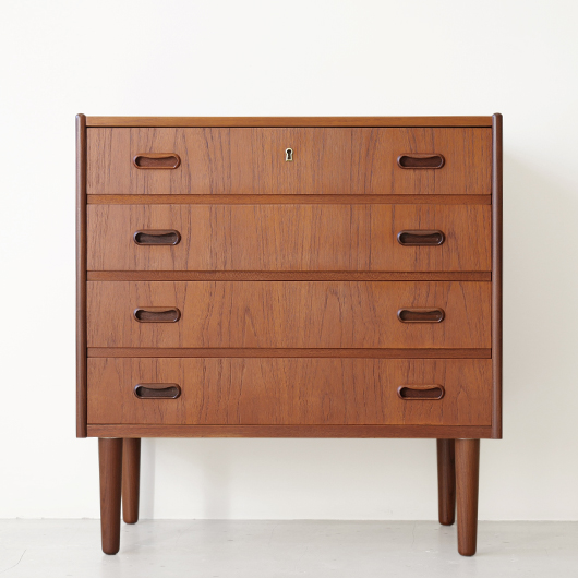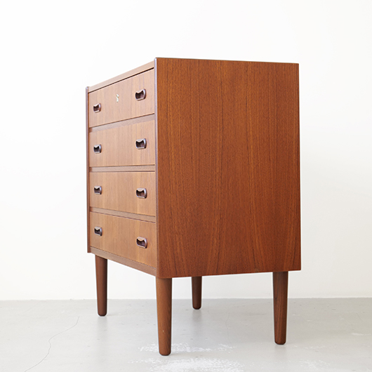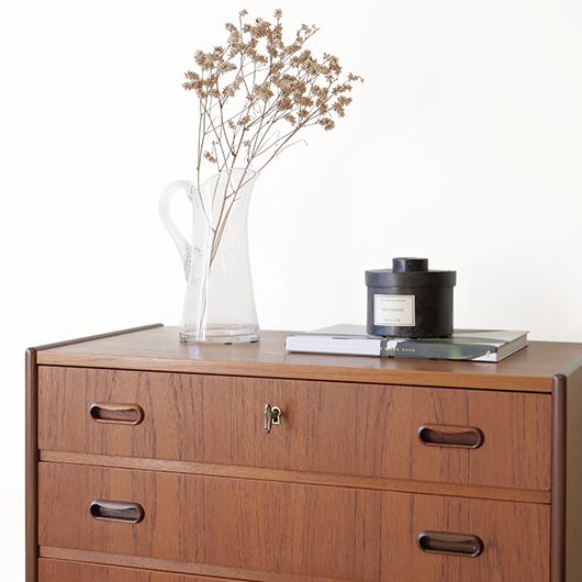 1960年代デンマーク製のヴィンテージ4段ミディアムチェスト。 収納力のある引き出しが4段付き、丸みを帯びたチーク無垢材の刳り貫きによる楕円形の取っ手は指かかりも良く、このチェストのポイントになっています。そして脚部や本体側面の小口にはアフリカンティークの無垢材を回し、フォルムの輪郭を際立たせています。 引出しの最上段には鍵が付属しておりますので、貴重品などの保管にも良さそうです。そして木目が上下に揃っていることも、丁寧に作られたデンマーク製ヴィンテージらしさのひとつです。 リビングや寝室などに置いて、衣類などを収納していただけます。美しい木目が印象的な広い天板にはお気に入りの小物はもちろん、テーブルランプやフラワーベースなどのディスプレイにも良さそうです。高さを抑えた絶妙なサイズ感のため、空間に取り入れやすい一台と思います。 丁寧な修復を行いまして、全体的に綺麗な状態です。引出し底板は新しいものに交換しておりますので、清潔にお使いいただけます。そのほか細部の状態などは、画像をご参照ください。