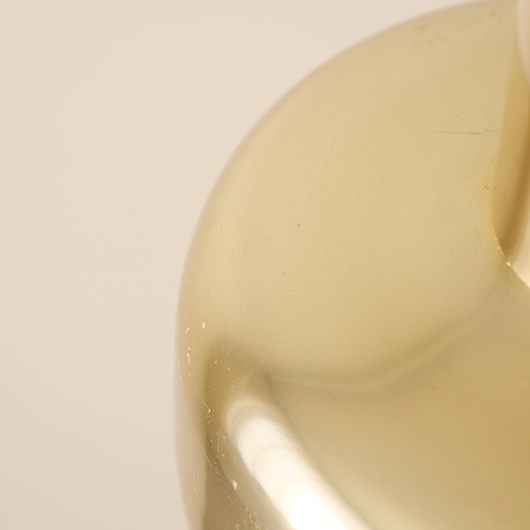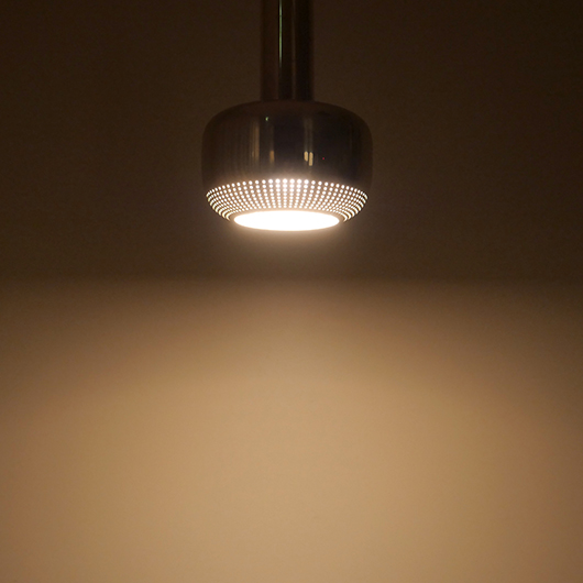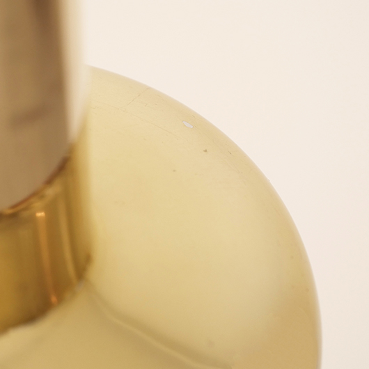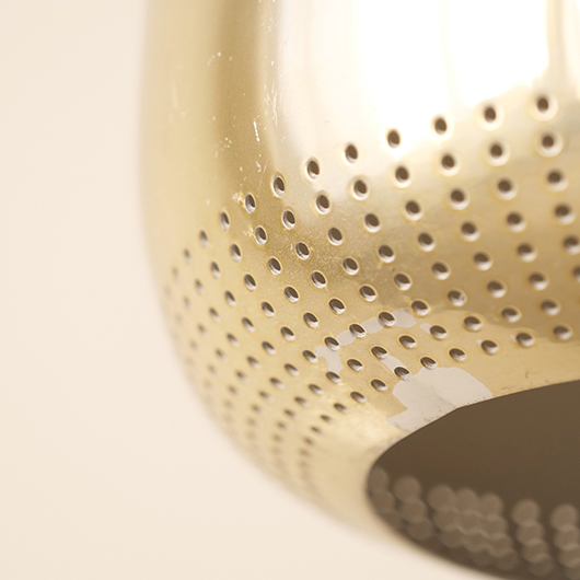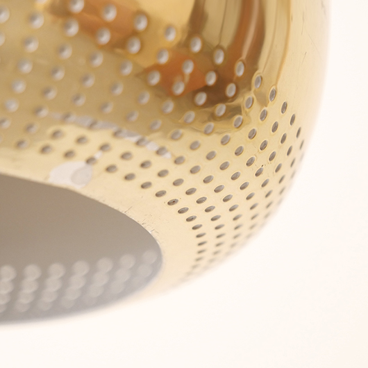 コペンハーゲン国際空港などを手掛けたデンマークを代表する建築家 Vilhelm Lauritzenが1956年にデザインした、Louis Poulsen製ヴィンテージ ペンダントランプ Gullpendel No.16528。 円柱型の支柱からふわりと膨らんだシェード部分からなる真鍮製のペンダント。特徴となっているのはシェード下方部分で、開口部を囲むように細かな孔が幾重にも重なっています。日中は控えめなデザインのアクセントとして映るドット模様は、明かりを灯すと光源を隠す役割として眩しさを感じさせないグレアフリーの明かりを作り出してくれます。 この照明は元々コペンハーゲン市内にあったFolkets Husのためにデザインされたもの。建物の設計はもちろんのこと照明や家具、ドアハンドルなど細部に至るまでのすべてのデザインを自身で行ったそう。そんな労働運動の拠点として建てられた建物は一時幕を閉じましたが、現在ではコンサートホールVEGAとして新たな時を刻んでいます。このペンダントも今もなおホール脇のバーのカウンターで活躍中であることが、デザインを愛し大切にするデンマークならではの素晴らしさかと思います。 下方へ明かりを届ける設計のためダイニングテーブルはもちろんのこと、カウンターやサイドテーブルなどの上に吊り下げれば、雰囲気あるコーナーを作り出してくれます。 こちらはコードの長さを簡単に調節できる機能を備えており、筒を持ち上げて内部のアームに巻き付けることで短くもできます。コード交換時に予め長めに巻いてありますので、吹き抜けや天井の高い空間でもお使いいただけます。 電気工事士の資格を持つ職人によりソケット・配線・プラグ等の電気に関わる部分は全て交換し、電気用品安全法に基づいた点検なども行いPSEマークを表示しておりますので、新しいもの同様に安心してご使用いただけます(詳しくは下記をご覧ください)。 丁寧な修復を施しまして、全体として良好な状態を保っています。シェード表面に剥がれや小キズや僅かな凹み箇所など見られます。ヴィンテージの味わいとして雰囲気を増してくれる要素のひとつかと思いますがそれらを考慮したお値段となっております。そのほか細部の状態などは画像をご参照ください。