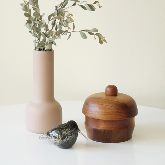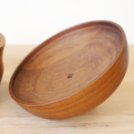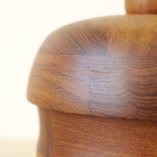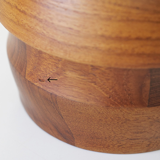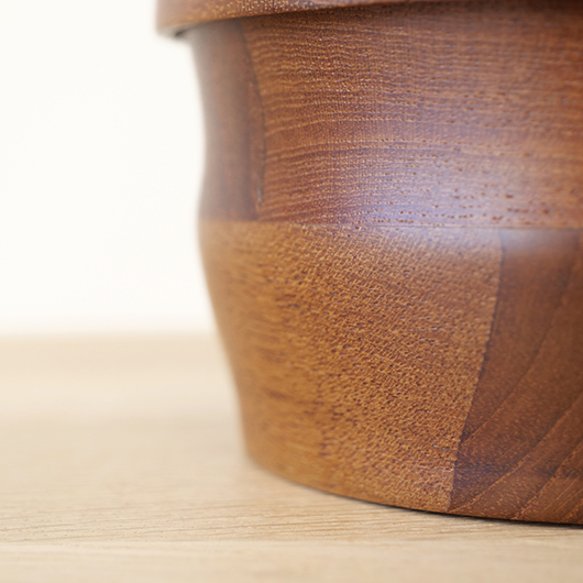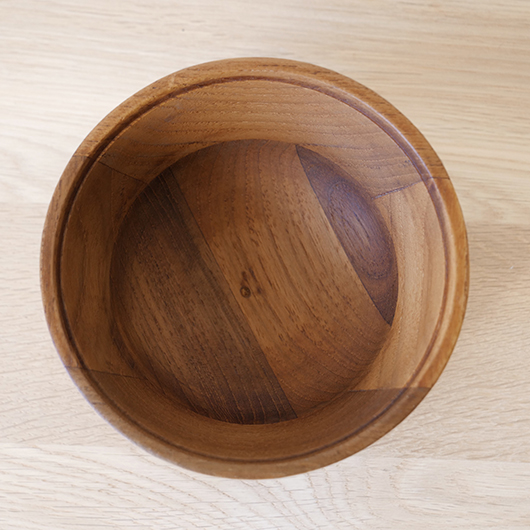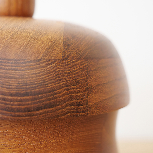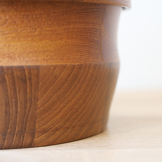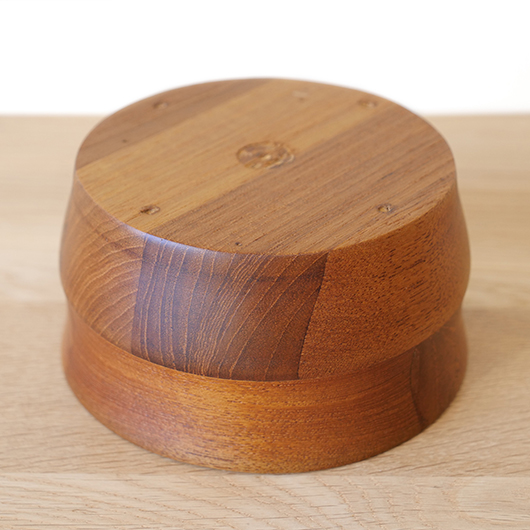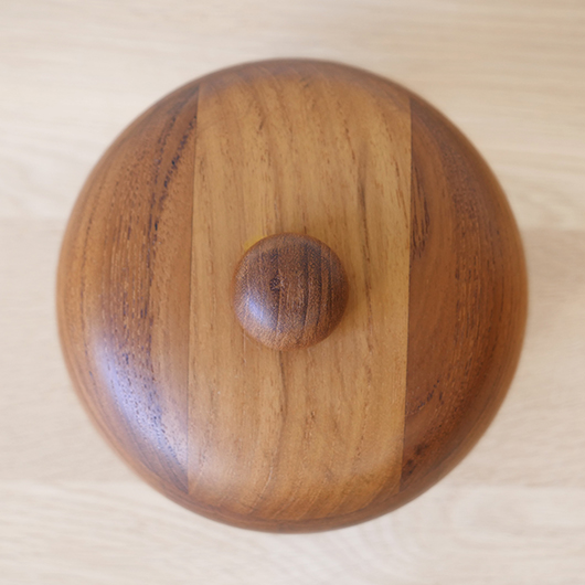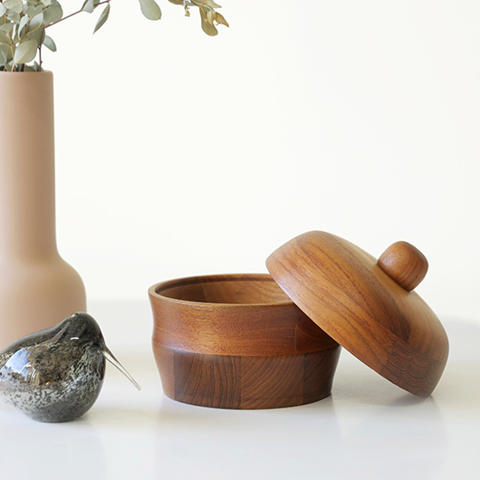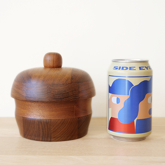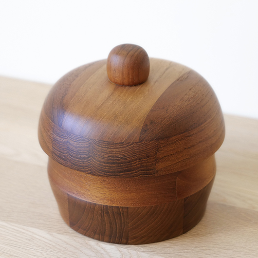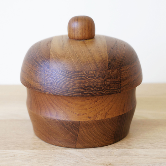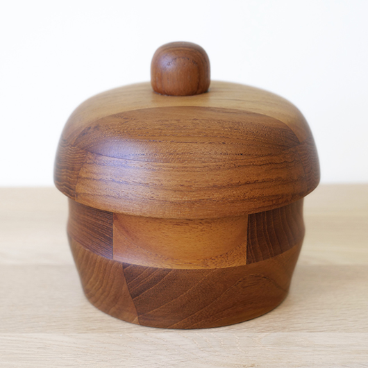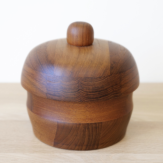 デンマークで買い付けましたヴィンテージキャニスター。 コロンと半円状の蓋には丸いツマミが付き、持ってみると想像以上の厚みに驚くほどです。本体側には一段くびれをつけてスッキリとした印象となっています。本体側も同じく厚みがあり、全体としてチーク無垢材のボリューム感を生かしています。 なめらかなフォルムはウッドターニング(挽物)の技術を生かしたもので、その職人の高い技術とデザイン性が際立っています。また接ぎ合わせた木目や色味がまるで模様のようにあたたかみを感じます。 玄関先で鍵の所定位置にしたり、チェストやカウンターに置いておくだけでも絵になる存在感があります。ポプリを中に入れて蓋を開けた状態にしておいても素敵です。 丁寧なメンテナンスを施し、全体的に綺麗な状態です。わずかな小キズが見られますが、まず気にならない程度かと思います。そのほか細部の状態などは、画像をご参照ください。