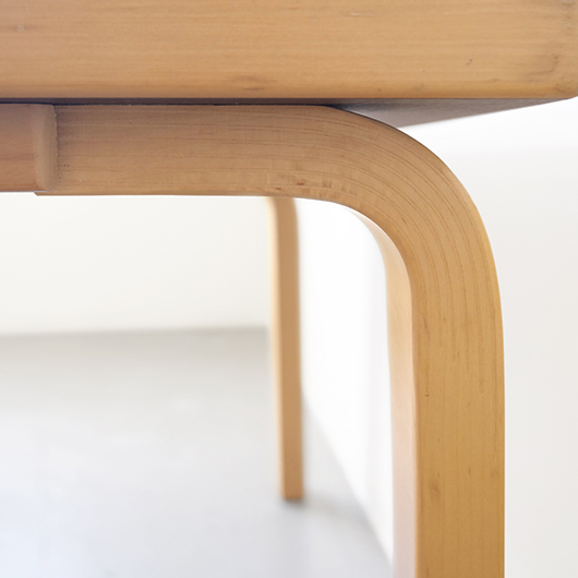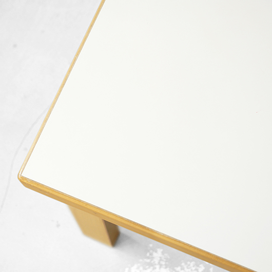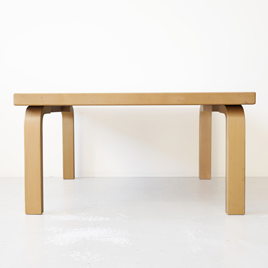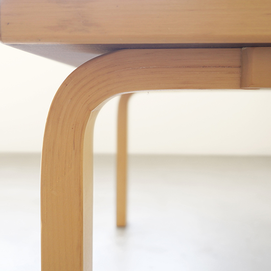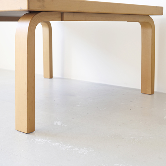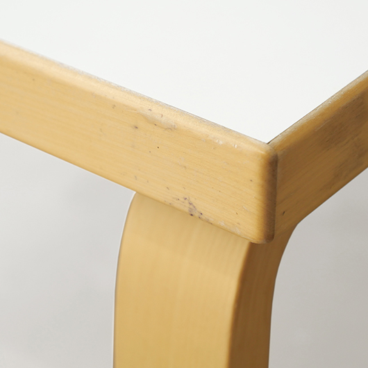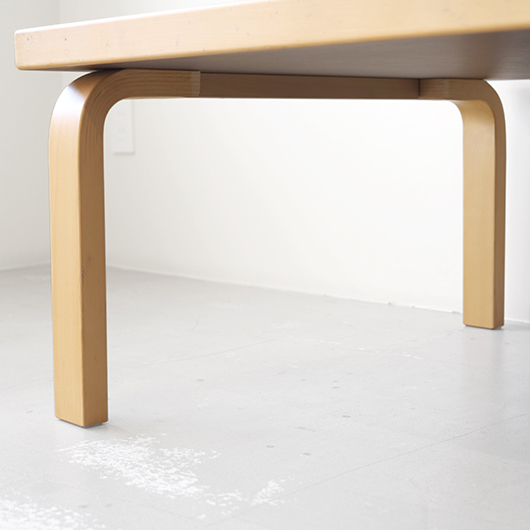 フィンランドの巨匠Alvar Aaltoが1933年にデザインしました、Artek社製ヴィンテージ スクエアテーブル81C。 無駄を削ぎ落としたデザインと木のぬくもりを合わせ持った、永年のロングセラー。天板は水濡れに強いホワイトラミネート仕様で、神経質にならずおおらかに使用できるため、小さなお子様のいるご家庭でも安心です。 脚部はフィンランドの伝統技法の挽き曲げ技法を応用したL-legアアルトレッグと呼ばれ、Artekのコンセプト(Art+Technologyの融合)のもとに出来上がった独自の技法。今回は前オーナーが脚部をカットして使用していたものを、床座りに適したサイズに整えました。現行品でも公式にて4種の高さの他にレッグカットの加工を承っており、それぞれのライフスタイルに合わせたお好みの高さでの使用も提案しているようで、このシリーズの汎用性の高さに驚かされます。 畳敷きの和室で使用してもミニマルなデザインのためスッと馴染んでくれます。またフローリングにカーペットを敷いた部屋に合わせる際は、周りを低めの家具で合わせると空間に広がりを感じられておすすめです。 丁寧にメンテナンスを施し、全体的に綺麗な状態です。天板に極小さなうちキズや側面や脚部などに僅かな経年感が見られますが、気にならない程度かと思います。そのほか細部の状態などは画像をご参照ください。