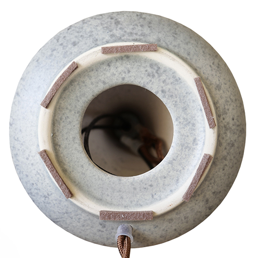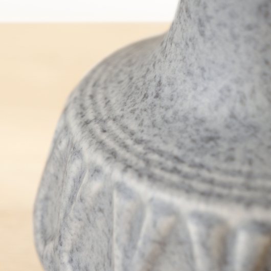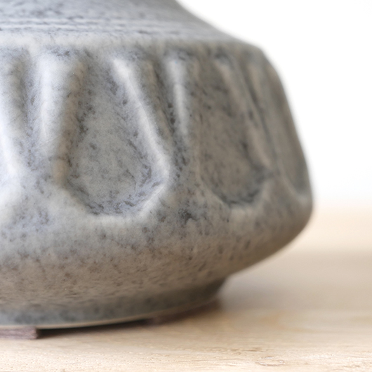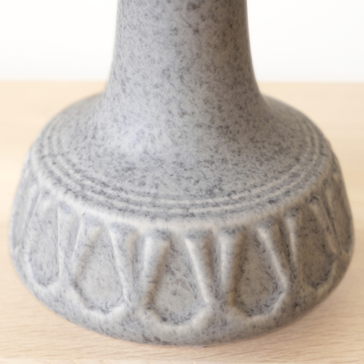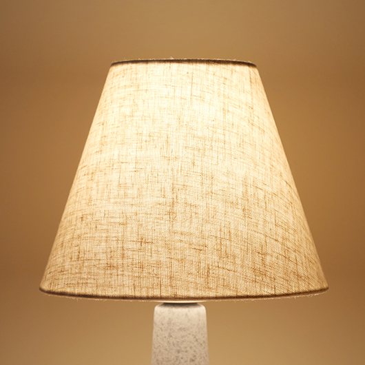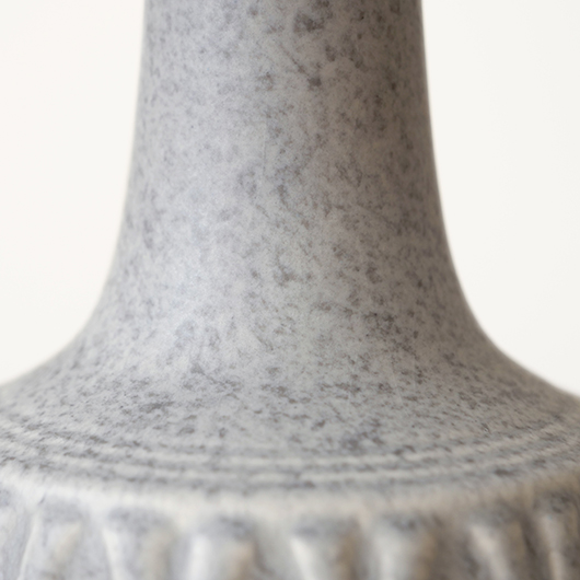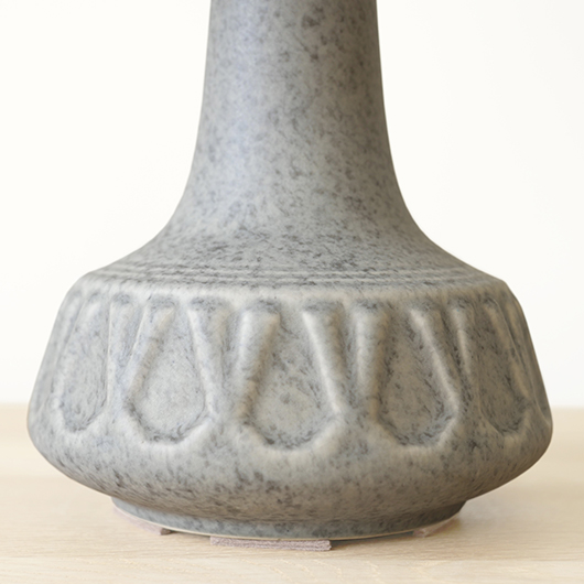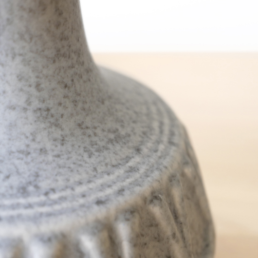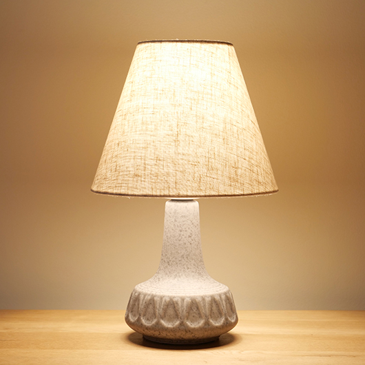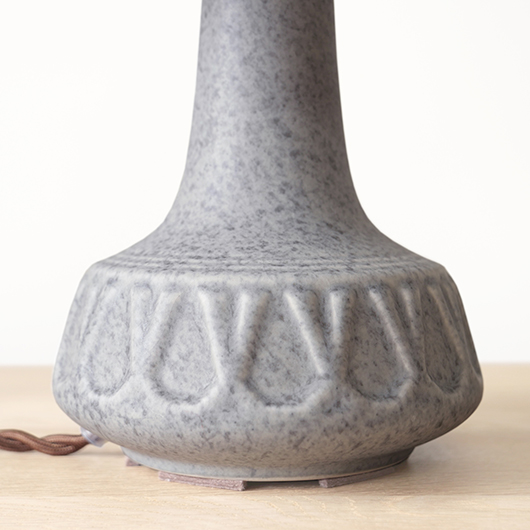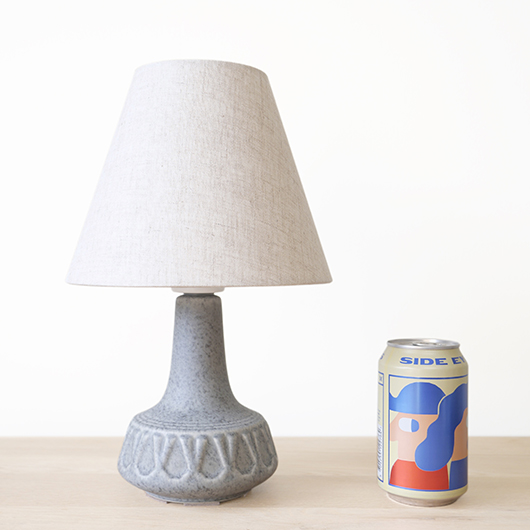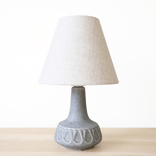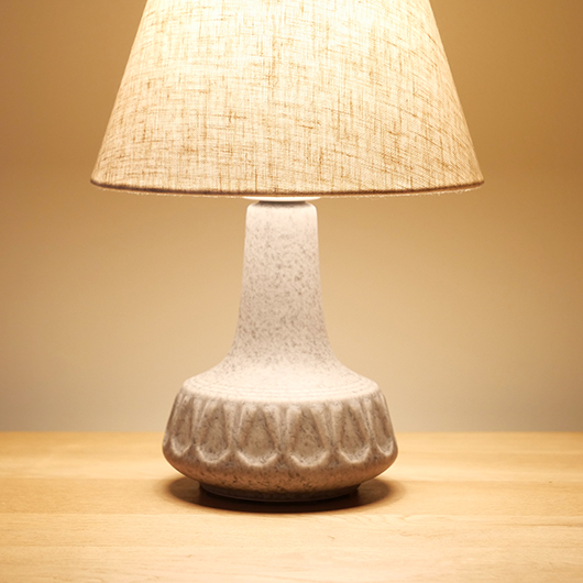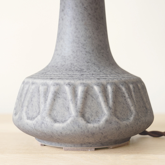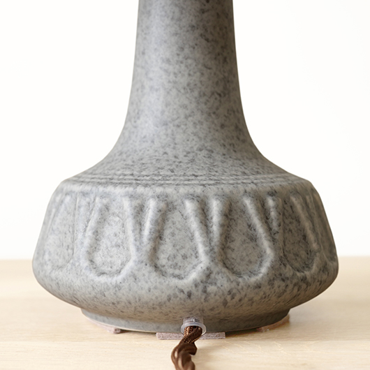 1835年にデンマークのボーンホルム島に窯を開いた、Soholm窯の陶製ベースを用いたヴィンテージ テーブルランプ。 エッジの効いたドロップ模様が連なり、甘くなりすぎない絶妙な幾何学模様が印象的です。そんな凹凸に合わせて釉薬の掛かり具合が変わることで味わいを深め、明かりを灯した際にも陰影を作り出してくれます。 和のテイストにも通じるようなペールグレーの釉薬で、ネップのあるファブリックのように濃い部分と薄い色味が複雑に混ざりあっています。 シェードは本体の形が美しく見えるように国内にてオーダーしたもので、明かりを灯すとニュアンスのあるリネン地の風合いがまた違った表情を作り出してくれます。新しく交換したコードなども、ヴィンテージの風合いに合うデザインをセレクトました。 電気工事士の資格を持つ職人によりソケット・配線・プラグ等の電気に関わる部分は全て交換しまして、電気用品安全法に基づいた点検なども行いPSEマークを表示しておりますので、新しいもの同様に安心してご使用いただけます(詳しくは下記をご覧ください)。 丁寧な修復を行いまして、綺麗な状態です(表面に見える貫入は陶土と釉薬の収縮率の違いにより現れるもので、ヒビではありません)。そのほか細部の状態などは、画像をご参照ください。