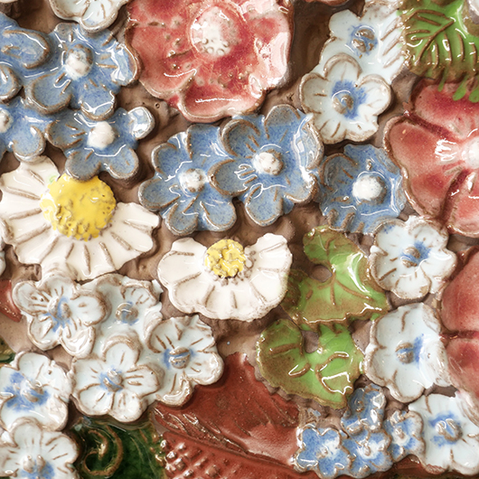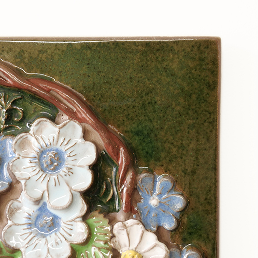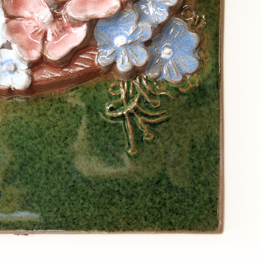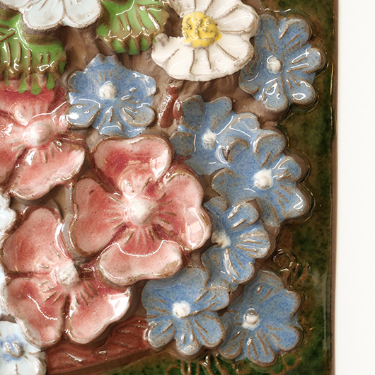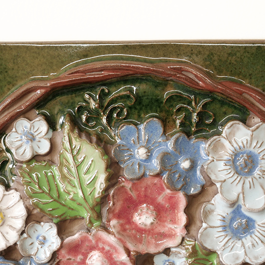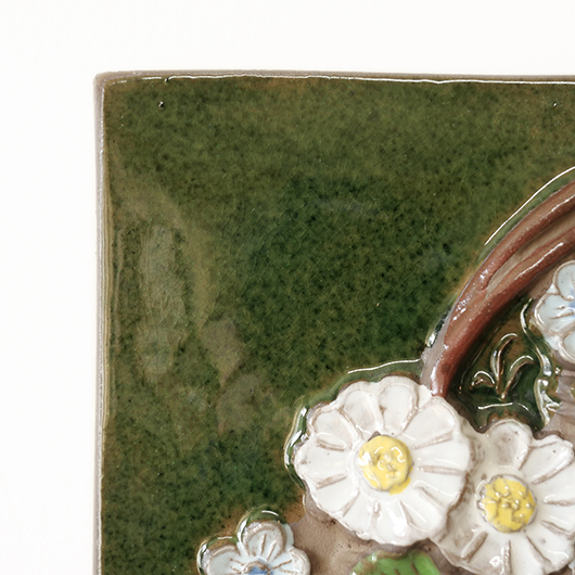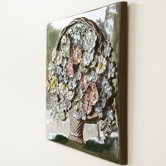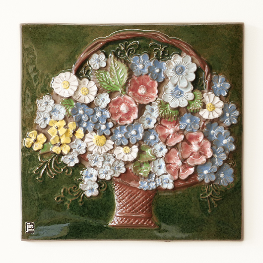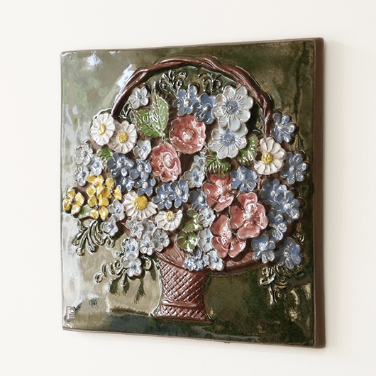1942年に開窯したスウェーデンのJie Gantofta窯で製作された、Aimo Nietosvuoriデザインのヴィンテージ陶板 "Flower Basket"。 端正に編まれたバスケットは開口部が広がっており、そこに溢れんばかりの花々が活けられています。マーガレットを中心に白、黄色、ピンク、スカイブルーと、様々な色味とサイズの花をうまくまとめ上げているのは流石のセンスです。また花々は立体的に重なり合っているため、横から見ると複雑な陰影を帯びます。 土台にはの艶のあるモスグリーンの釉薬が掛けられ、全体をグッと引き締めています。通常は20cm前後のものが多い中こちらは一辺30cmほどの大ぶりなサイズ感のため、とても見応えのある1枚です。 フックなどに引っ掛けて壁掛け飾りとして、または皿立てなどを用いるとチェストなどの天板に置くことも可能です。リビングや玄関などにさっと飾るだけで周りを華やかにしてくれ、季節を問わずにオールシーズンお楽しみいただけます。 目立ったチップなど見られず、全体として綺麗な状態です。そのほか細部の状態などは、画像をご参照ください。