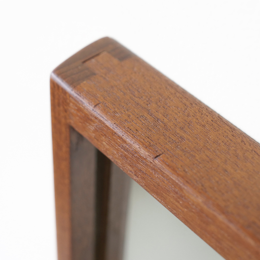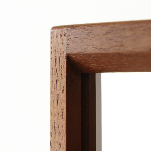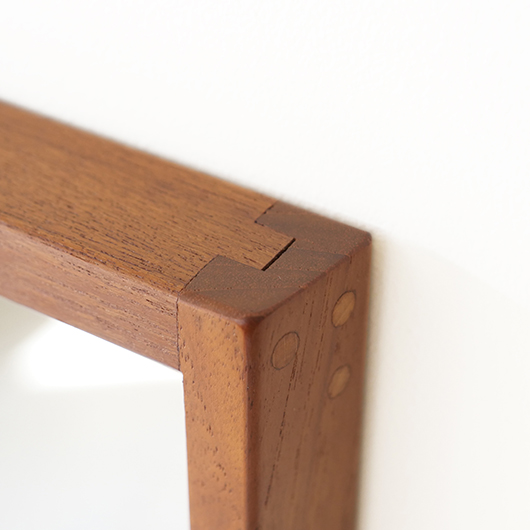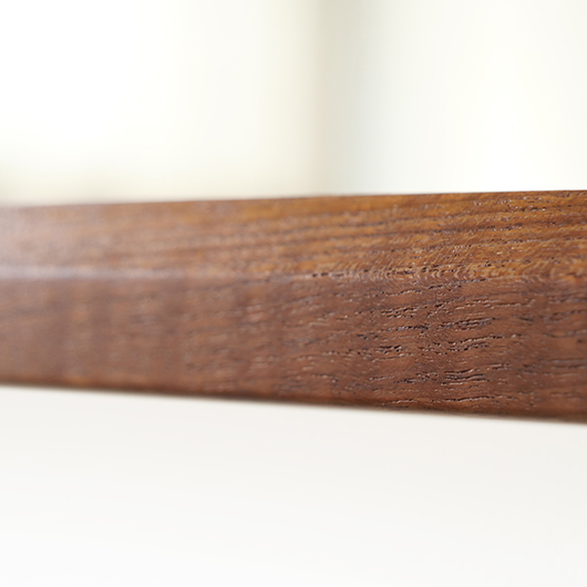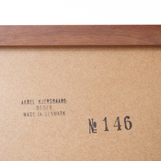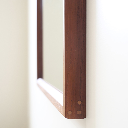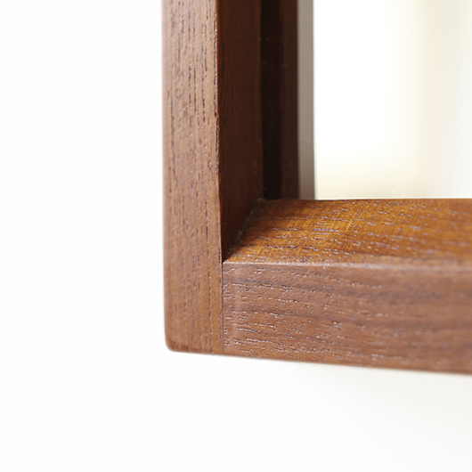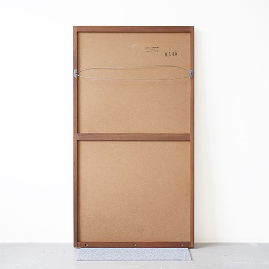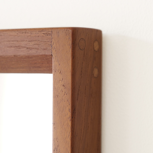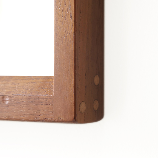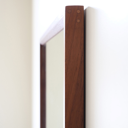 デンマークを代表するデザイナーのひとりKai Kristiansenのデザインによる、1960年代Aksel Kjersgaard製のヴィンテージ壁掛けミラーmodel 146。 厚みのあるチーク無垢材を贅沢に使用し、角を落としたやわらかなフレームが印象的です。このモダンなデザインのポイントとなっているのはそのジョイント部分、3つの木ダボがフレーム側面の上下に並んでいます。 1952年に自身の工房を興し、主に玄関周りの小家具を作るところからスタートしたAksel Kjersgaard、その中でも鏡はサイズのバリエーションが豊富で、職人の高い技術により質の高い多くの作品が発表されてきました。そのなかでもこの大きさのミラーは現地でもなかなか見かけないサイズの一つです。 高さ1mを超える大きさで、姿見としてご使用いただける十分なサイズです。壁にかけることでゆったりと全身が映ります。寝室やリビングルームなど、普遍的なデザインで様々な場所でお使いいただけます。壁にかけるだけで空間を広く見せる効果があるため、一般のご家庭だけでなく、カフェやレストランの壁面にもいかがでしょうか。 丁寧な修復を行いまして、全体的に綺麗な状態です。鏡面は新しいものに交換しておりますので、新品同様の使い心地です。そのほか細部の状態などは、画像をご参照ください。