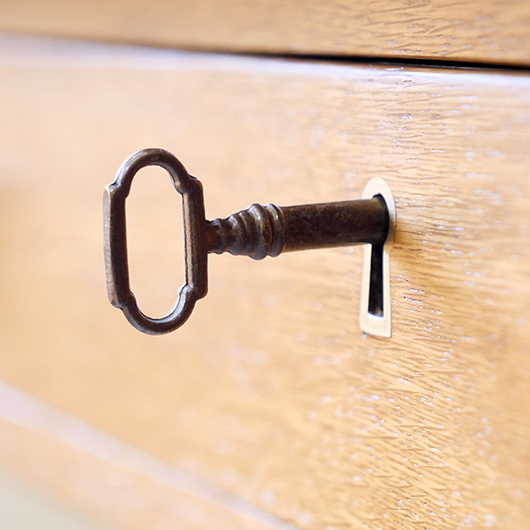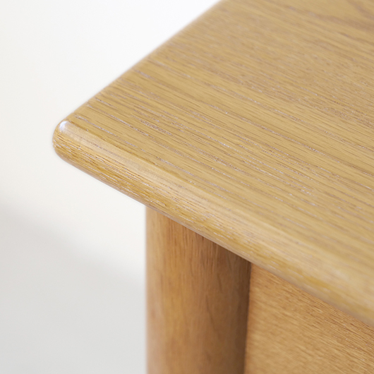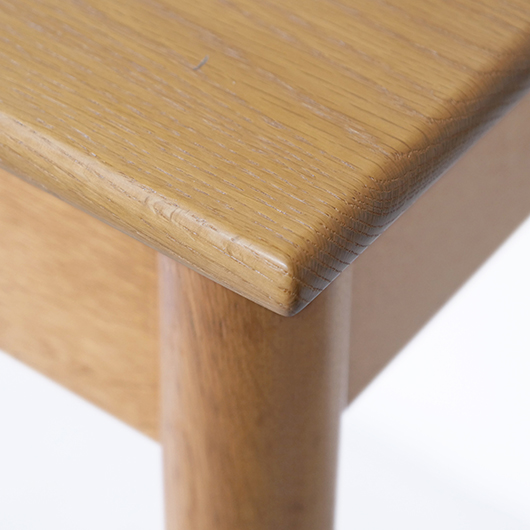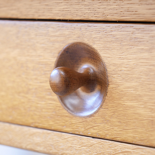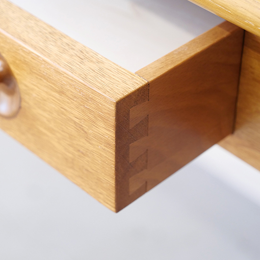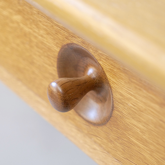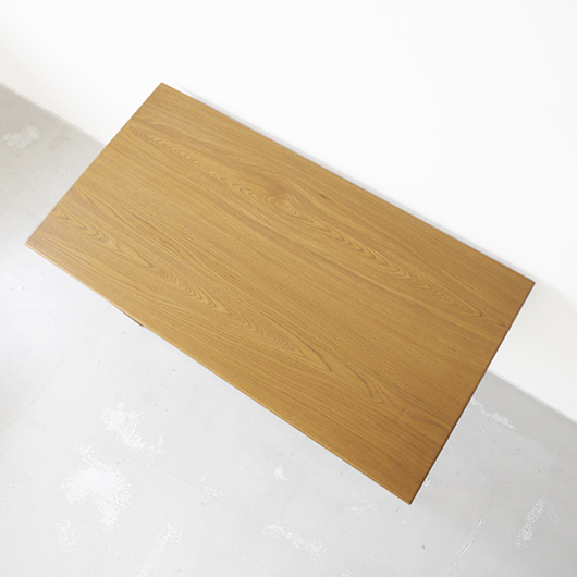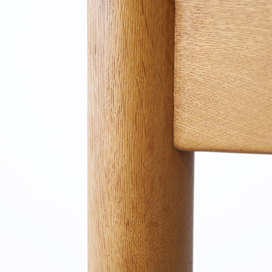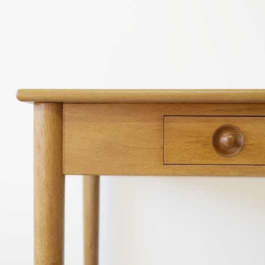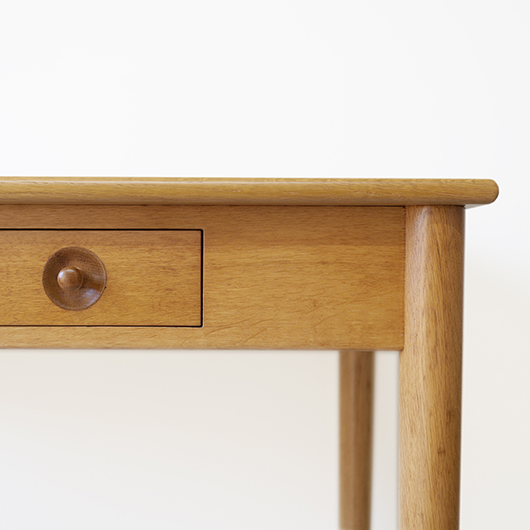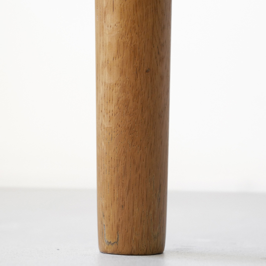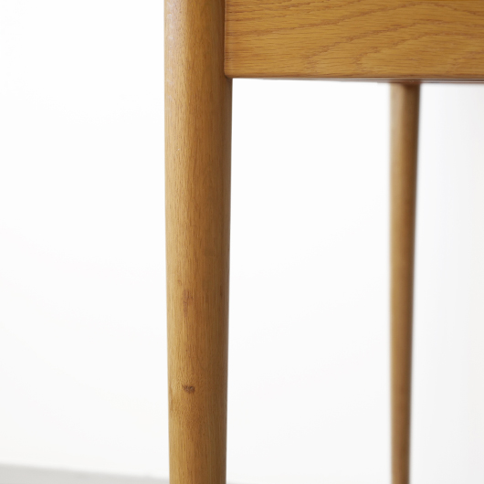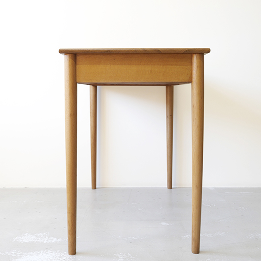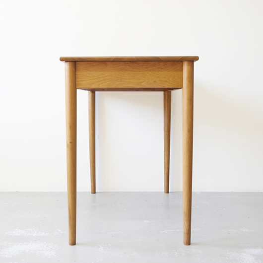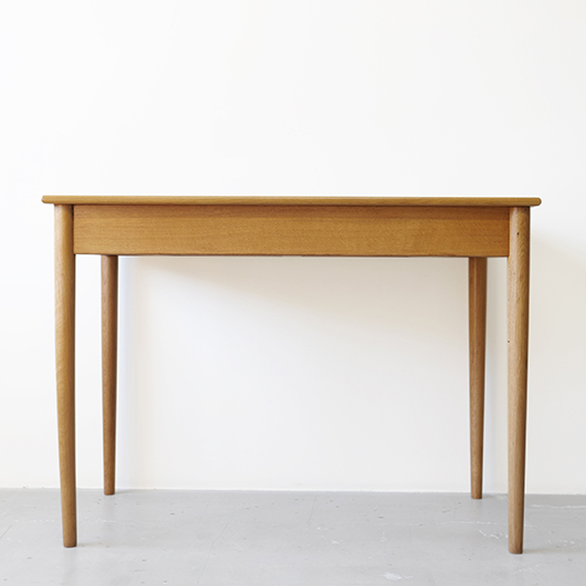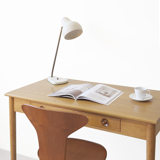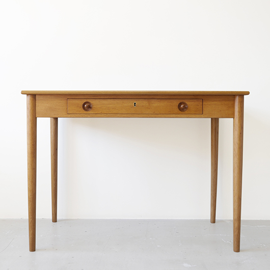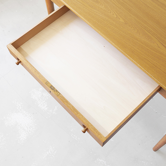 デンマークを代表するデザイナーHans J. Wegnerが1955年にデザインしました、RY Mobler製のヴィンテージ デスクRY32。 天板の下に引き出しを備えた非常にシンプルな構造のデスクで、当時のデンマークの機能主義的な考えのもとモダンで使い勝手の良い作りのものです。そこにウェグナーらしい表情を与えているのが引出しの取っ手で、丸くくり抜かれた円の中心に付けられたオーク無垢材の削り出しによる有機的なフォルムが印象的です。つまみやすいのはもちろん、シンプルなデスクのアクセントとして効いています。引き出しには雰囲気のある鍵が付属しており施錠可能です。 またウェグナーのチェアによく見られる先に向かうにつれて細くなっていくテーパードレッグは、脚部の長いデスクではよりプロポーションの良さにつながっているようです。 幅100cmとコンパクトなサイズ感で名前も”Lady's writing Desk"とされるのは、より大きな幅136cmプラス2枚のエクステンション板を備えたデスクAT305を同年に発表しているため。最大幅は2mをゆうに超えるAT305に重厚感を感じるのに対し、このRY32はオーク材が用いられていることもありすっきりと軽妙な印象を受けます。 余計なものを削ぎ落としたデザインに置く場所を選ばないサイズ感のため、書斎はもちろん寝室やリビングの一角などにもスッと馴染むことと思います。広い天板でパソコンをしたりと効率的に作業ができそうです。 全体を丁寧にフルサンディングをした後に再塗装を行い、自然な艶の美しい仕上がりとなりました。全体として非常に綺麗な状態です。引出の底板も新しく交換しております。向かって右奥の脚に若干の反りが見られますが、ぐらつきなどなく構造上の問題もありません。そのほか細部の状態などは、画像をご参照ください。