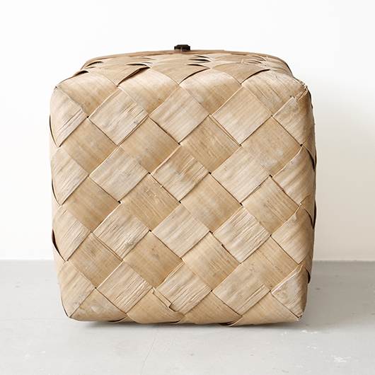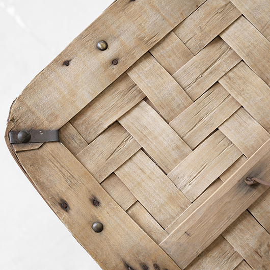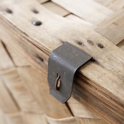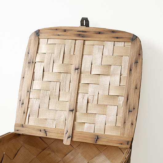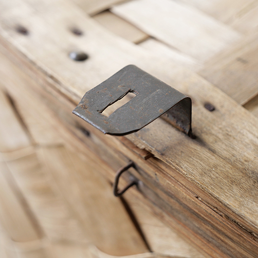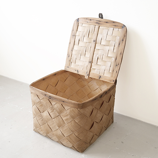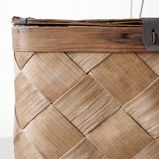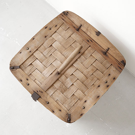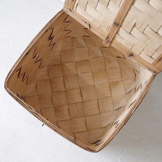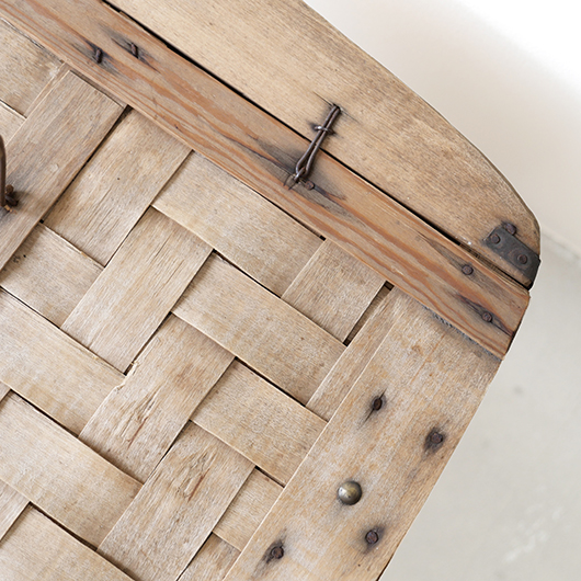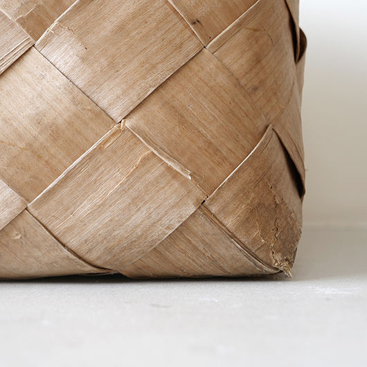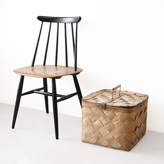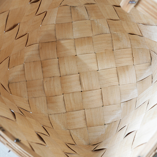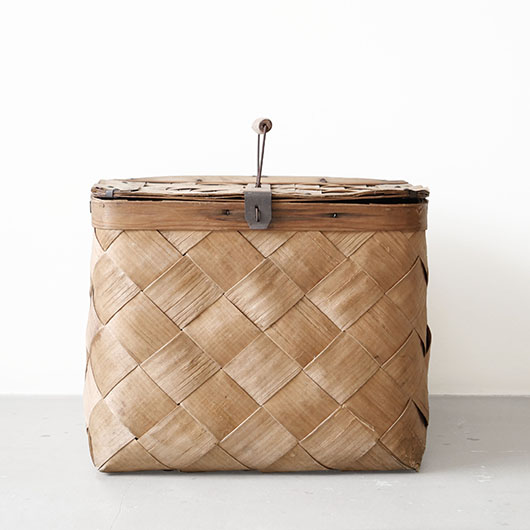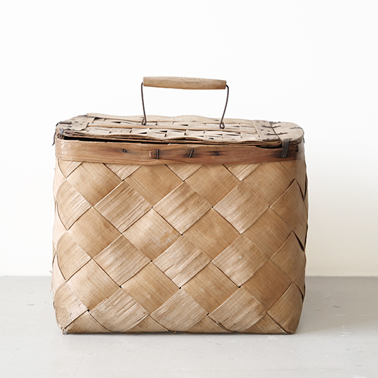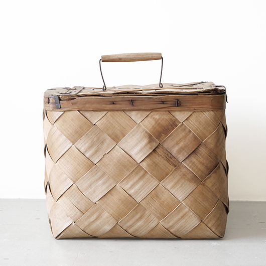 スウェーデン・ダーラナ地方で生まれた伝統手工芸品、ヴィンテージ バスケットSpånkorg。 北欧のパイン材を職人が薄く削いで作ったへぎ板(=Spån)を斜めに編んだバスケットで、蓋が備えられ取っ手も付いています。側面は斜めに編んだダイヤ模様でリズミカルに、蓋部分は長方形になるよう編み方を変えるなど職人の工夫を感じる部分です。蓋の中心についたハンドルはパタンと倒すことができます。 経年によって飴色に変化した木肌は、新品の白みの強いのものとは同じ樹種と思えないほど。味わい深く経年変化した木肌からは、年輪に合わせてナイフで薄く削いでゆく職人の手仕事を感じます。 リビングに置いて読みかけの雑誌や新聞を入れたり、玄関ではスリッパ入れとして、キッチンでグローサリー収納と様々な用途で活躍してくれます。置くだけで絵になるバスケットで雰囲気よく生活感を消してくれるインテリアとしていかがでしょうか。 丁寧にクリーニングを施しまして全体的に綺麗な状態を保っております。下方エッジの割れや一部に変色など見られますが、気になる程ではなくヴィンテージの味わいを感じるものです。メンテナンス時には丸洗いもしております。そのほか細部の状態などは、画像をご参照ください。