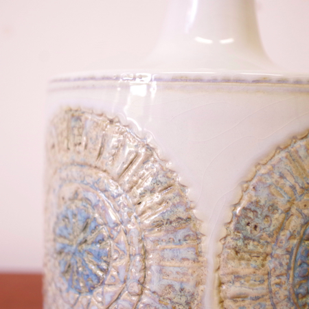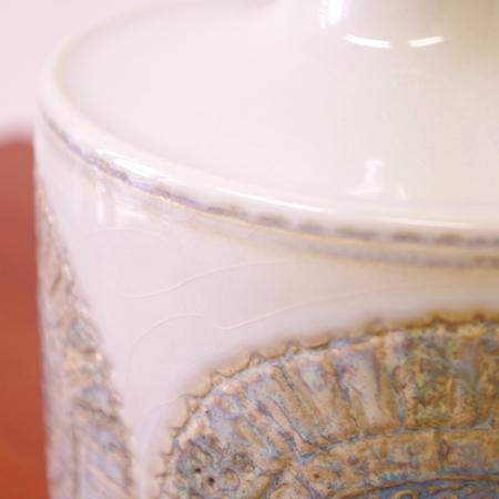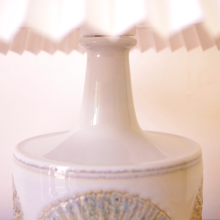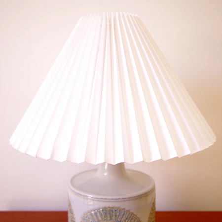 Royal Copenhagen(ロイヤルコペンハーゲン)Teneraシリーズをベースに使用しました、デンマークの照明メーカーFog & Morup社のテーブルランプで、1969年〜1974年に製作されたものです。 現在のロイヤルコペンハーゲンには見られない表情豊かな色合いは、ファイアンス窯により作り出されたヴィンテージならではのもの。ペールトーンの優しい色合いのフラワーモチーフは、カリ・クリステンセンによる女性らしいやわらかなデザインです。 シェードはデンマーク製の新しい物に交換致しました。規則正しいプリーツが、明かりを灯した時に格別の表情を見せてくれます。また電気用品安全法に基づきPSEマークを表示しておりますので、安心してご使用いただけます(詳しくは下記をご覧ください)。 ファイアンス窯の照明の中でも市場であまり見かけない希少な品です。