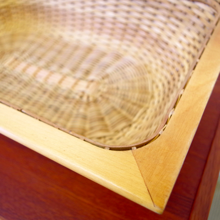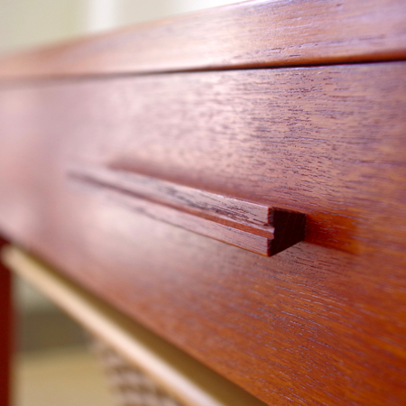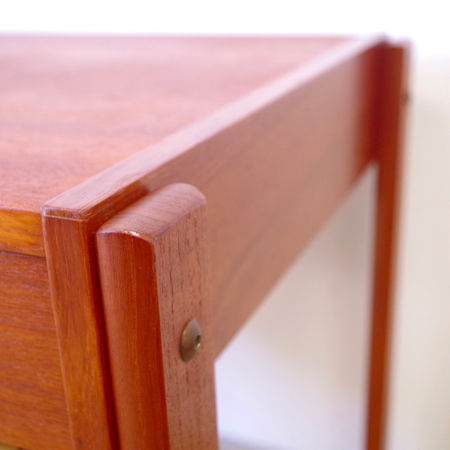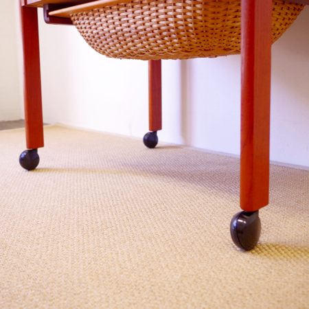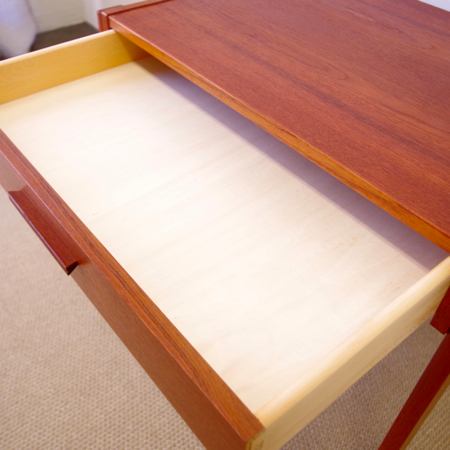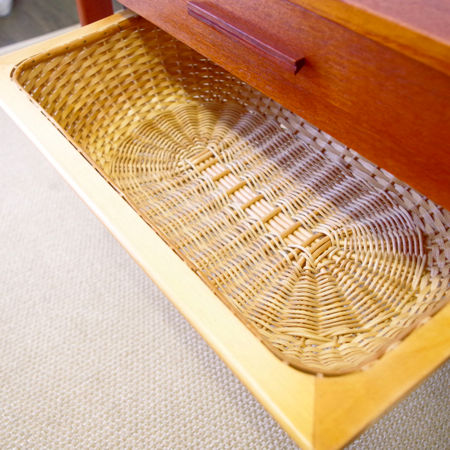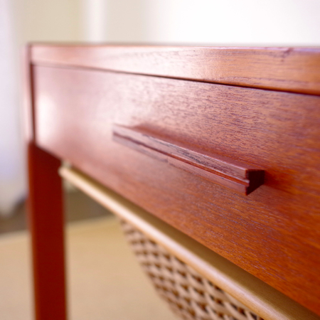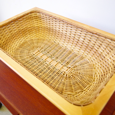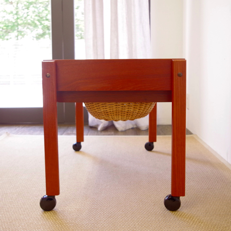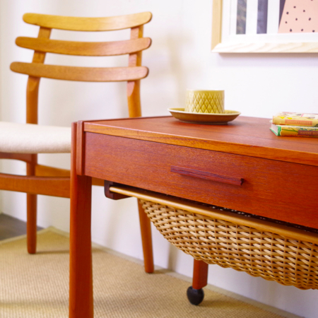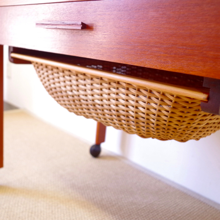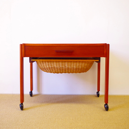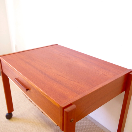 1960年代デンマーク製のヴィンテージ ソーイングテーブルです。 シンプルなデザインながら、籐かごが柔らかな雰囲気を作り出しています。素材はチーク材で、脚部は贅沢にも無垢材が用いられております。引出しの中は仕切りがないタイプですので、文具などと一緒にノートや郵便物などの紙ものの収納にも向いています。また引出しが上開きではなく横開きのため、天板に本やコーヒーカップを置いたりと、サイドテーブルとしてのご使用もおすすめです。キャスターもスムーズで、ソファの前に動かしてノートパソコンなどの作業にも良さそうです。 引出しの底板は新規交換済みで、清潔にお使いいただけます。僅かな小キズなどがございますが、全体的に綺麗な状態です。