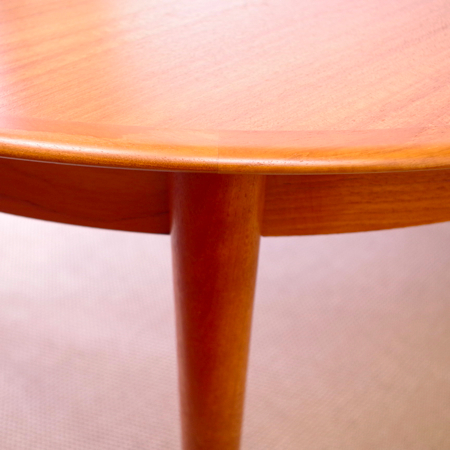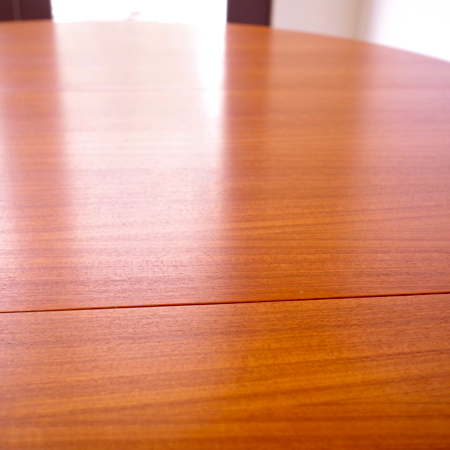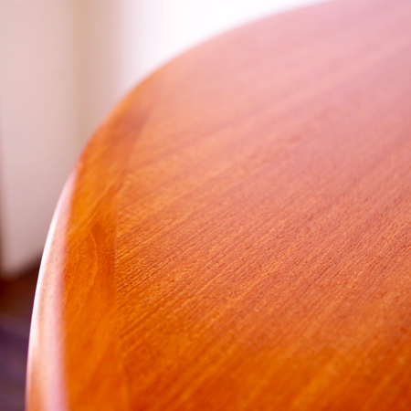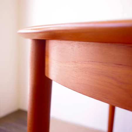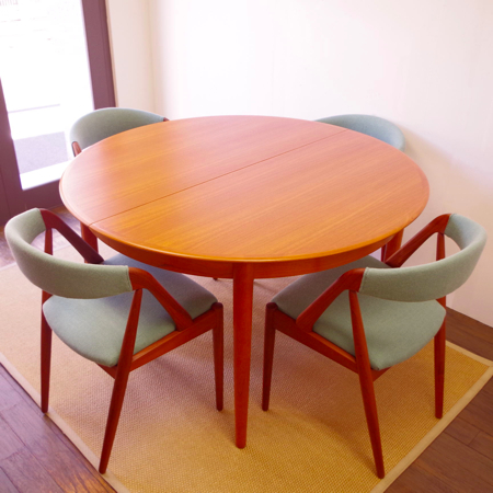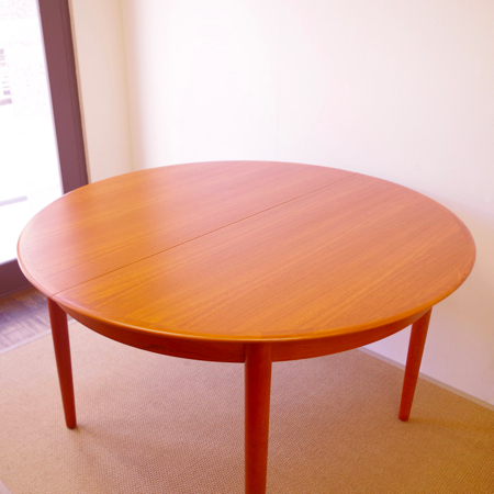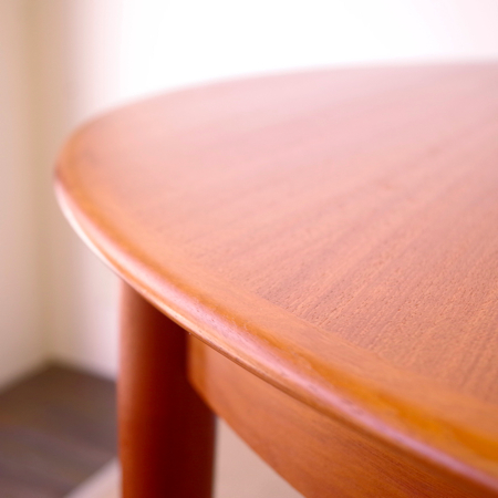 SKOVBY MOBELFABRIK社が製造しましたヴィンテージラウンドテーブルです。 天板エッジは無垢材にテーパー(先細りの形状)をつけており、美しくそして肘の掛かりが良い仕上げです。一見シャープなデザインながら、角には丸みをもたせて、全体に柔らかみをプラスしております。 通常は円形4人掛けのダイニングテーブルとして、ダイニングチェアがすっぽりと収まります。またエクステンション(伸張)板を入れますと、6人掛けのオバール型へと変わります。 フルサンディングを行った後、再塗装を行いました。自然な艶のとても良い雰囲気に仕上がっています。多少の水濡れにも問題のない塗装を施しておりますので、小さなお子様のいるご家庭でも安心してご使用いただけます。 エクステンション板にごく僅かな小キズがございますが、全体的にとても綺麗な状態です。詳しくは画像にてご確認ください。