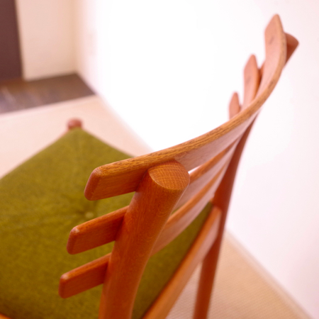 コロナチェアで有名なポール・M・ヴォルターがデザインしました、FDB Mobler社製のダイニングチェアです。 3枚に分かれた笠木(背もたれ)それぞれが、ゆるやかな曲線を描いており、背中にそっと寄り添うためにとても背当たりが心地良いです。 座面はフレームの凹みにクッションをはめ込む他に見ないデザインで、現地でもあまり見かけないモデルです。中心にあるくるみボタンと相まって、ほっこりとノスタルジックな雰囲気を作り出してくれます。 F.D.B. とは良質な家具を手頃な価格で市民に提供することを目的に掲げたデンマークの生協で、その家具部門のチーフとして初代ボーエ・モーエンセンの意思を継いで、ヴォルターが2代目として活躍しました。 飴色へと経年変化したオーク材のフレームも、とても美しく感じます。目立ったキズもなく、綺麗な状態です。 ※画像は張替え前となり、ご購入後に生地をお選びいただきます。詳細につきましては、下記の【張替代込みの商品について】をお読みください。 【在庫数:2脚】