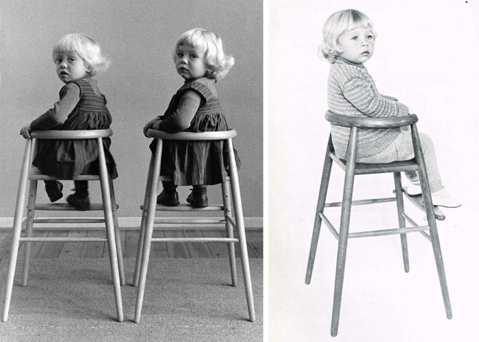 『mobilia No.54より』 当時の広告の画像がこちら。可愛らしい双子の女の子が、お行儀良く座っていますね。・・・双子!?そう、ナナ・ディッツェルご本人のお子さまたち、ヴィータ&ルルちゃんがイメージキャラクターとして登場しているのです。 日本で彼女の家具といえば、上から吊るす籐編みのスイングチェアが有名ですが、本国でも彼女の作品はとても人気が高く、イージーチェアやソファなどが高価な値段で取引されております。