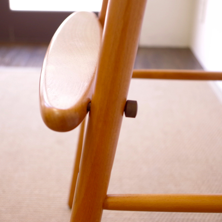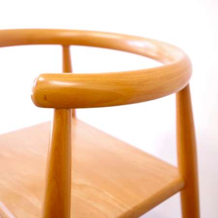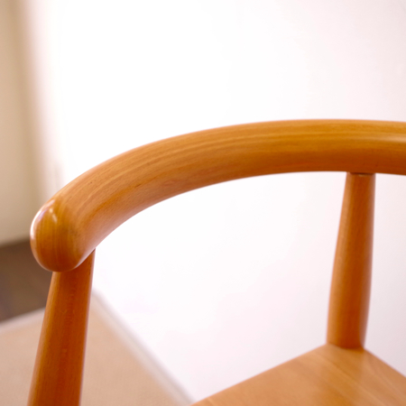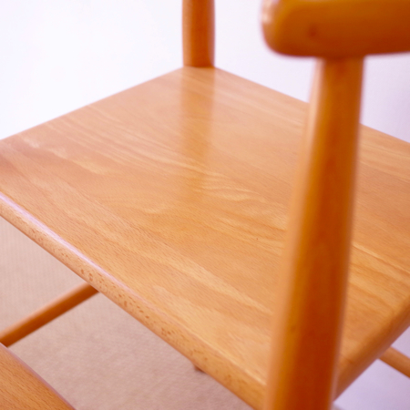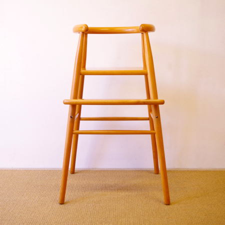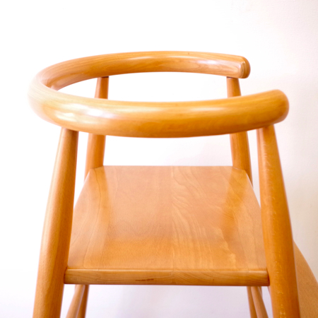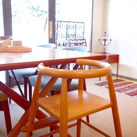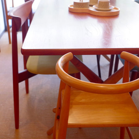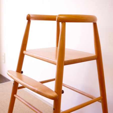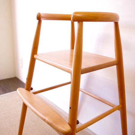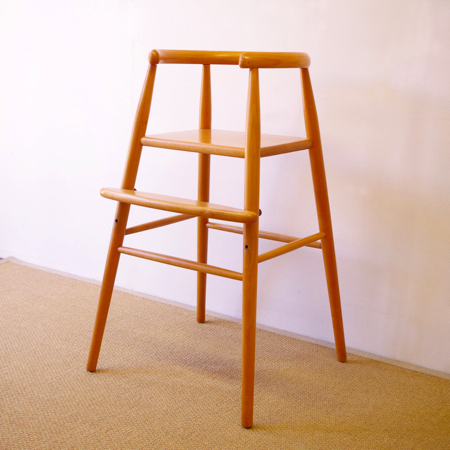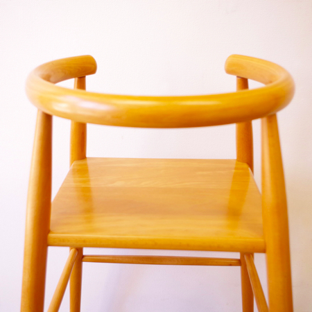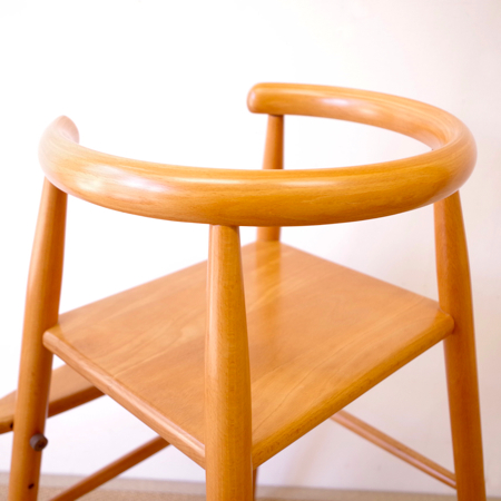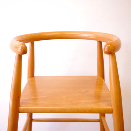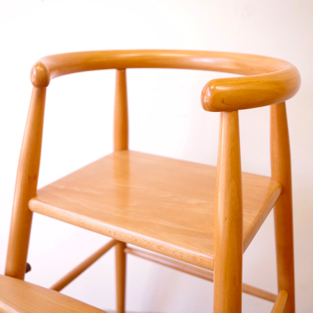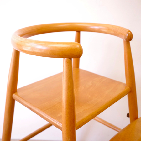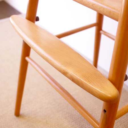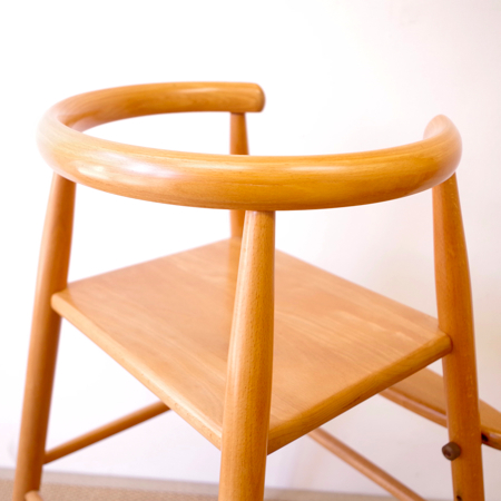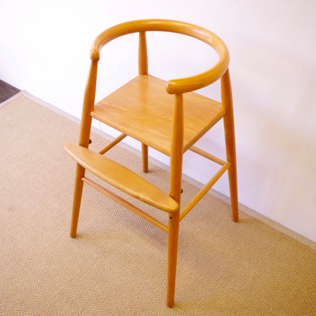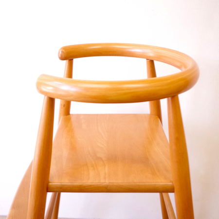 1955年にナナ&ヨルゲン・ディッツェルがデザインしました、Children's chair model.115です。 円形の笠木(背もたれ)に角を落としたフレームと、まあるく柔らかなフォルムでありながら、華美な装飾のないシンプルさで、他の家具ともスッと溶け込むようです。フットレストは2段階調節、そして取り外した状態でも使用可能と、成長に合わせてご使用いただけます。 デンマークを代表する女性デザイナーであるナナ・ディッツェルは、長女、続いて双子を出産したことで、子どものための家具も多数デザインしました。そんな中でもこのハイチェアは歴史に残る名作と言われており、人気も高く、デンマークKvist社などで復刻品が出されるほどでした。 小さなお子さまがご使用になるということで、より清潔に安心してお使いいただけるようにと考えて修復を行いました。フルサンディングを行い再塗装を施しましたので、見違えるほど綺麗に生まれ変わり、お手入れも簡単です。 現地でもまず見かけない、非常に希少なチェアです。