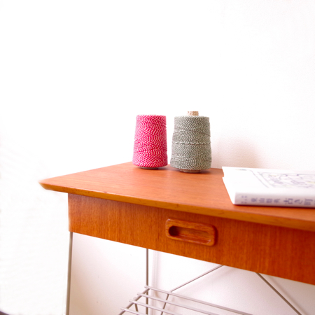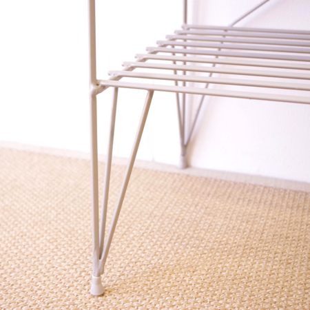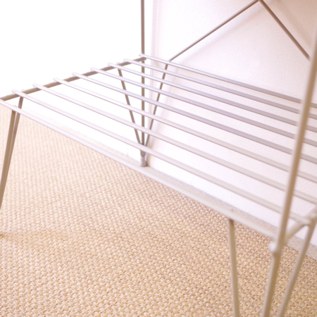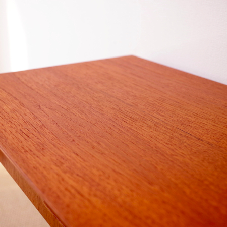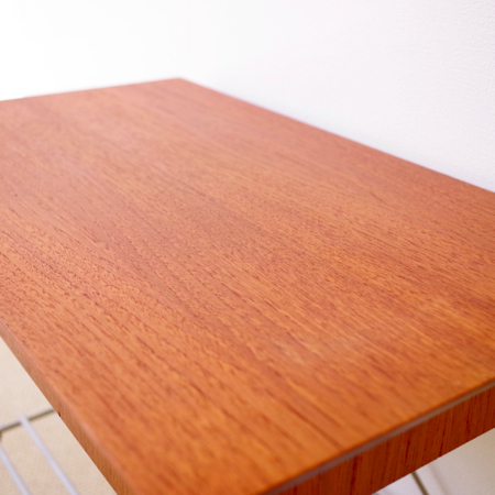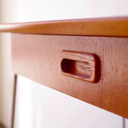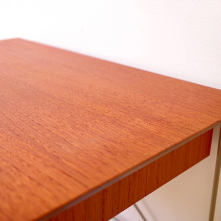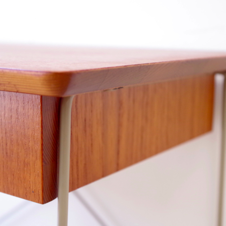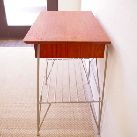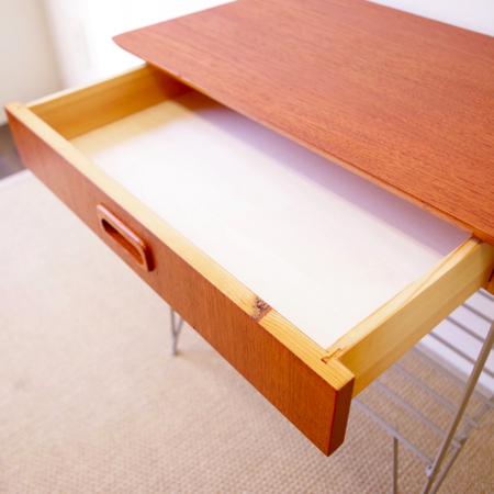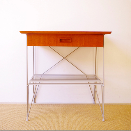 1960年代スウェーデン製の、ヴィンテージ サイドテーブルです。 ベビーグレーのやさしい色味のラバーコーティングが施された、脚部のデザインがとても印象的です。天板後方から伸びるクロス模様に、エッフェル塔を逆さにしたような脚部が、全体に軽快なリズムをもたらしています。 天板下には小引出し、さらに下方には棚が一段設けられており、ソファの脇やベッドサイドなど、一台あると何かと重宝してくれるかと思います。 丁寧な修復を行いまして、引出し内部の底板も新しく交換済のため、清潔にお使いいただけます。ごく僅かな小キズなどが見られますが、いずれも雰囲気を損ねるものではございません。全体的にとても綺麗な状態です。