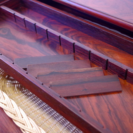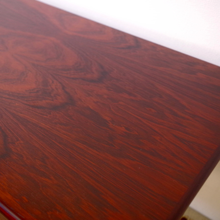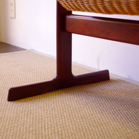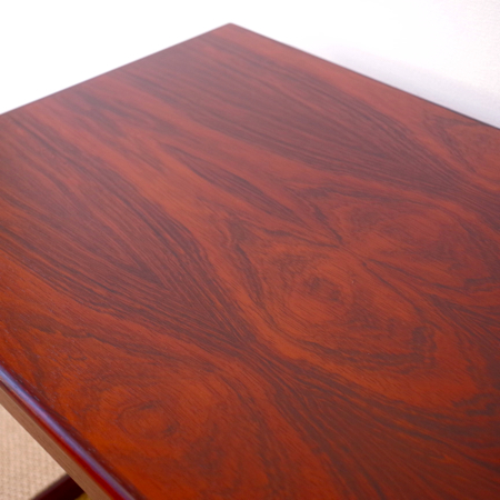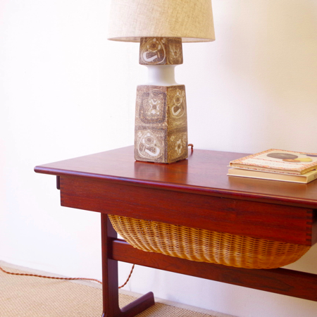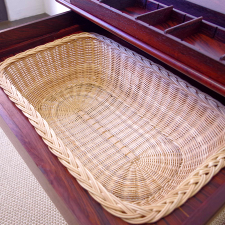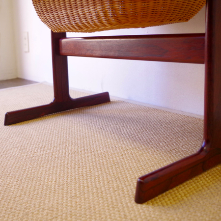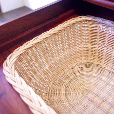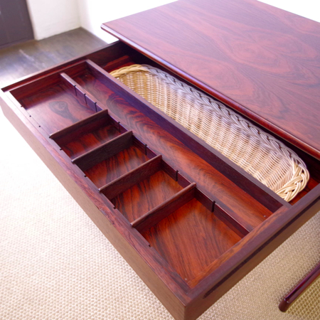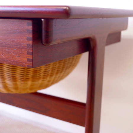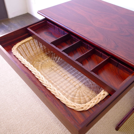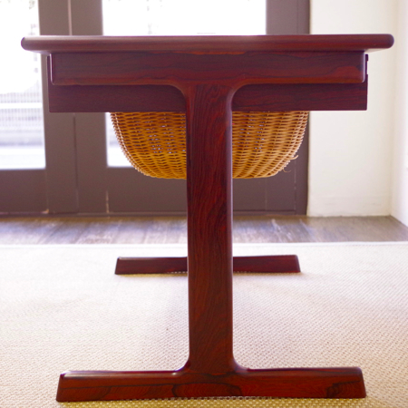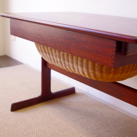 日本でも人気の高いデザイナーの一人であるカイ・クリスチャンセンがデザインしました、ヴィンテージ ソーイングテーブルです。 まず目を見張るのが天板の見事な杢目で、高級木材であるローズウッド材をブックマッチと呼ばれる左右対称に張り合わせる技法にて、その美しさを強調しているようです。 脚部、引出し、フレームなどに同素材の無垢材が贅沢に用いられています。引出しの接合部など細部を見るほどに、技術の高さが伺えます。 引出しの中は珍しいスライド式のトレーが付属しており、下側のラタンのカゴへと繋がっております。また細かな仕切り板がはすべて可動式ですので、入れるものに合わせて自在に変えることができるようになっております。元々は裁縫道具の収納家具ではありますが、サイドテーブルなどとして幅広くお使いいただけるかと思います。 しっかりとしたメンテナンスを施しまして、目立ったキズのない大変綺麗な状態です。
