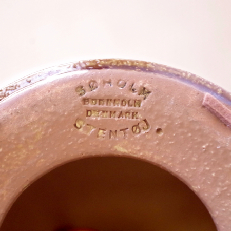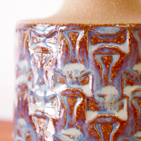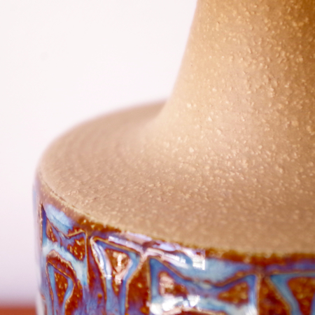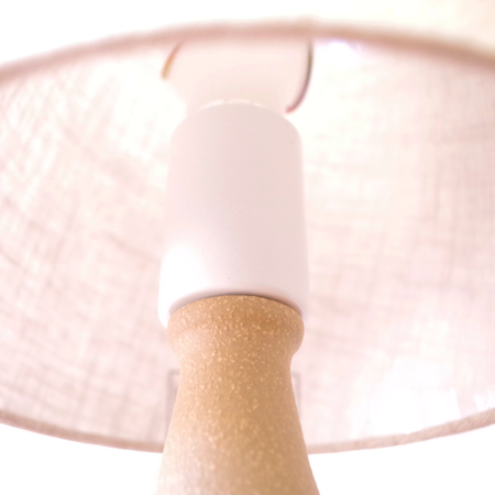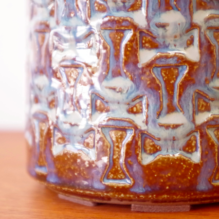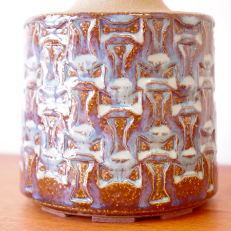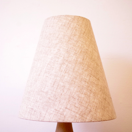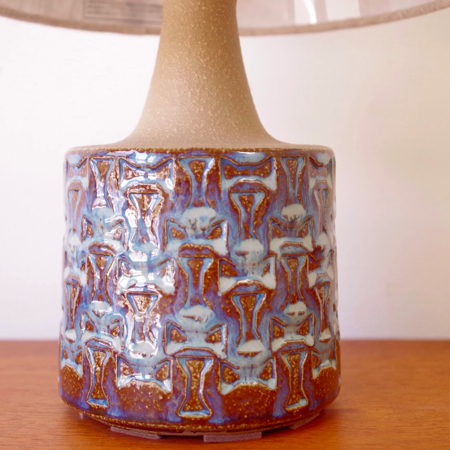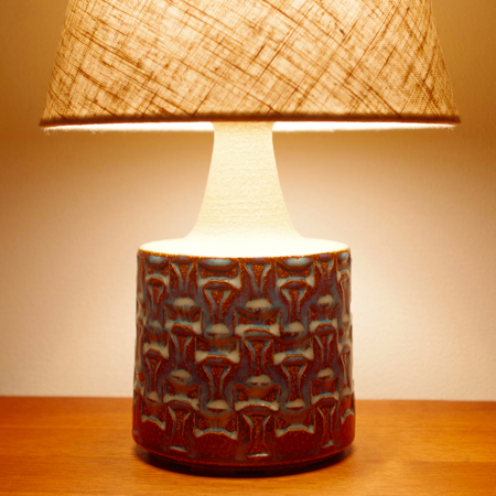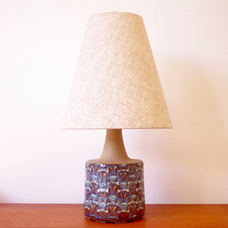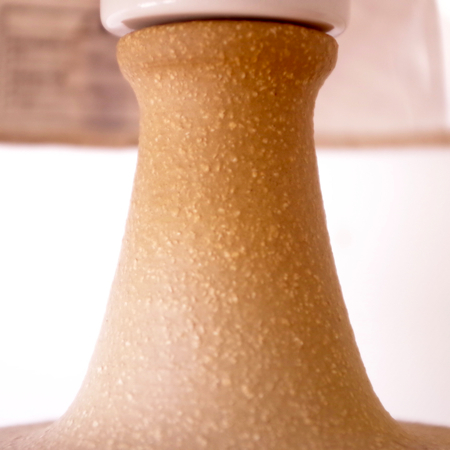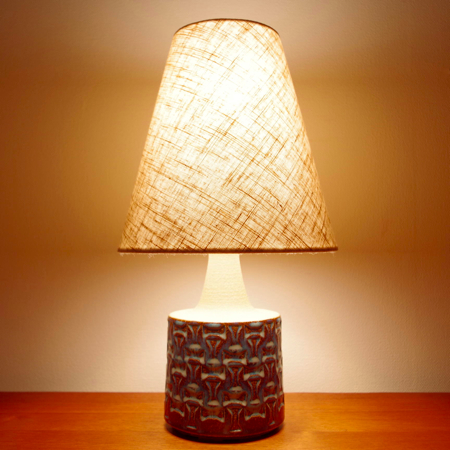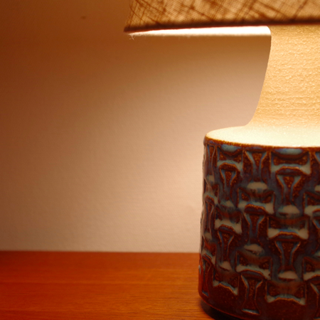 1835年にデンマークのボーンホルム島に窯を開いた、Soholm窯の陶製ベースを用いたヴィンテージ テーブルランプです。 ブラウンの上からアイスブルーの釉薬を重ねて掛けたことで、幾何学模様の凹凸に沿って色のグラデーションがはっきりと浮かび上がっています。また上部は素地のままで、陶器としても様々な表情を見せてくれます。明かりを灯すとぐっと落ち着いた雰囲気となり、どの時間帯でもインテリアとして目を惹く一灯です。 シェードは本体の形が美しく見えるように国内にてオーダーしたリネン地のものです。新しく交換したコードなども、ヴィンテージの風合いに合うデザインをセレクトました。 電気工事士の資格を持つ職人によりソケット・コード・プラグ等の電気に関わる部分は全て交換し、電気用品安全法に基づいた点検なども行いPSEマークを表示しておりますので、新しいもの同様に安心してご使用いただけます(詳しくは下記をご覧ください)。