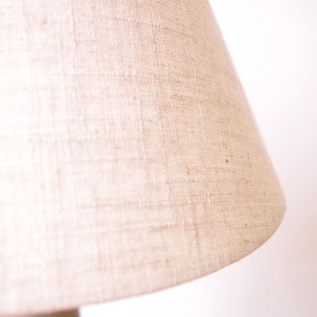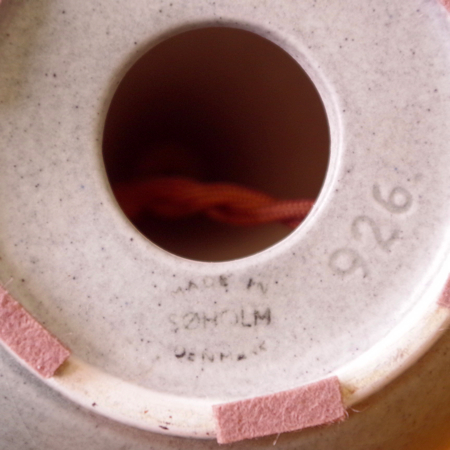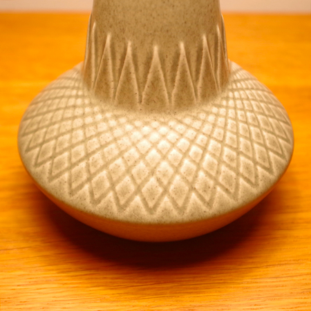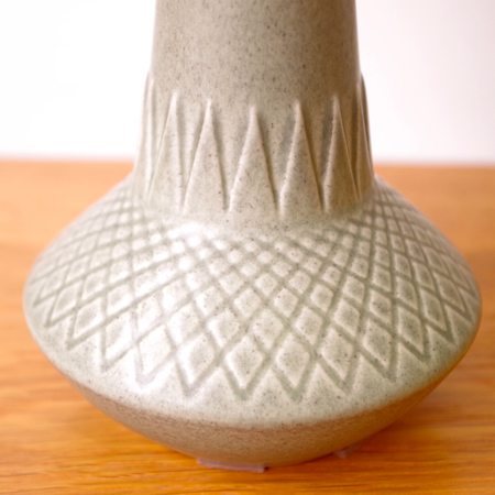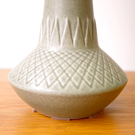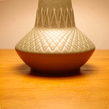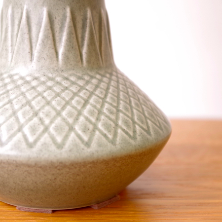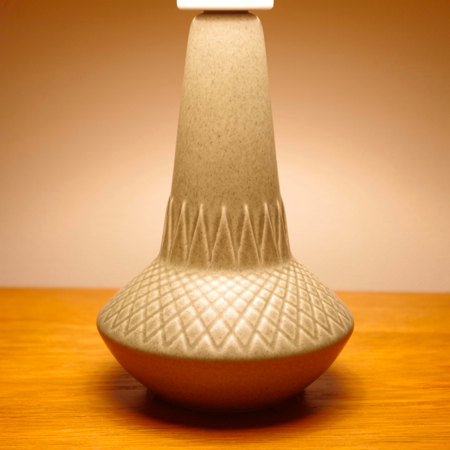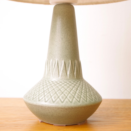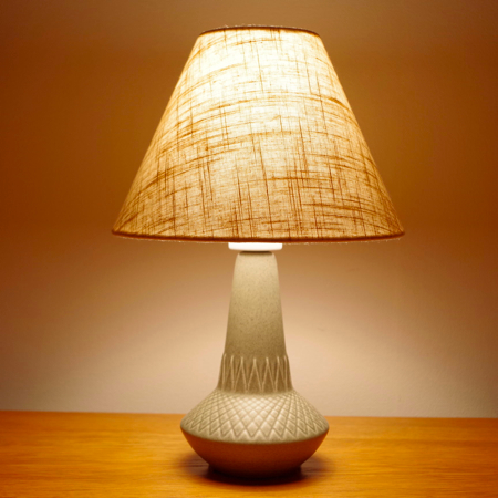 1835年にデンマークのボーンホルム島に窯を開いた、Soholm窯の陶製ベースを用いたヴィンテージ テーブルランプです。 ダイヤを膨らませたような曲線のラインのベースには、すっきりとした幾何学模様が刻まれております。和のテイストにも通じるようなミントグリーンの釉薬は、きりりとした青の釉薬を得意とするこの窯の作品の中ではとりわけ珍しい色合いです。ほっこりとした雰囲気は、お部屋の程よいアクセントになるのではないでしょうか。 シェードは本体の形が美しく見えるように国内にてオーダーしたもので、明かりを灯すとスラブ地の織りの風合いがまた違った表情を作り出してくれます。新しく交換したコードなども、ヴィンテージの風合いに合うデザインをセレクトました。 電気工事士の資格を持つ職人によりソケット・コード・プラグ等の電気に関わる部分は全て交換しまして、電気用品安全法に基づいた点検なども行いPSEマークを表示しておりますので、新しいもの同様に安心してご使用いただけます(詳しくは下記をご覧ください)。