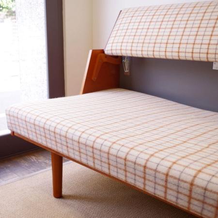 ハンス・J・ウェグナーが1954年にデザインしました、現在もGETAMA社のラインナップに残るヴィンテージ デイベッドGE6(258)です。 通常はソファとして使用し、背もたれ部分をスライドさせるとベッドとしてもお使いいただけます。1899年にベッドマットレス製造から始まったGETAMA社ゆえに、普遍的なデザインの美しさはもちろん、その使い心地や耐久性も折り紙付きです。スライドさせた内部にはブランケットや枕などをすっきりと収納することができ、急な来客時などにもスマートに対応いただけるのではないでしょうか。こちらは初期の丸脚タイプとなり、その中でも希少なチーク材を用いております。 丁寧な仕上げを施しまして、全体的にとても綺麗な状態です。サンディングで落としきれなかった小キズなどがございますが、まず気にならない程度です。詳しくは画像にてご確認ください。 ※画像は張替え前となり、ご購入後に生地をお選びいただきます。張替え時には、内部ウレタン交換、スプリング調整なども合わせて行います。ファブリックによって雰囲気はガラリと変わりますので、セミオーダーにてお好みの1台を作ってみてはいかがでしょうか。