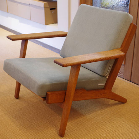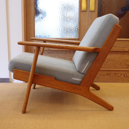 1953年発表 Hans J.Wegner デザインで現在もGetama社のラインナップに残る、大変人気のあるソファ「GE290」の1人掛です。 ファブリックはイギリス製の輸入生地に張り替え、内部のウレタンも調整済みです。肌触りの良い優しい空色の生地が、オークのフレームにとてもよく合っています。 全体的に目立った傷もなく、綺麗な状態です。