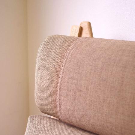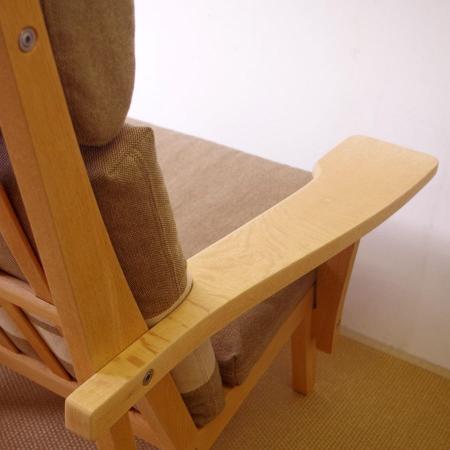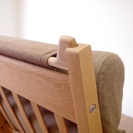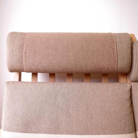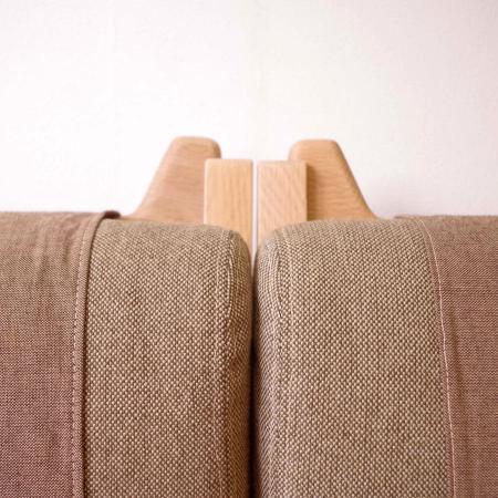 1969年発表ハンス・J・ウェグナーのデザインによる、現在もGetama社のラインナップに残る名作ソファGE375です。 座の延長が後脚になるウェグナーの得意とする構造で、背と座の角度が深いためゆったりと身体を預けることができます。また水平に付けられたアームの先が広くなっているため、コーヒーカップなどを置いて読書をしても素敵です。中央の連結金具を外すだけで簡単にセパレートしますので、2人掛ソファにアームなしの1人掛というスタイルでの使用も可能になります。 後ろから見たプロポーションも美しく、背面を隠さないコーディネートもおすすめです。木取りも良く見所ある杢目が随所に見られ、特にアームの虎斑はヴィンテージのオーク材らしさを味わえる箇所です。 フレーム全体を丁寧に研磨し、目立ったキズもなくとても綺麗な状態です。詳しくは画像にてご確認ください。