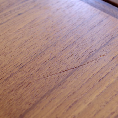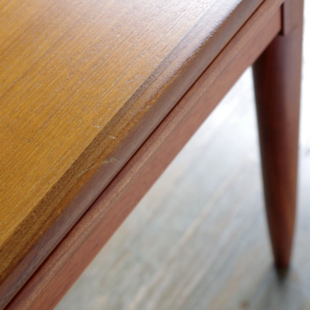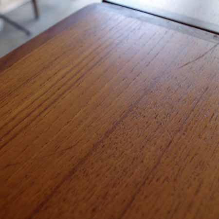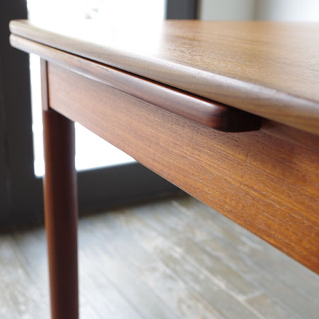 カイ・クリスチャンセンのデザインによるダイニングテーブルです。天板エッジと脚部にウォールナットの無垢が使われていまして、チークとの色のコンビネーションが美しいテーブルです。 エクステンション(伸長板)が2枚付いておりまして、最大片側4人の計8人も座ることができます。天板を下からすっと引き出すだけですので、女性1人でも大丈夫です。 仕上げはごく薄いラッカー仕上げで、一般的なラッカー仕上げのようなテカテカとした艶は出さず、オイル仕上げよりも水に強くなっております。 よく見ると小傷や薄らとした輪じみが確認できますが、全体的にとても綺麗な状態です。小傷等は画像にてご確認下さい。